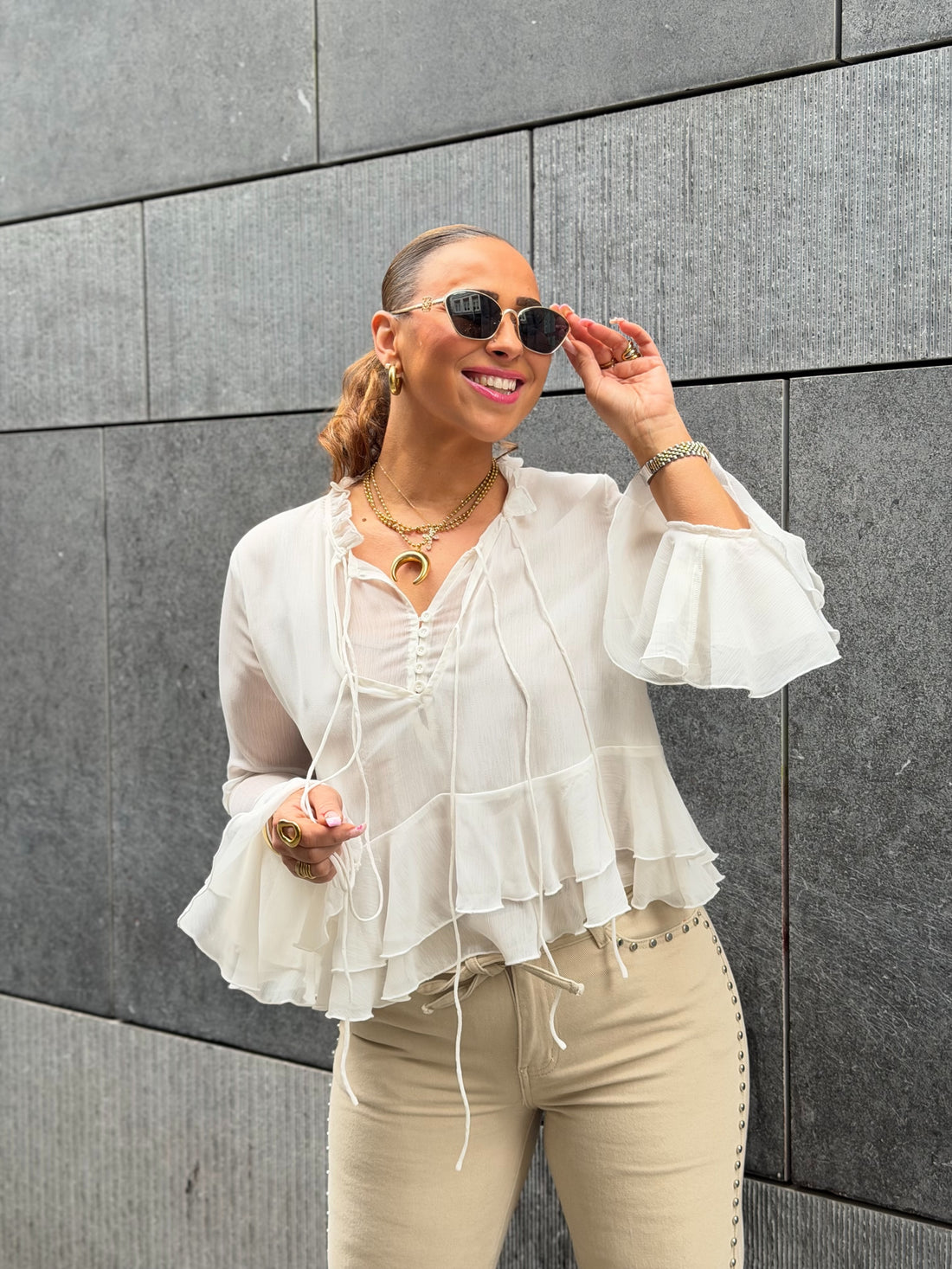 Prachtige transpirante bloes met rouches. Super leuk te combineren op een jeans of een rokje....
