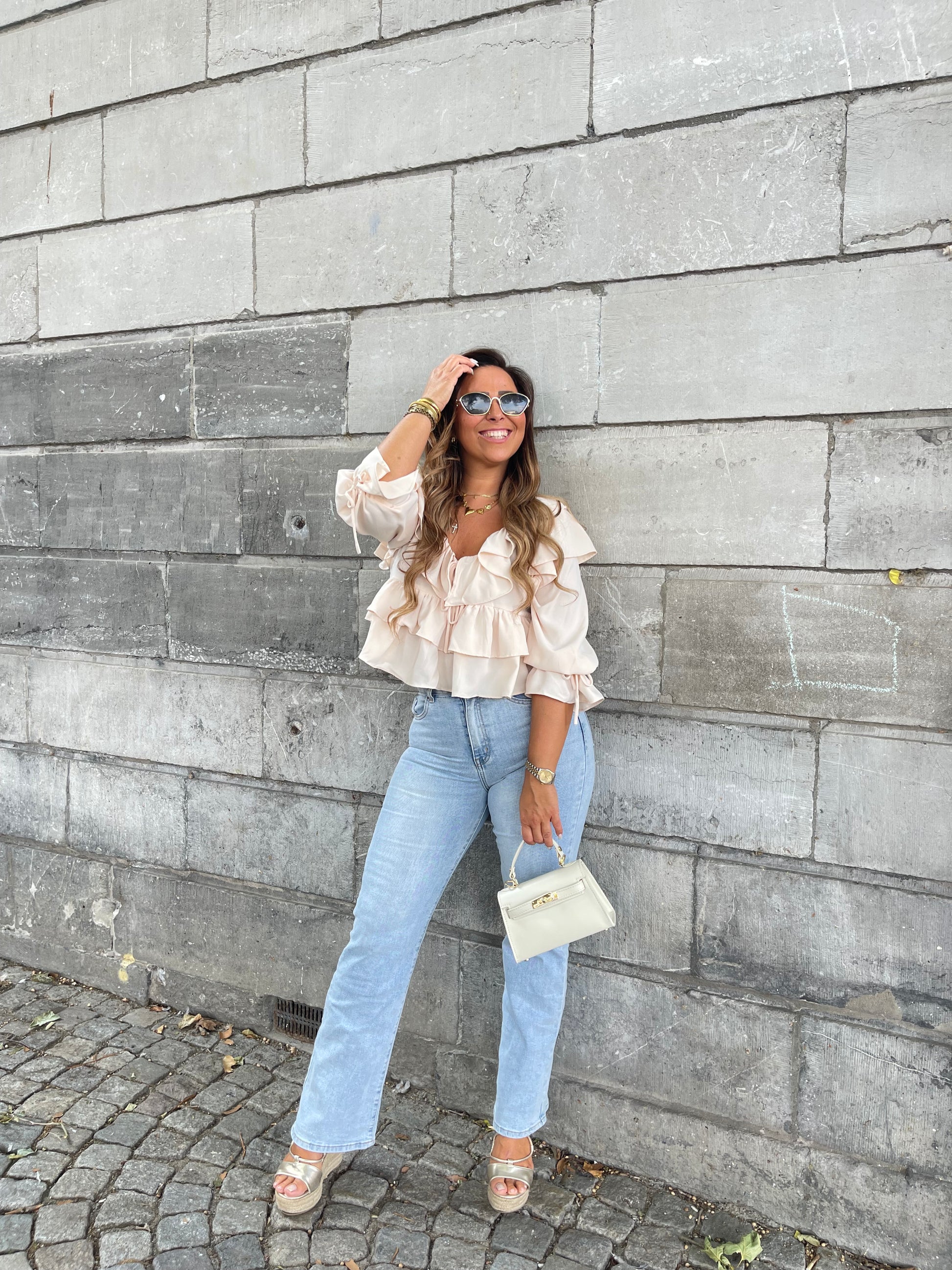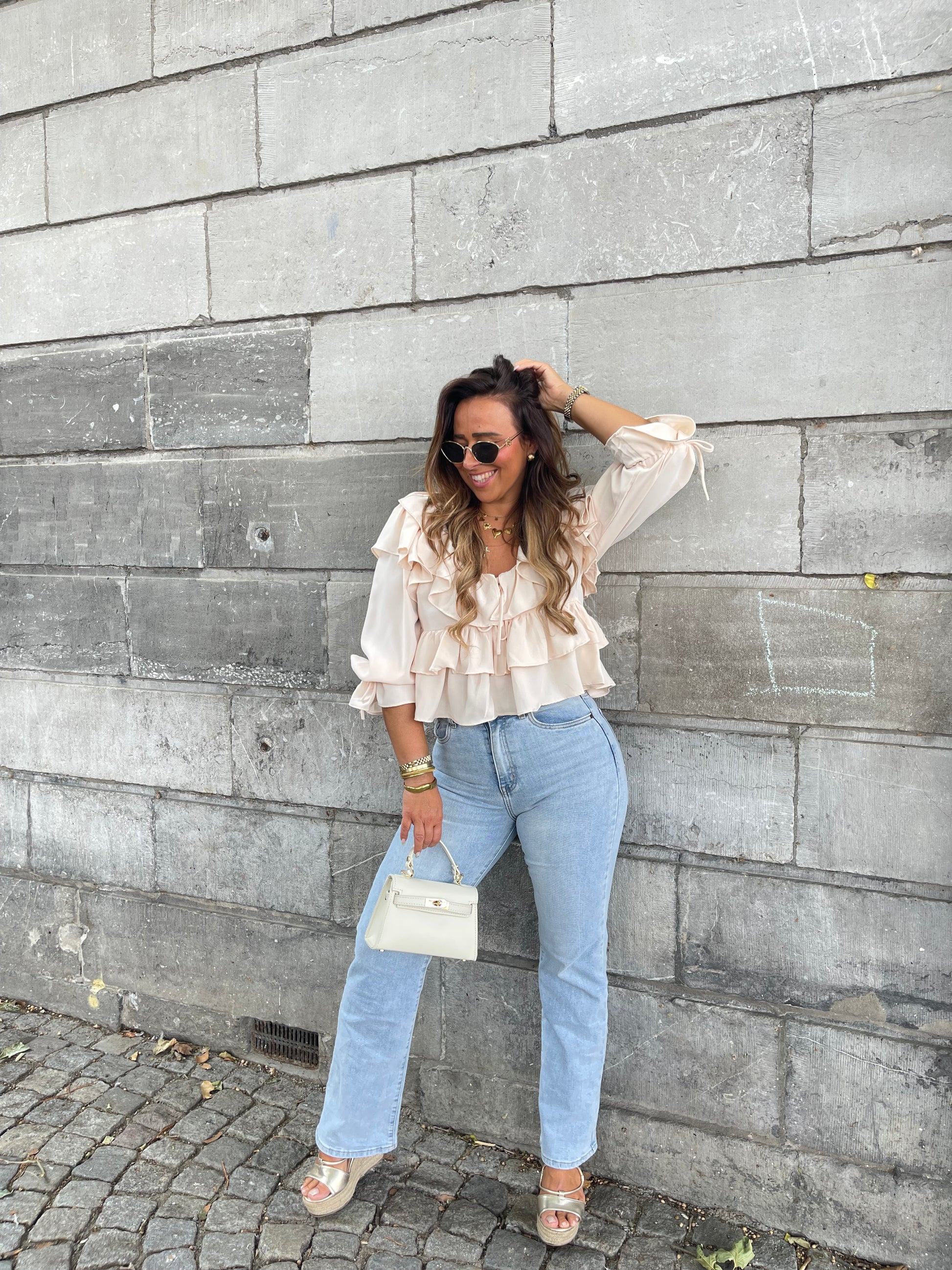 Prachtig cropped bloesje met roesjes. Super leuk te dragen op een high waist jeans. De mouwtjes zijn ook verstelbaar door het touwtje. Valt goed op maat, ons model is 1.74m lang en draagt maat m. Let op, handwas mag niet in de wasmachine gewassen worden.