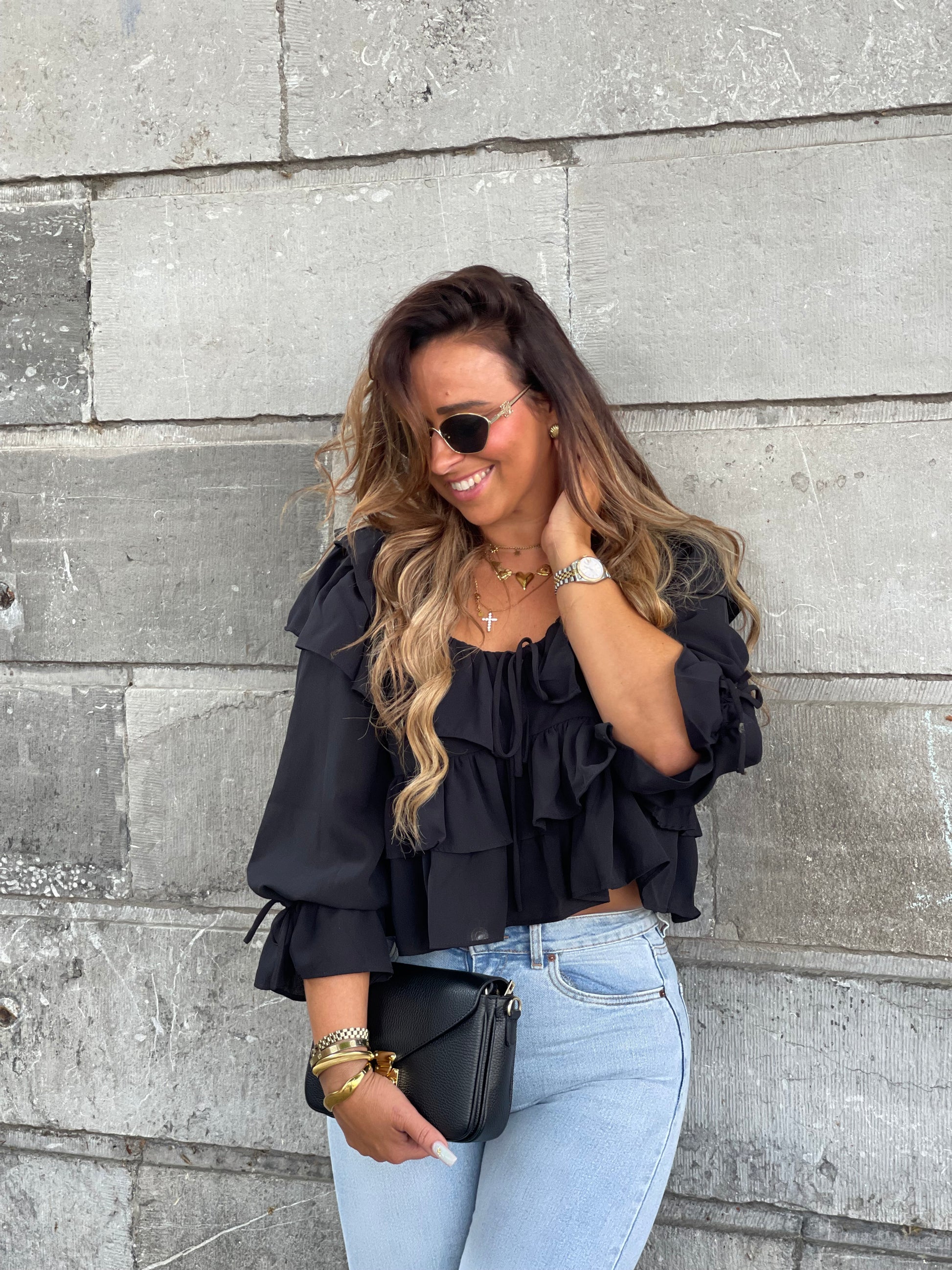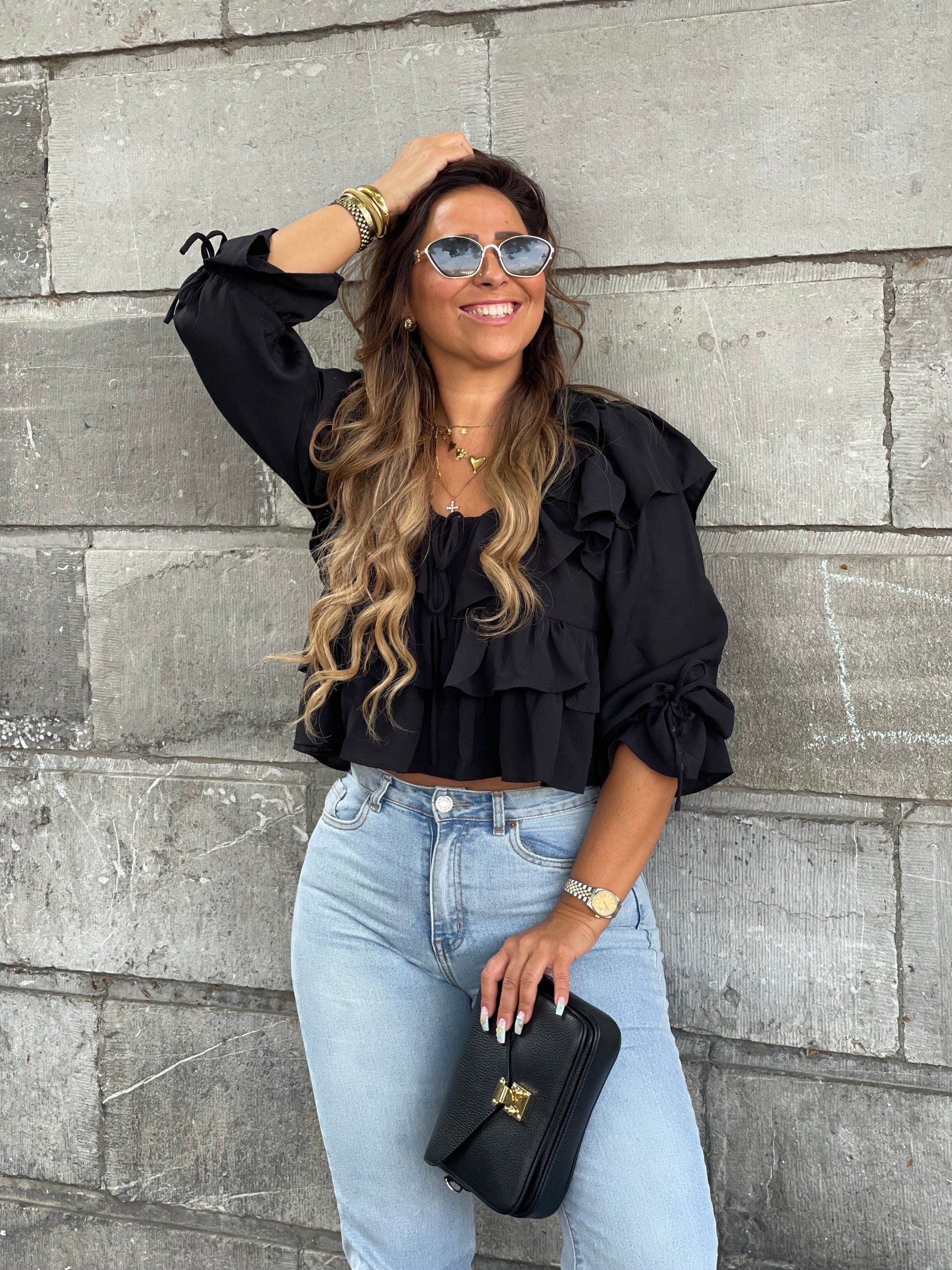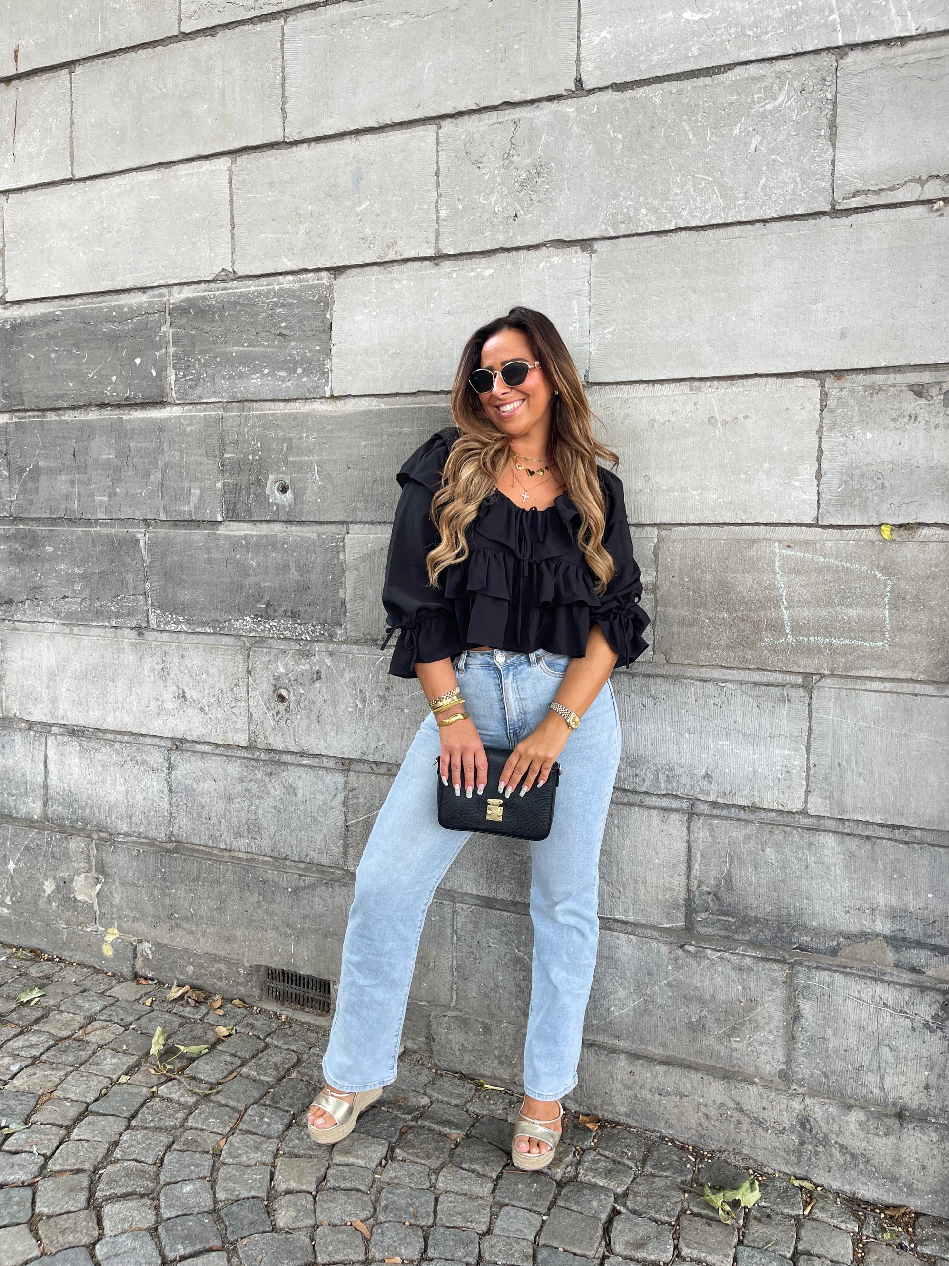Prachtig cropped bloesje met roesjes. Super leuk te dragen op een high waist jeans. De mouwtjes zijn ook verstelbaar door het touwtje. Valt goed op maat, ons model is 1.74m lang en draagt maat m. Let op, handwas mag niet in de wasmachine gewassen worden.