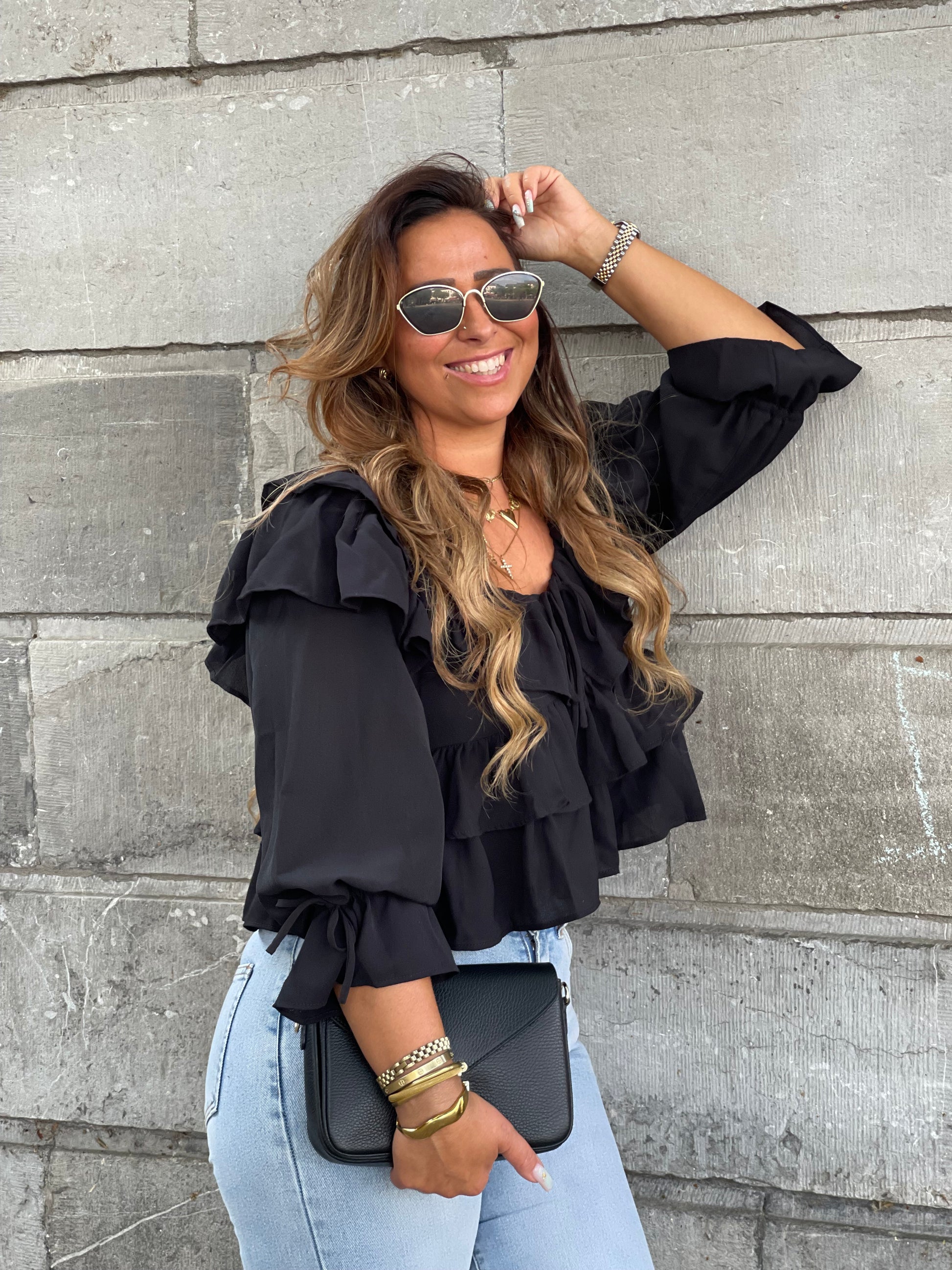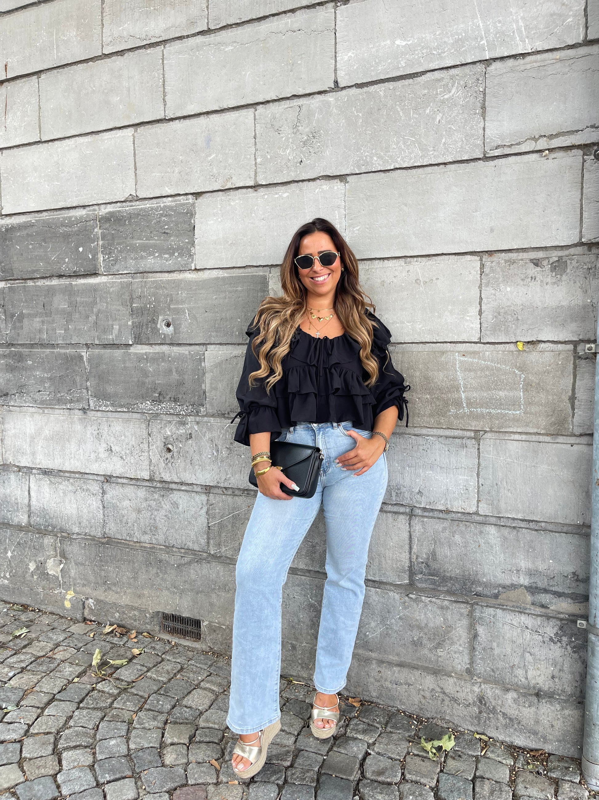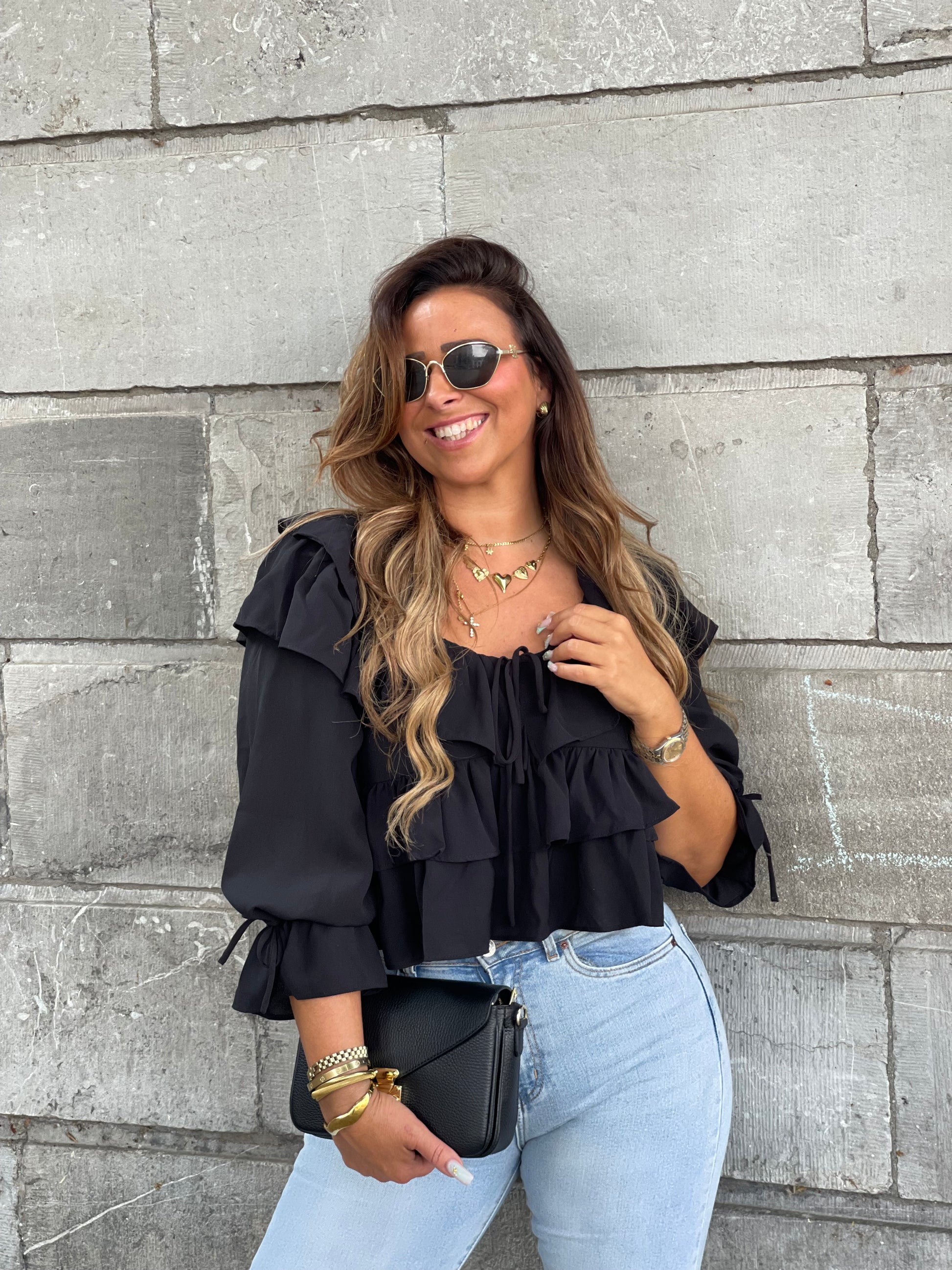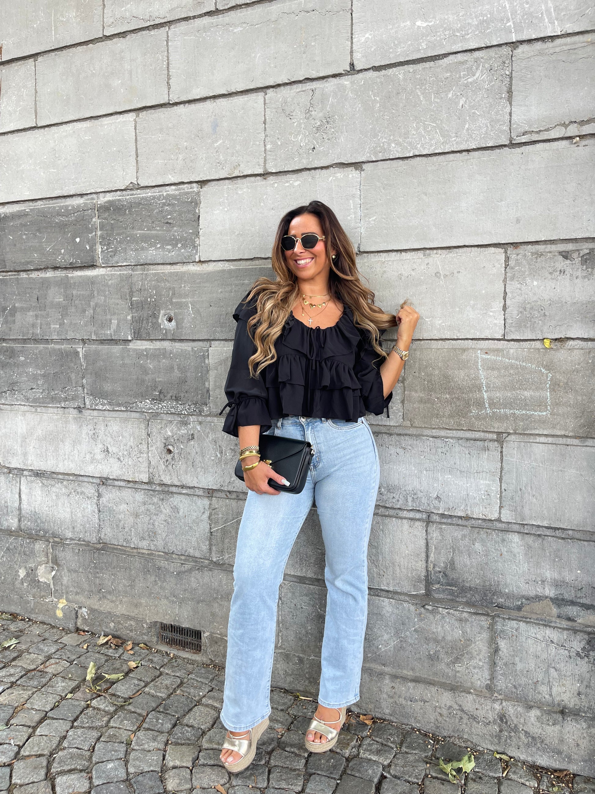 Prachtig cropped bloesje met roesjes. Super leuk te dragen op een high waist jeans. De mouwtjes zijn ook verstelbaar door het touwtje. Valt goed op maat, ons model is 1.74m lang en draagt maat m. Let op, handwas mag niet in de wasmachine gewassen worden.