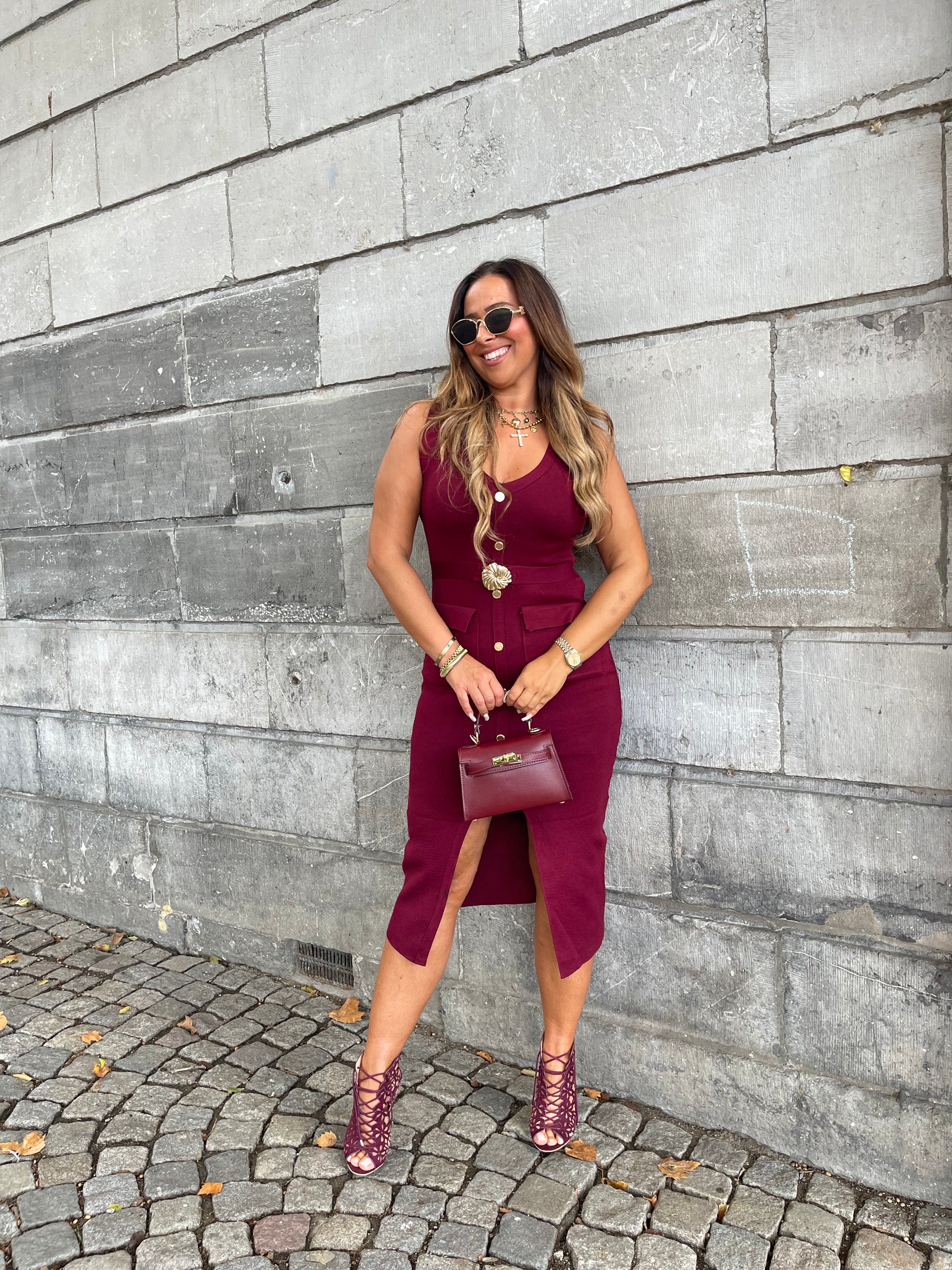 De it dress die je niet mag missen. Super leuk om met een bloesje te dragen maar ook gewoon zonder. Veel stretch met gouden details en een v-hals. Ons model is 1.77m lang en draagt maat m\l.