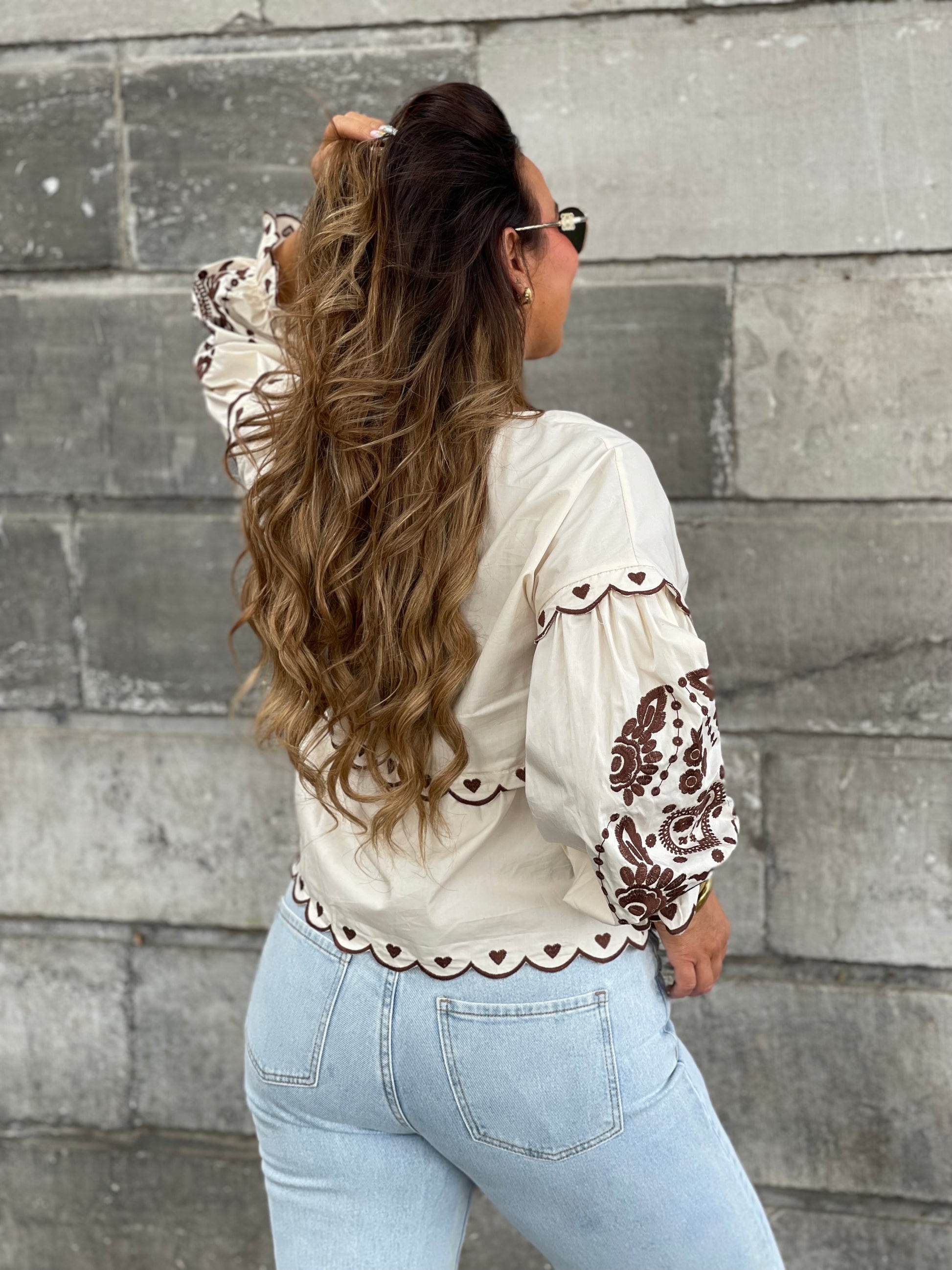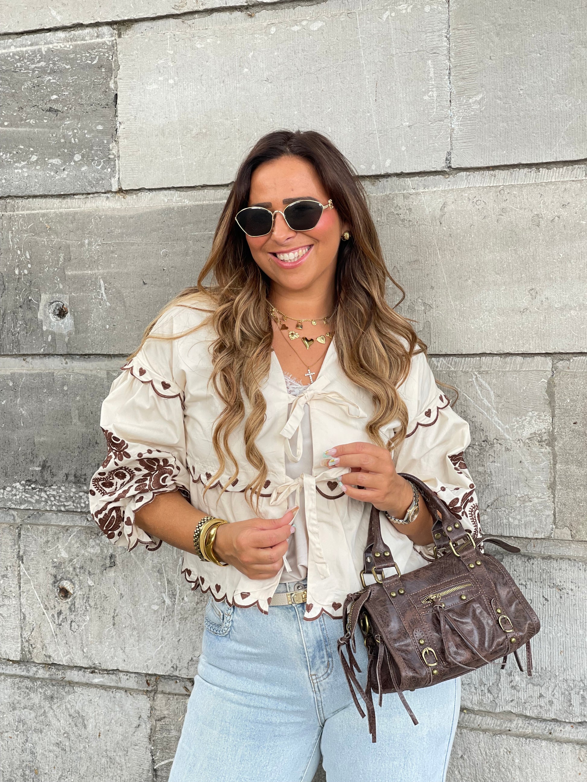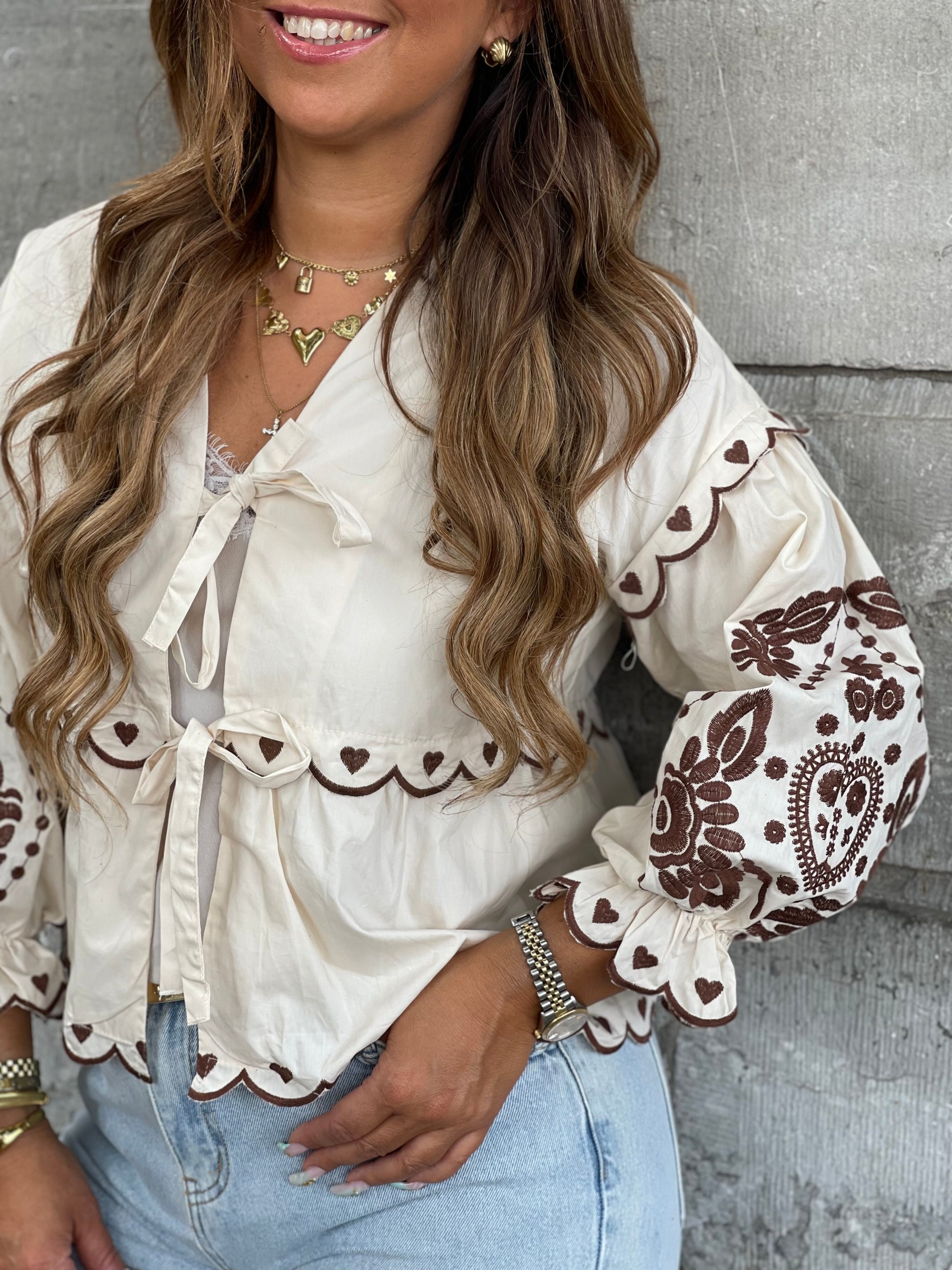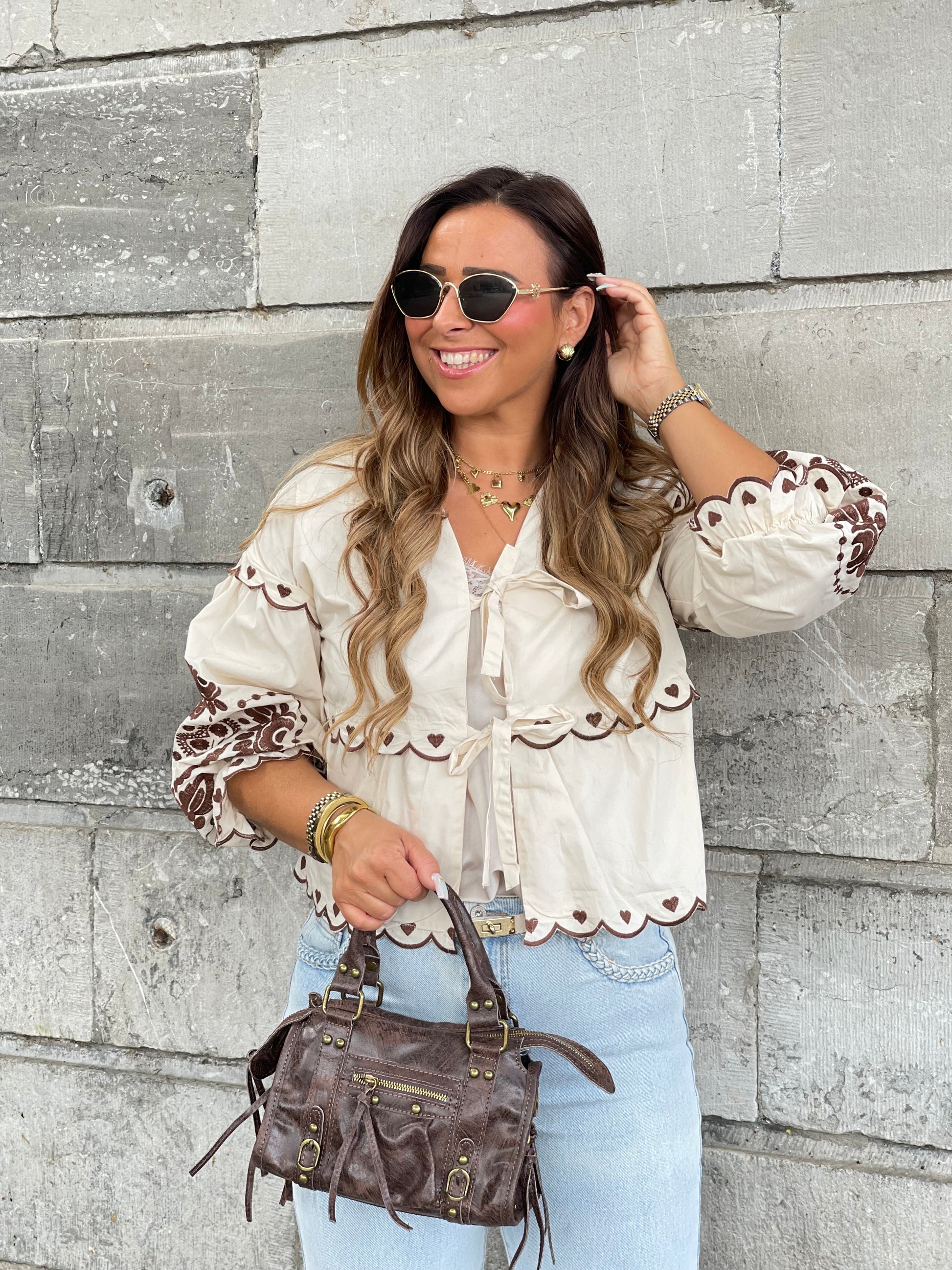 Prachtige 100% katoenen bloesje met mooie hartjes details. Super cute op een jeans of een rokje te combineren. Valt ruim, ons model is 1.74m lang en draagt maat s/m.