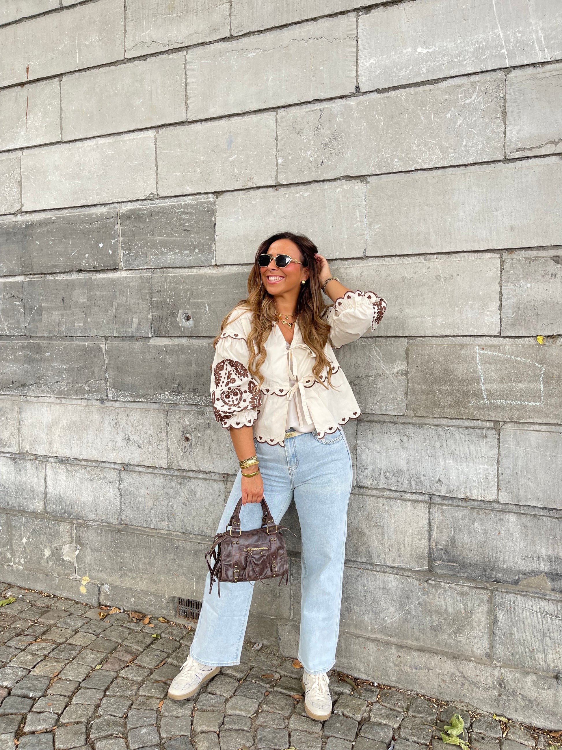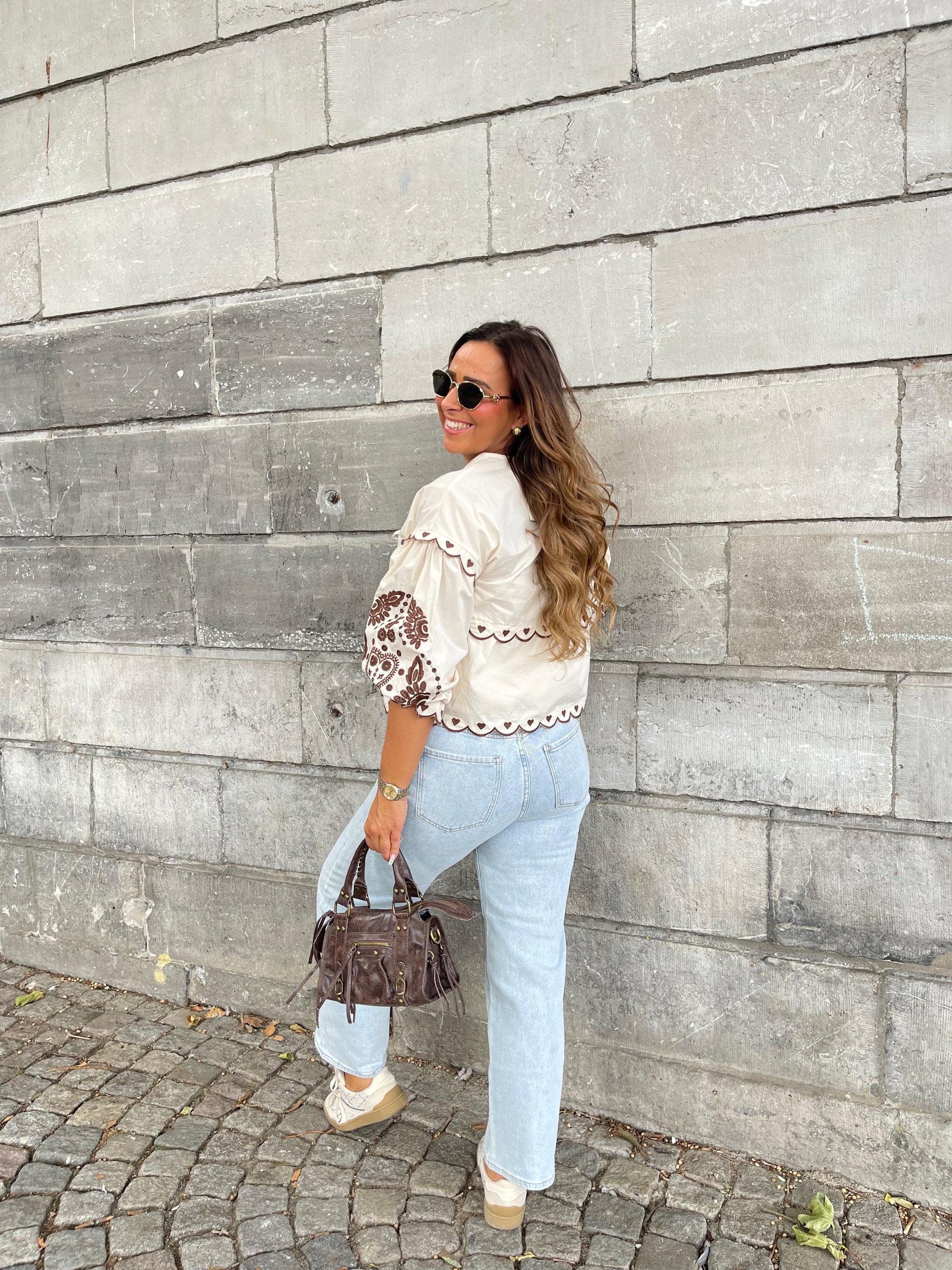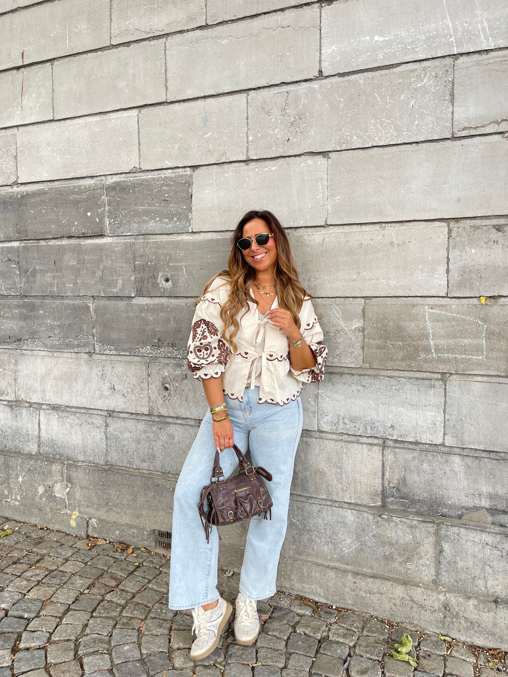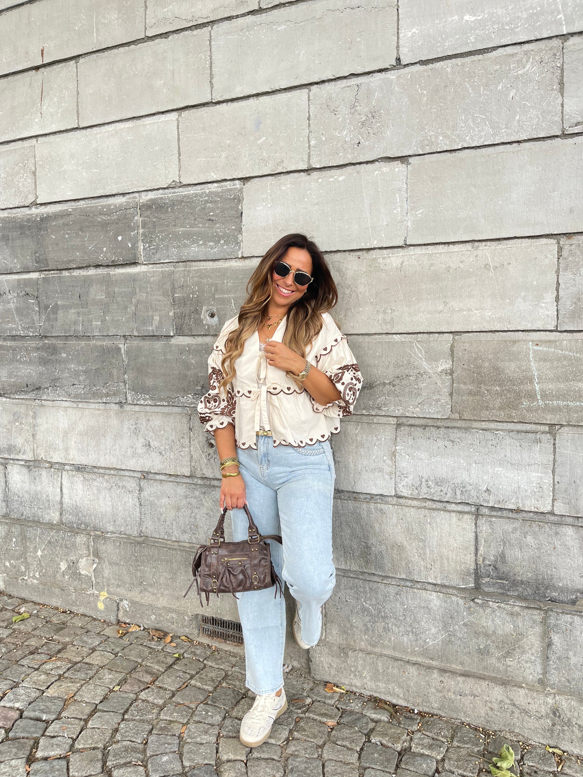 Prachtige 100% katoenen bloesje met mooie hartjes details. Super cute op een jeans of een rokje te combineren. Valt ruim, ons model is 1.74m lang en draagt maat s/m.