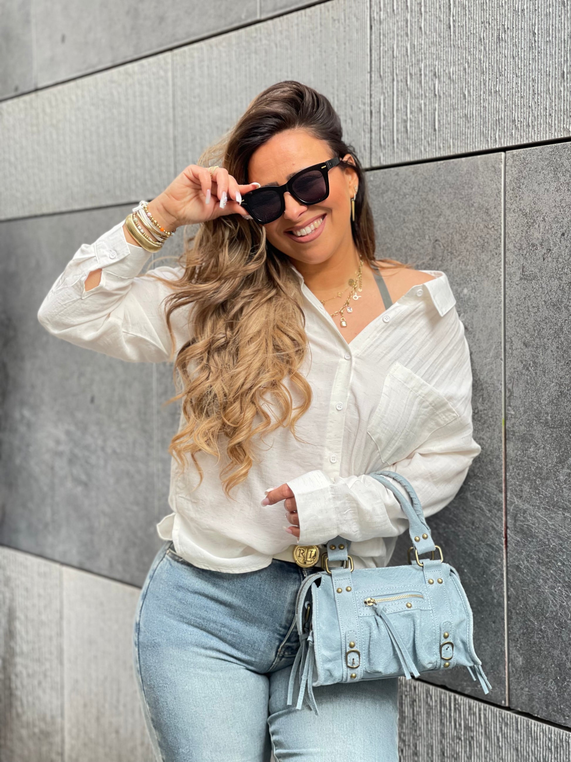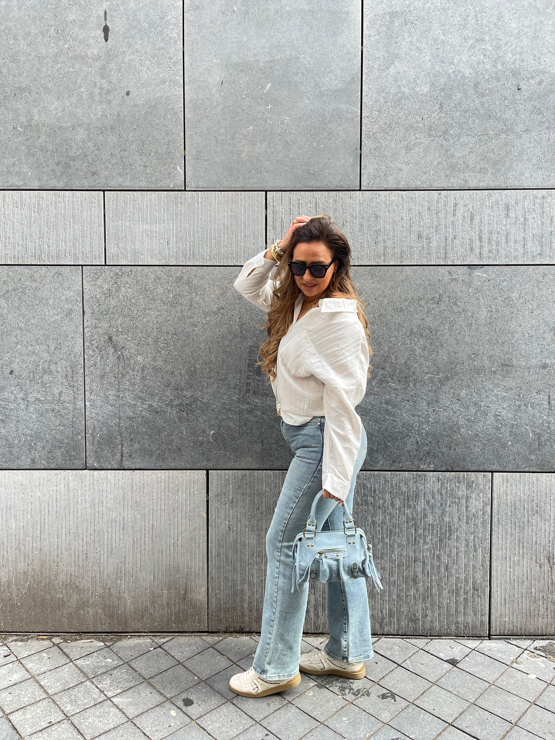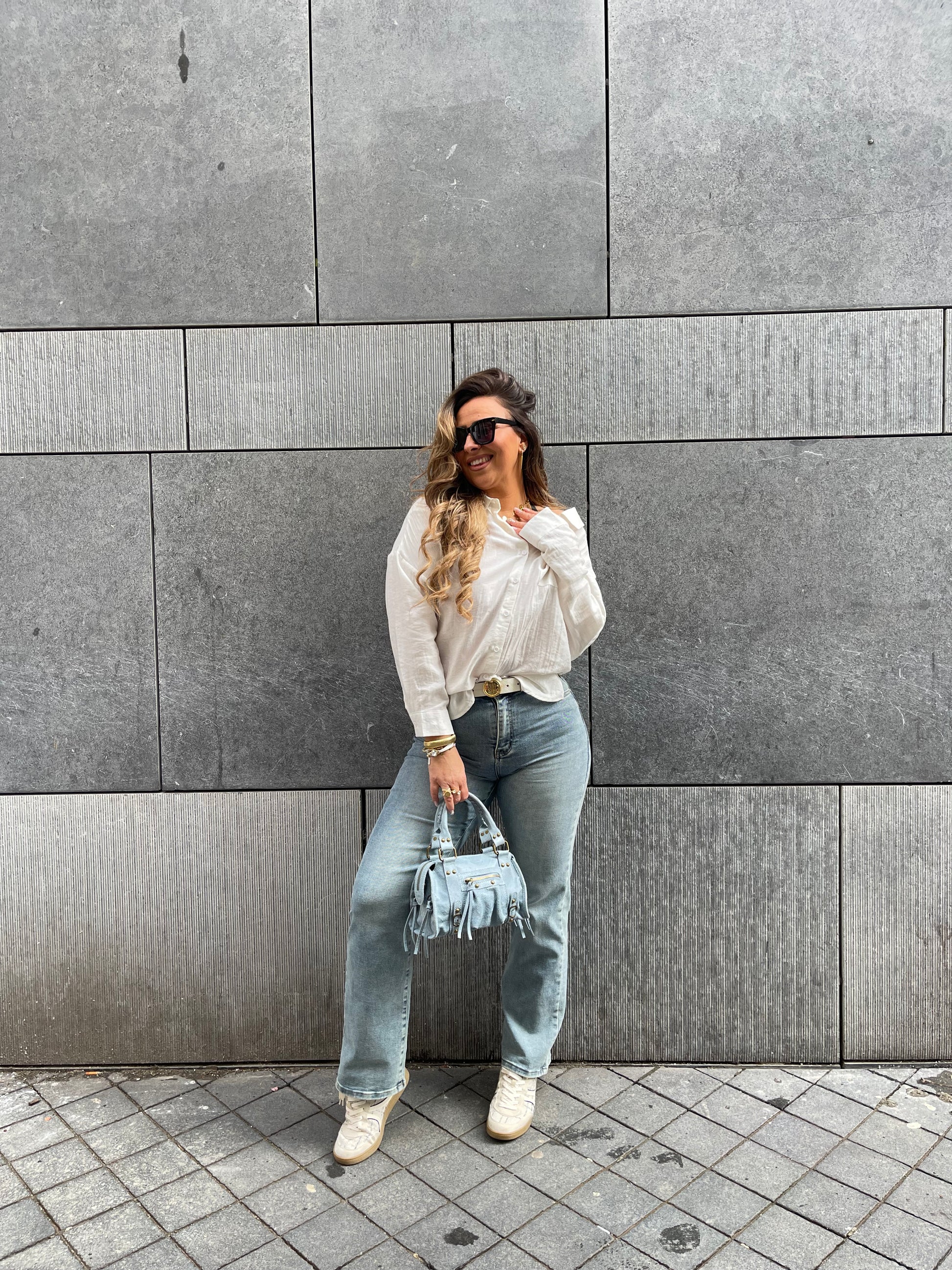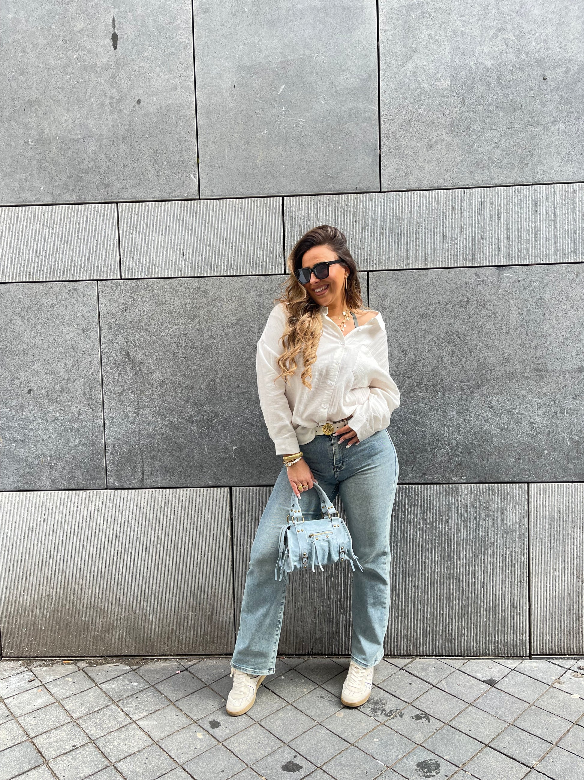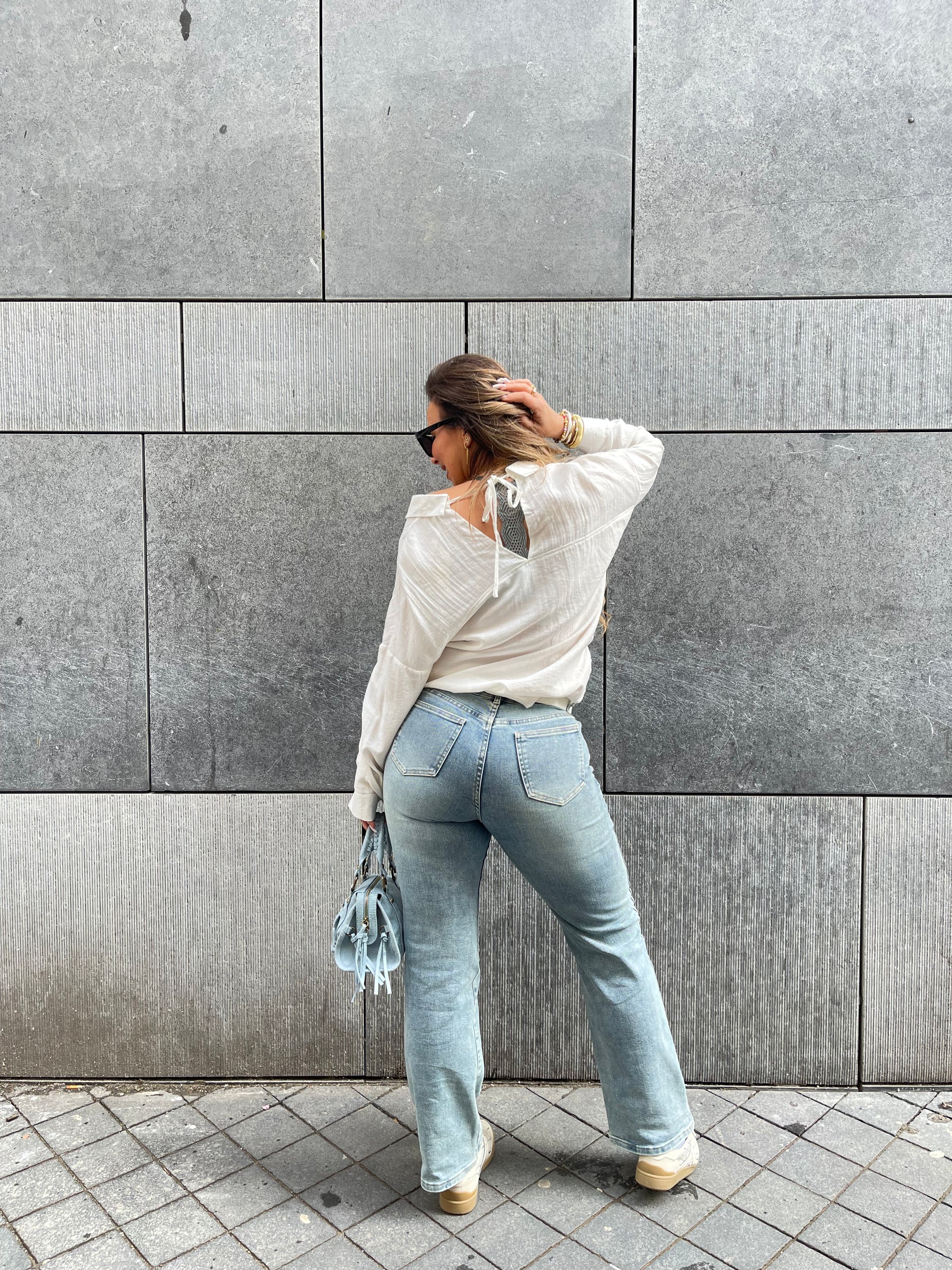 Oversized viscose & linnen bloesje met een leuke detail op de achterkant. Ons model is 1.74m lang en draagt maat s/m.