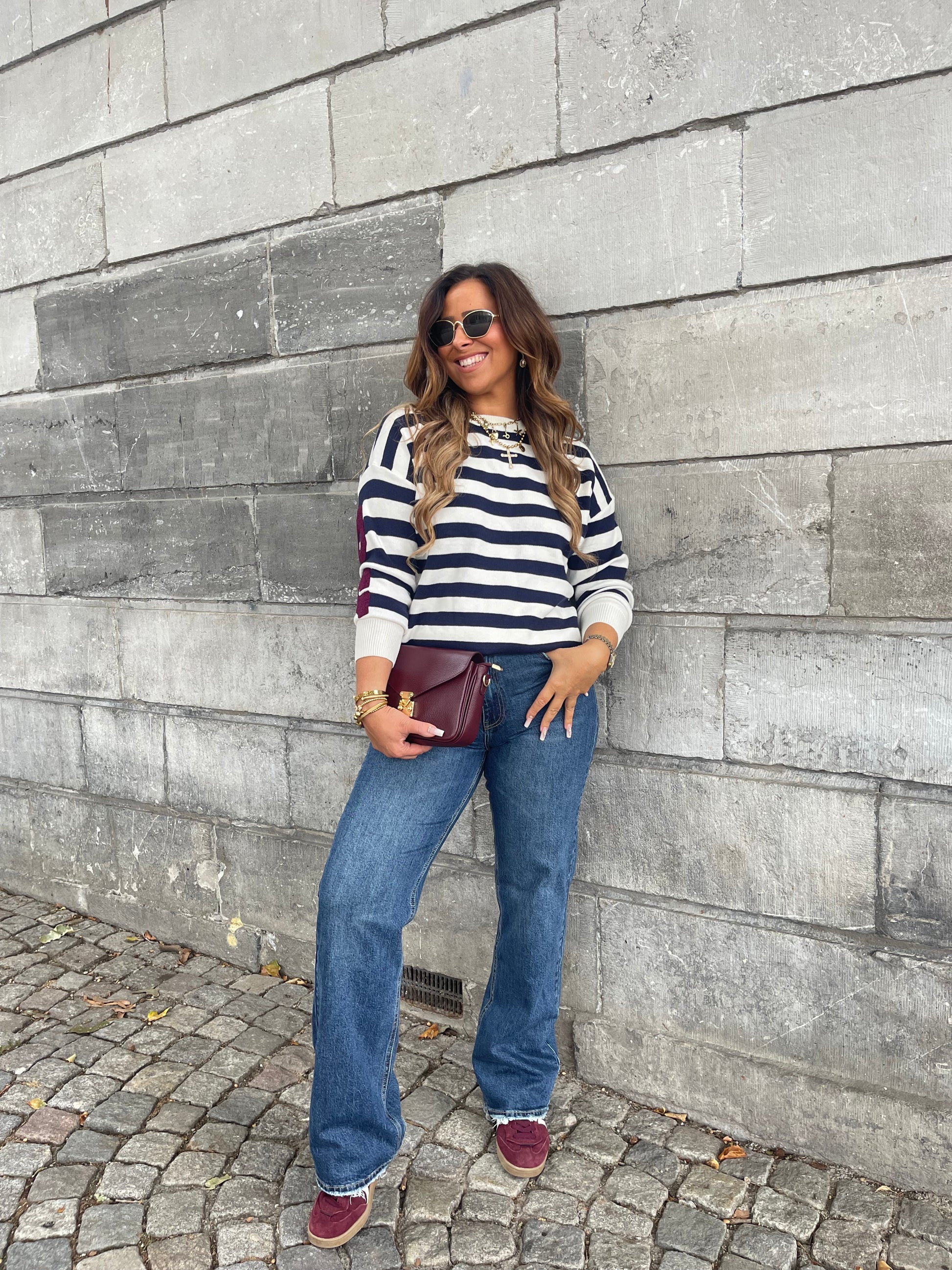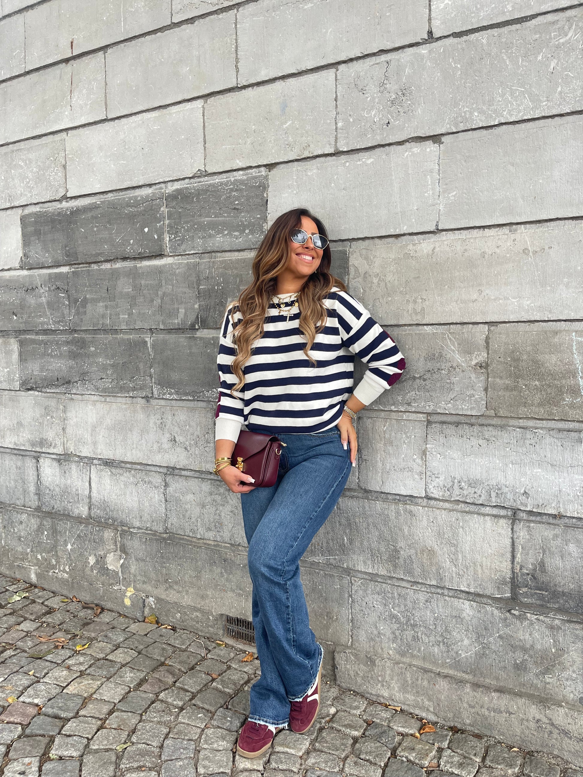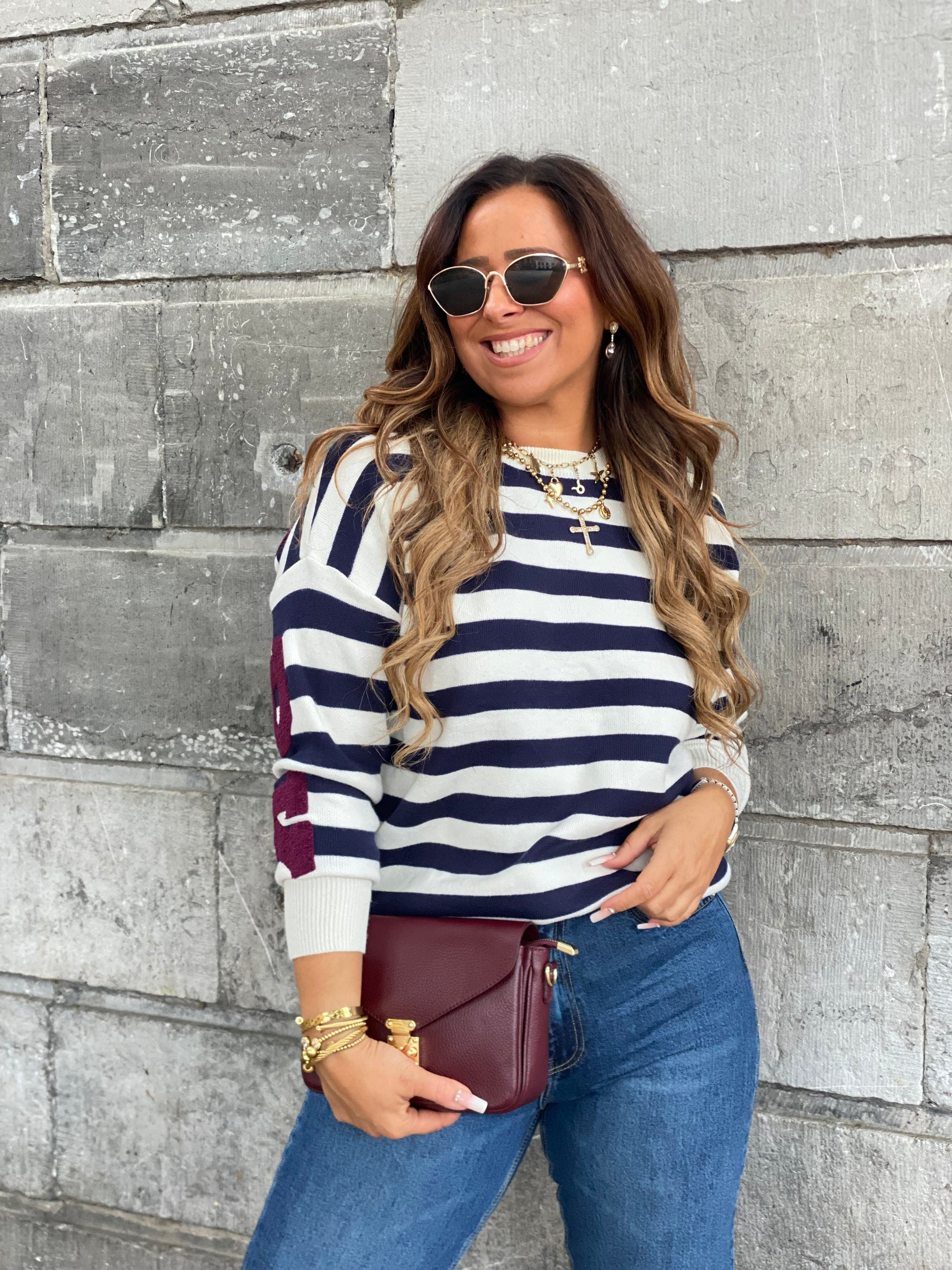 Oversized streepjes sweater met een leuke print op de achterkant en de mouw. Mooi te combineren met een van onze jeansbroeken. Draagbaar voor de maatjes xs t/m l.