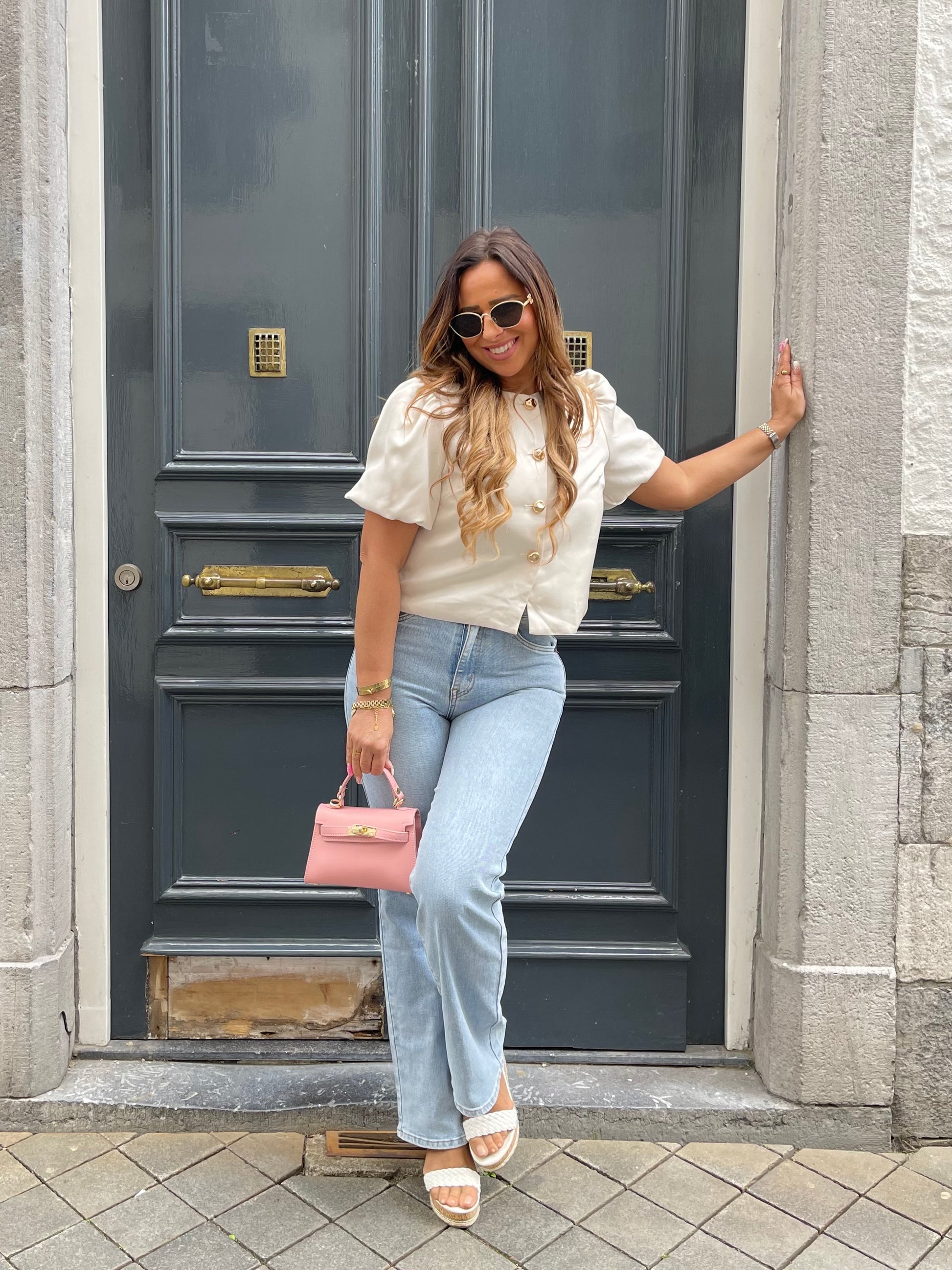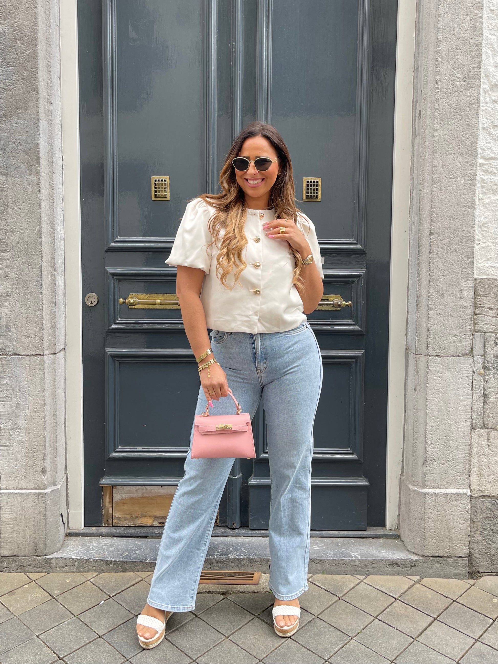 Beeldig bloesje met gouden knoopjes. Erg leuk op een jeans of rokje te combineren. Ons model is 1.74m lang en draagt maat L.