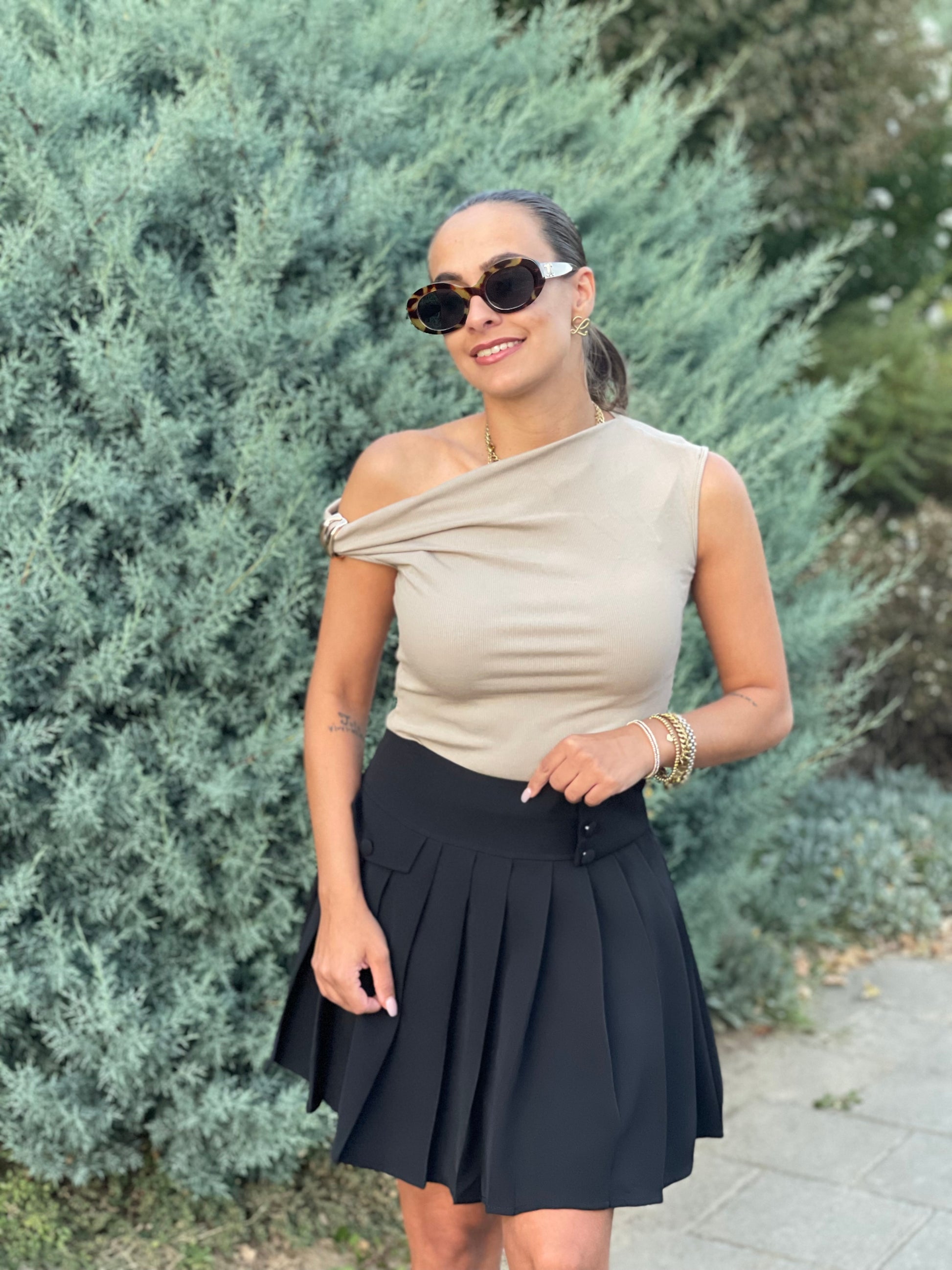 Geplooid skortje met leuke details. Ideaal voor een festival of een avondje uit. Ons model is 1.58m en draagt maatje m: