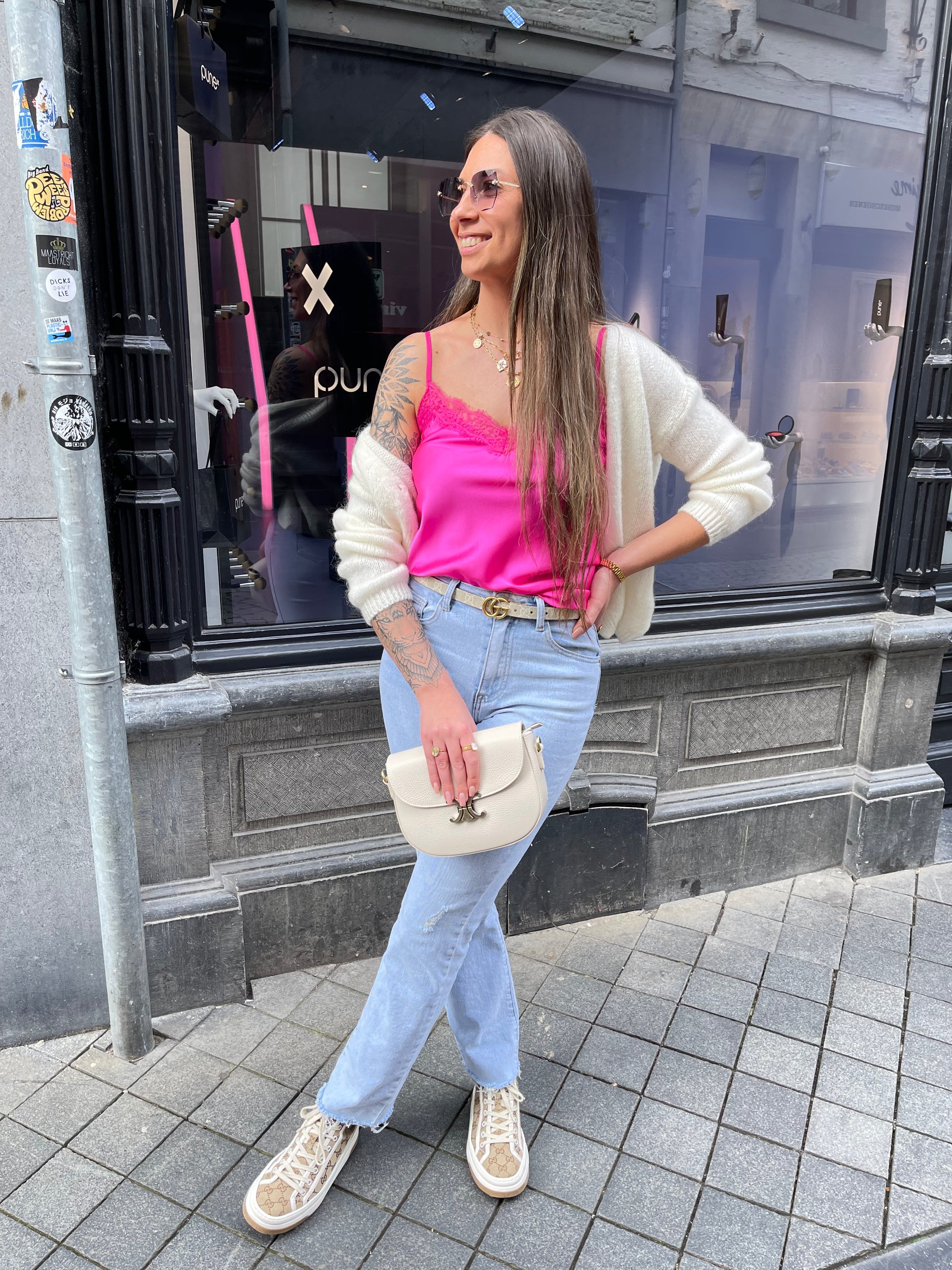 Super cute top with lace detail around the neck. The top is one size and is suitable for sizes xs to l. Super fun to wear under one of our must-have jackets, cardigans or dresses! Love it….