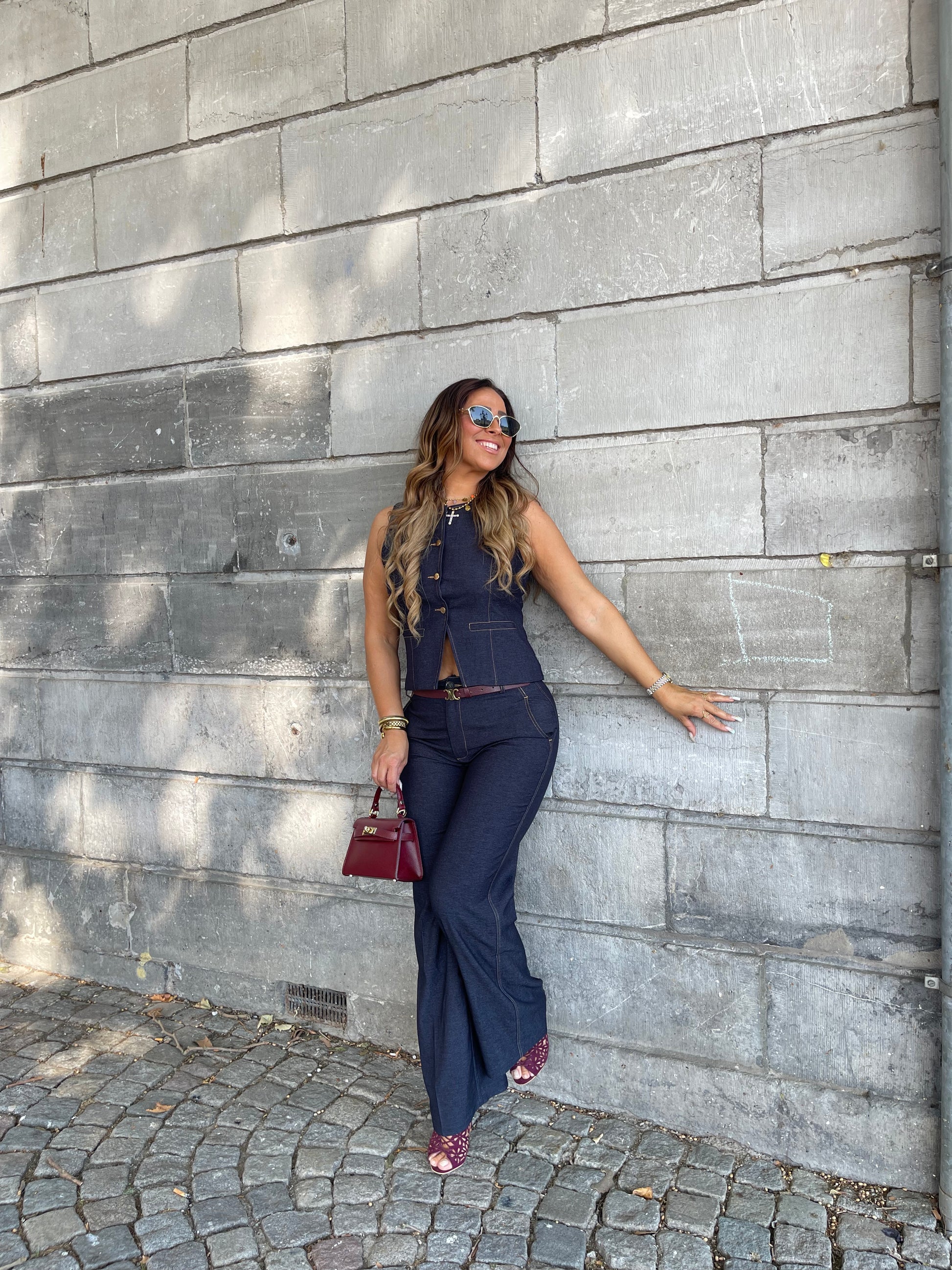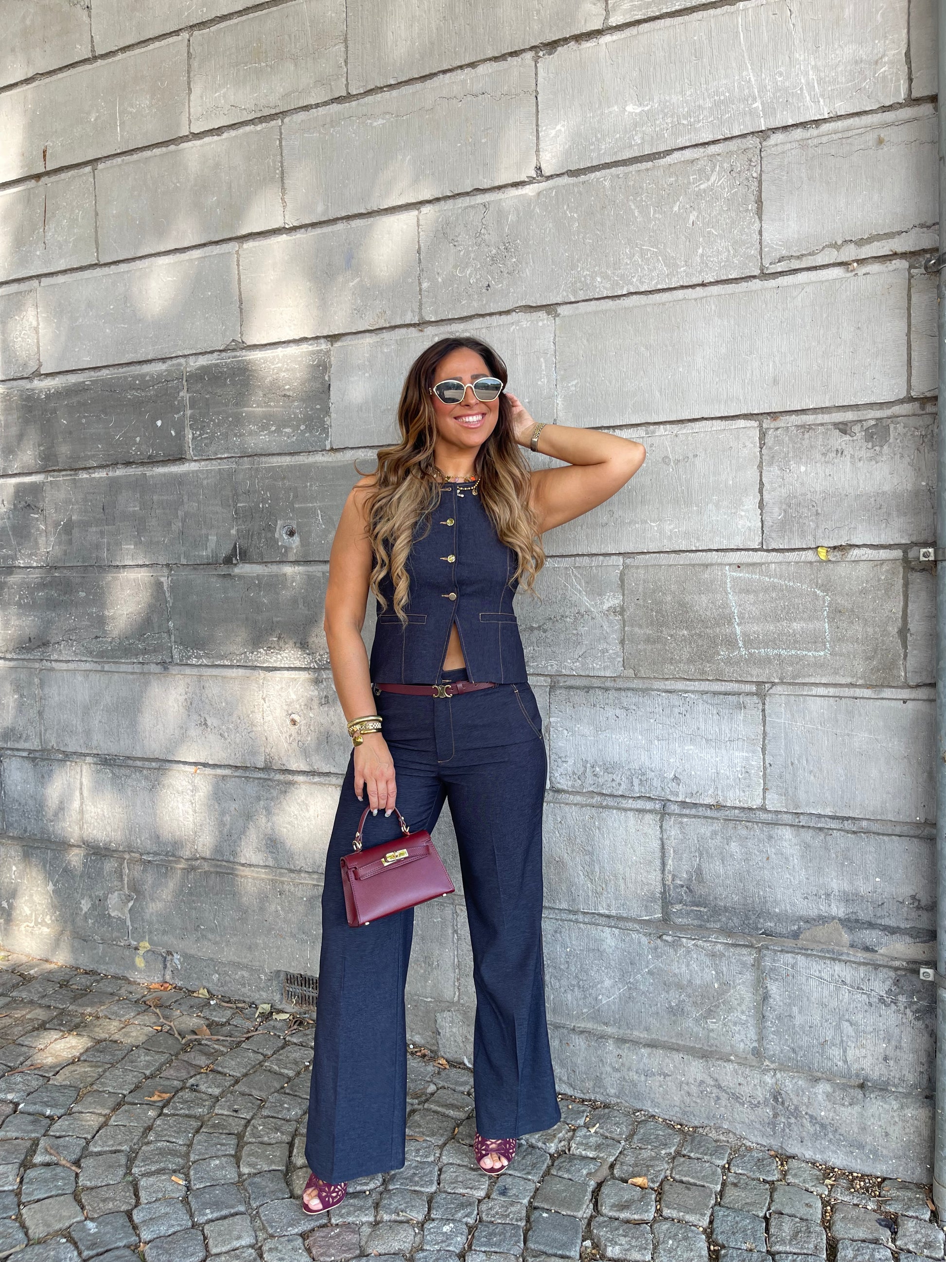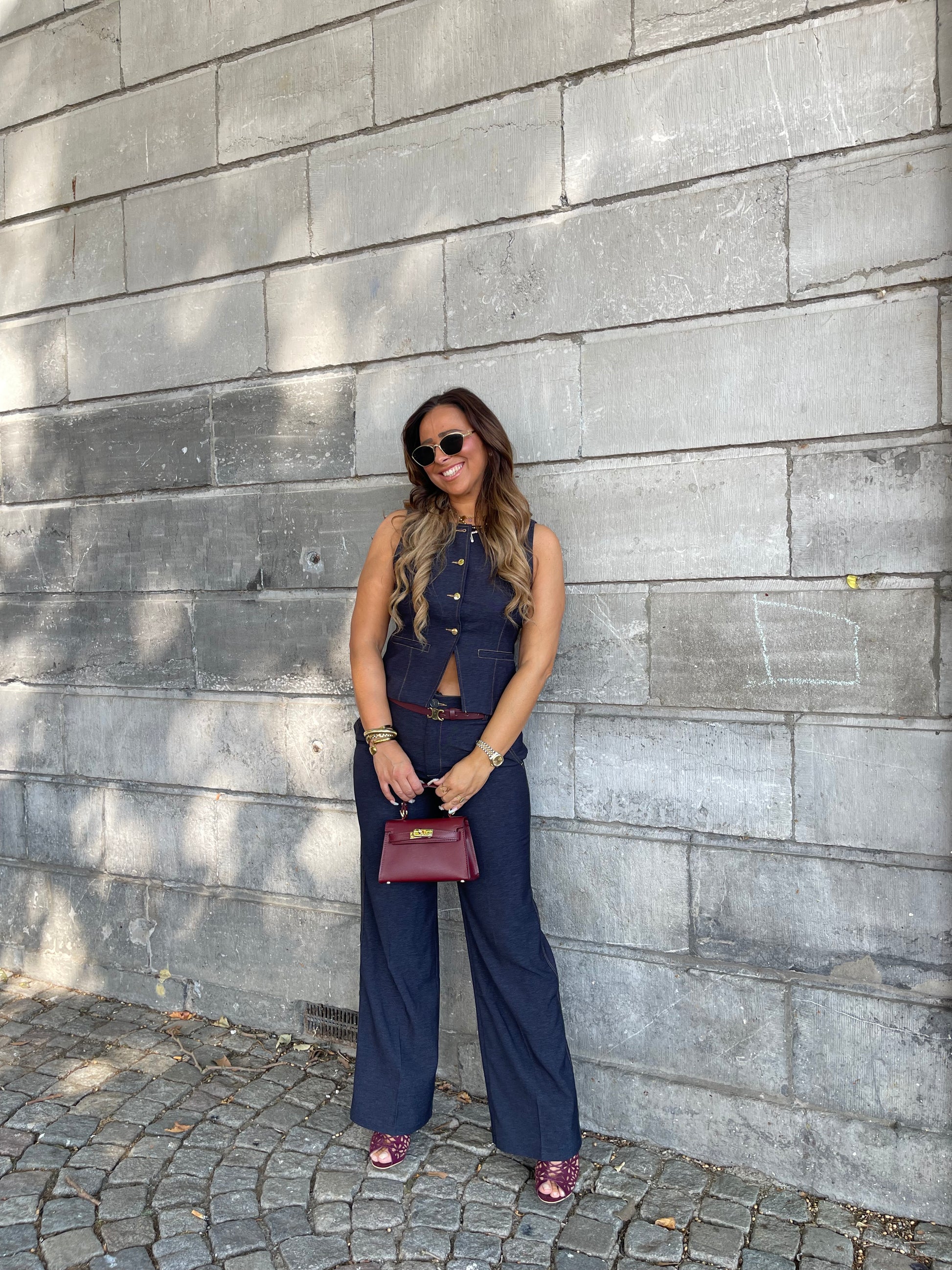 Prachtig gilletje met gouden knopen die je heel mooi kan combineren met onze matching pantalon. Ons model is 1.74m lang en draagt maat L.
