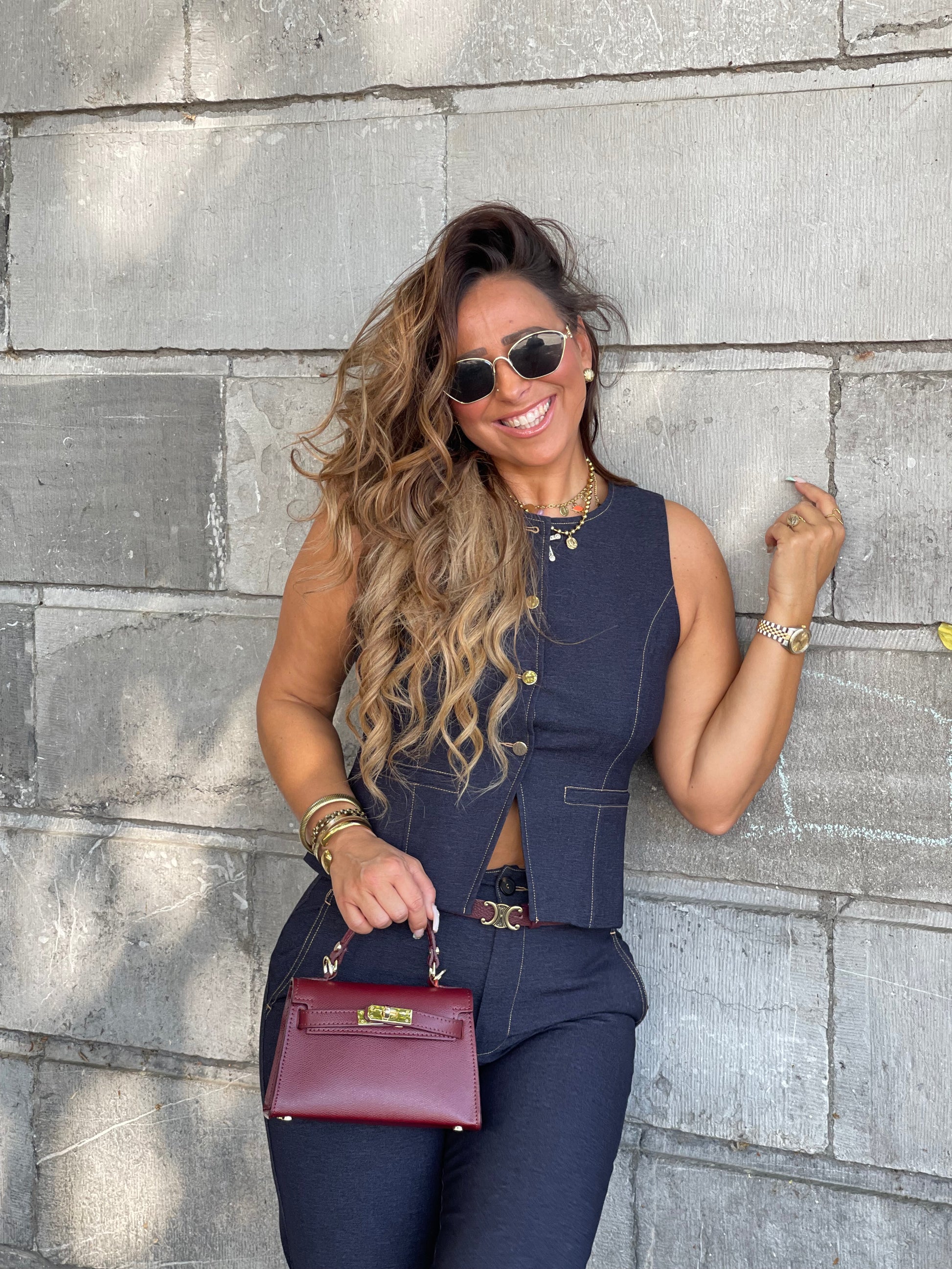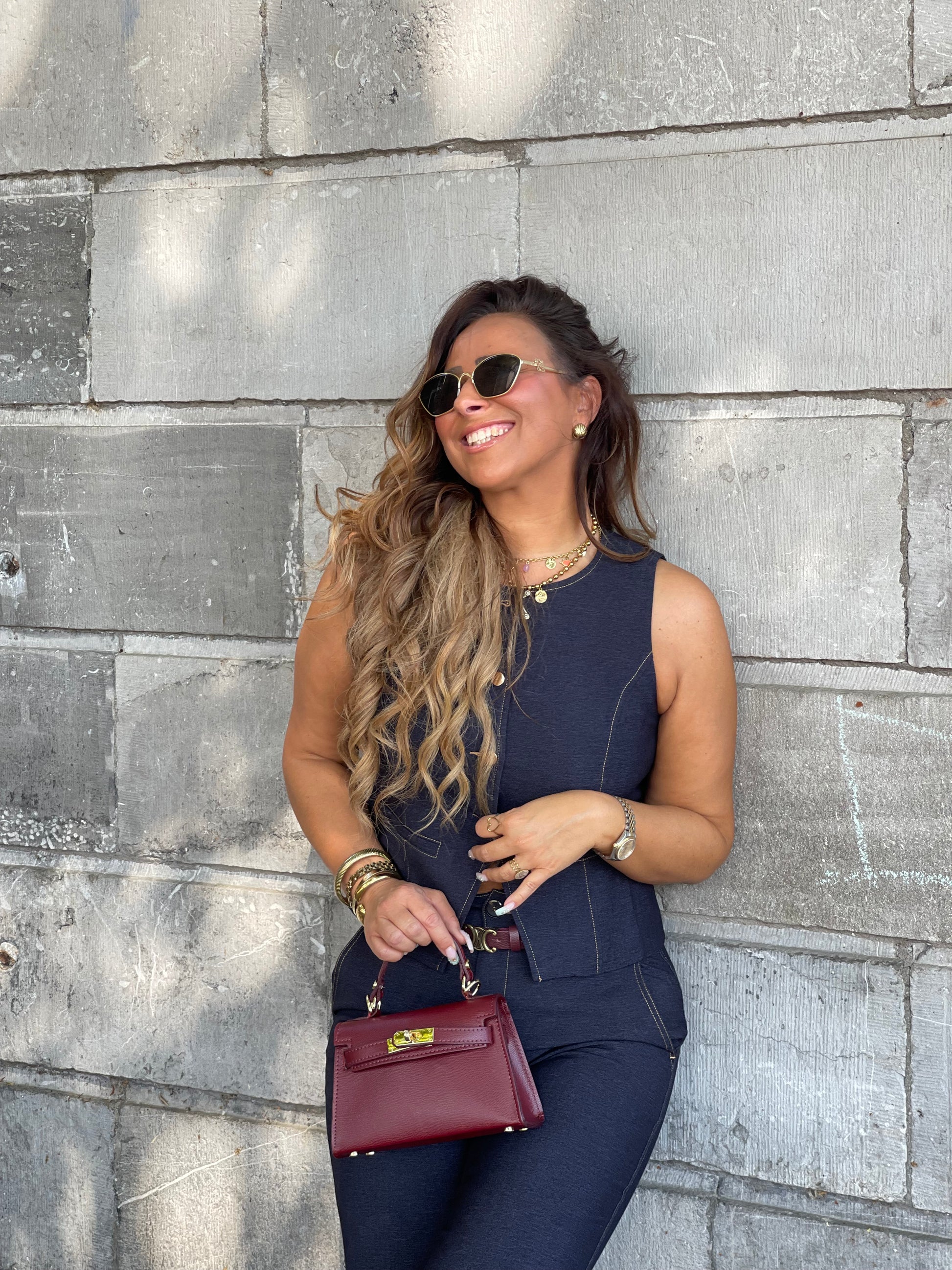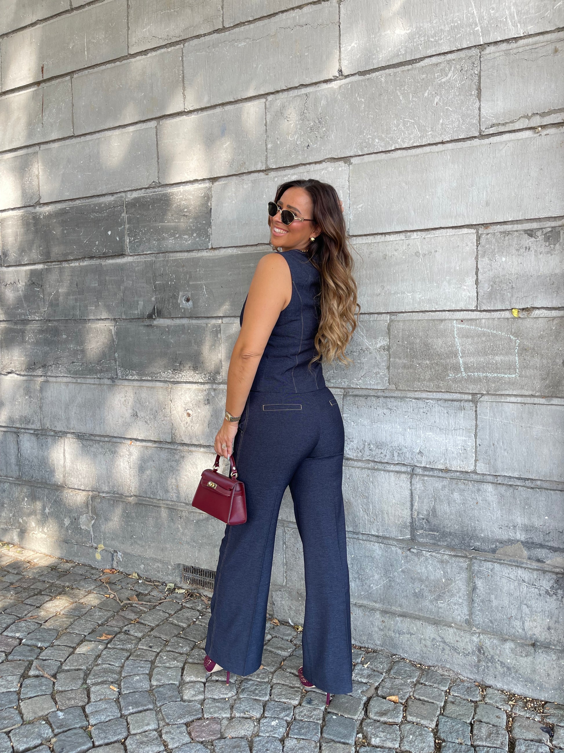 Prachtig gilletje met gouden knopen die je heel mooi kan combineren met onze matching pantalon. Ons model is 1.74m lang en draagt maat L.