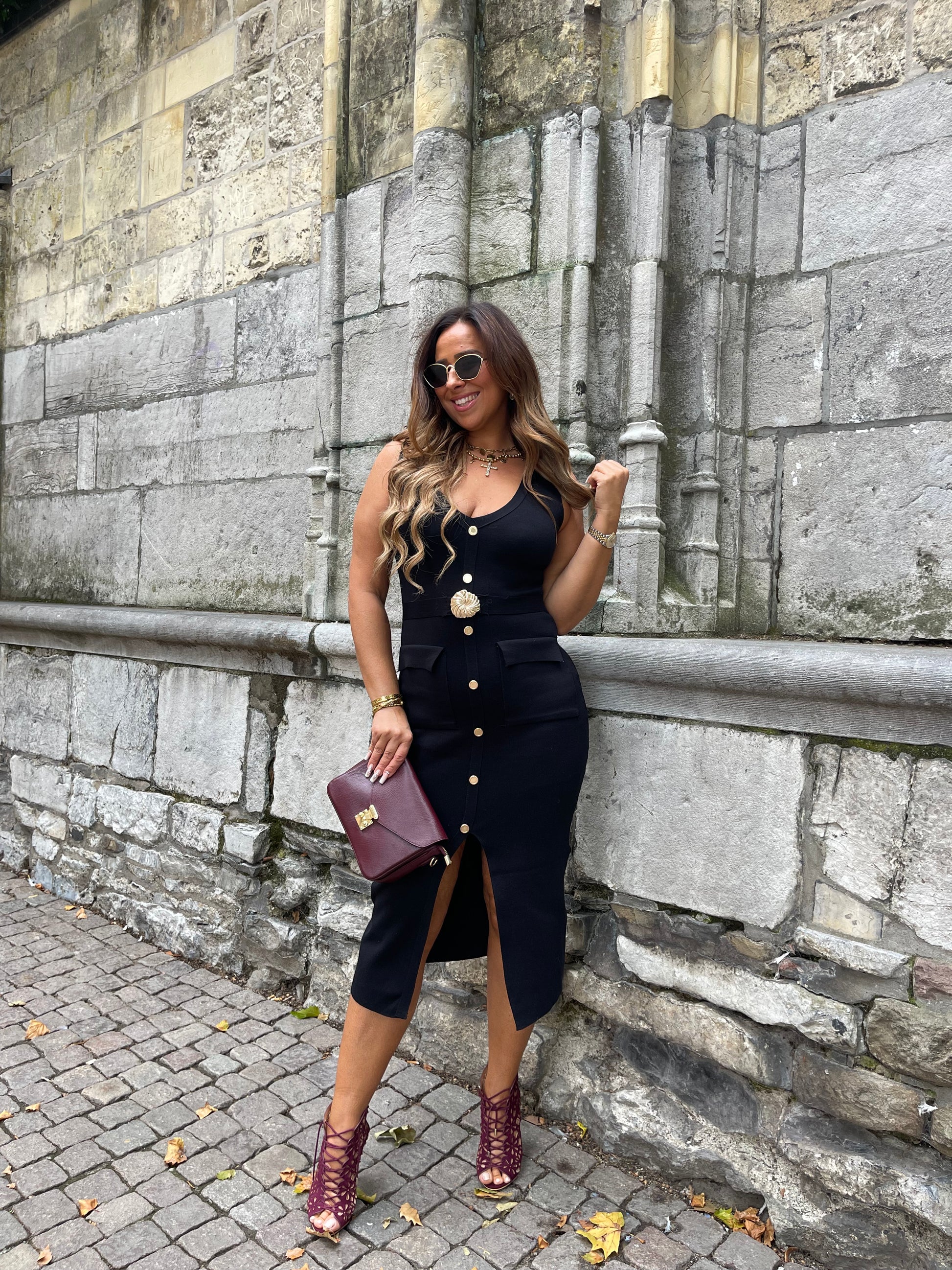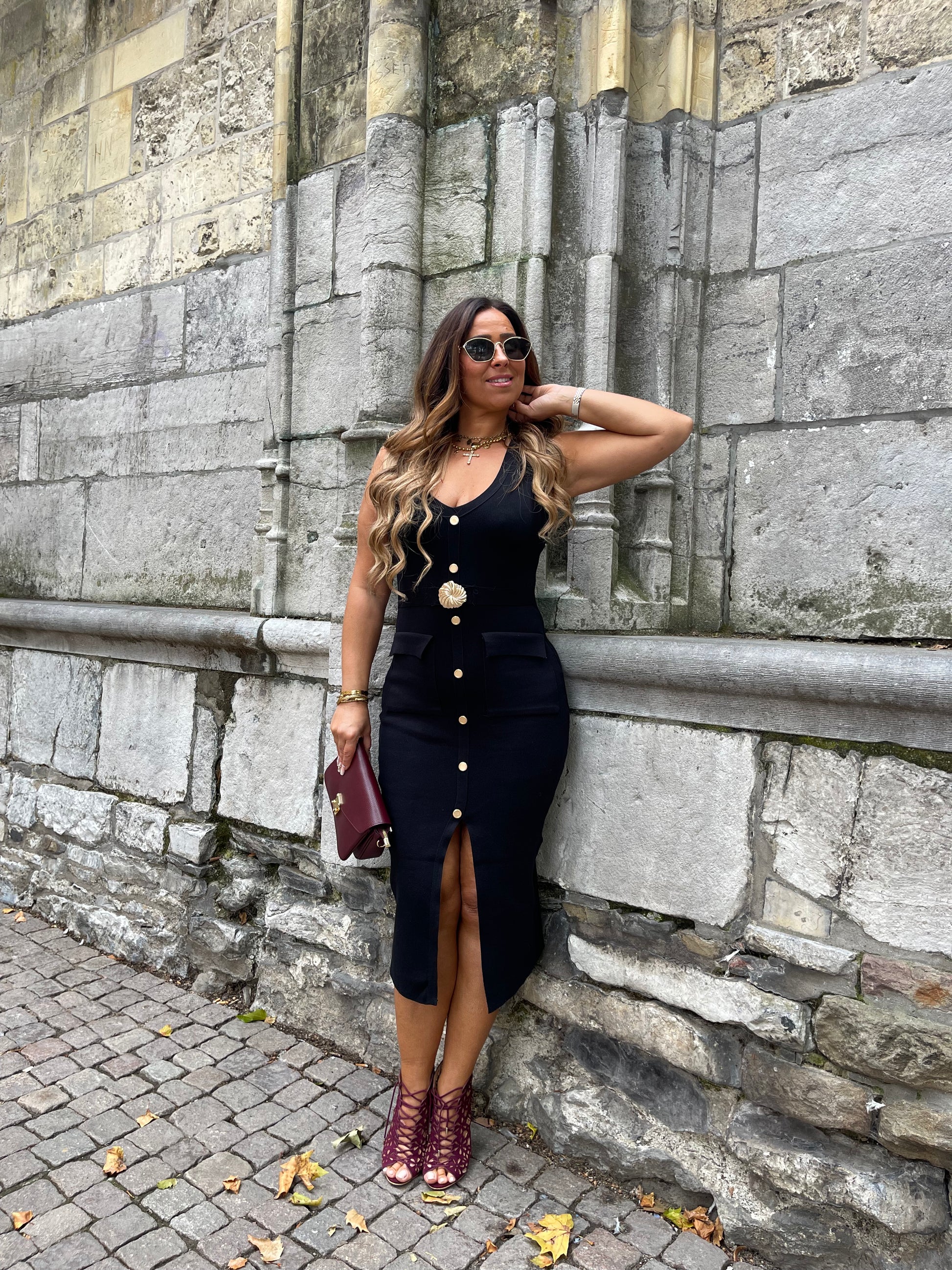 De it dress die je niet mag missen. Super leuk om met een bloesje te dragen maar ook gewoon zonder. Veel stretch met gouden details en een v-hals. Ons model is 1.77m lang en draagt maat m\l.