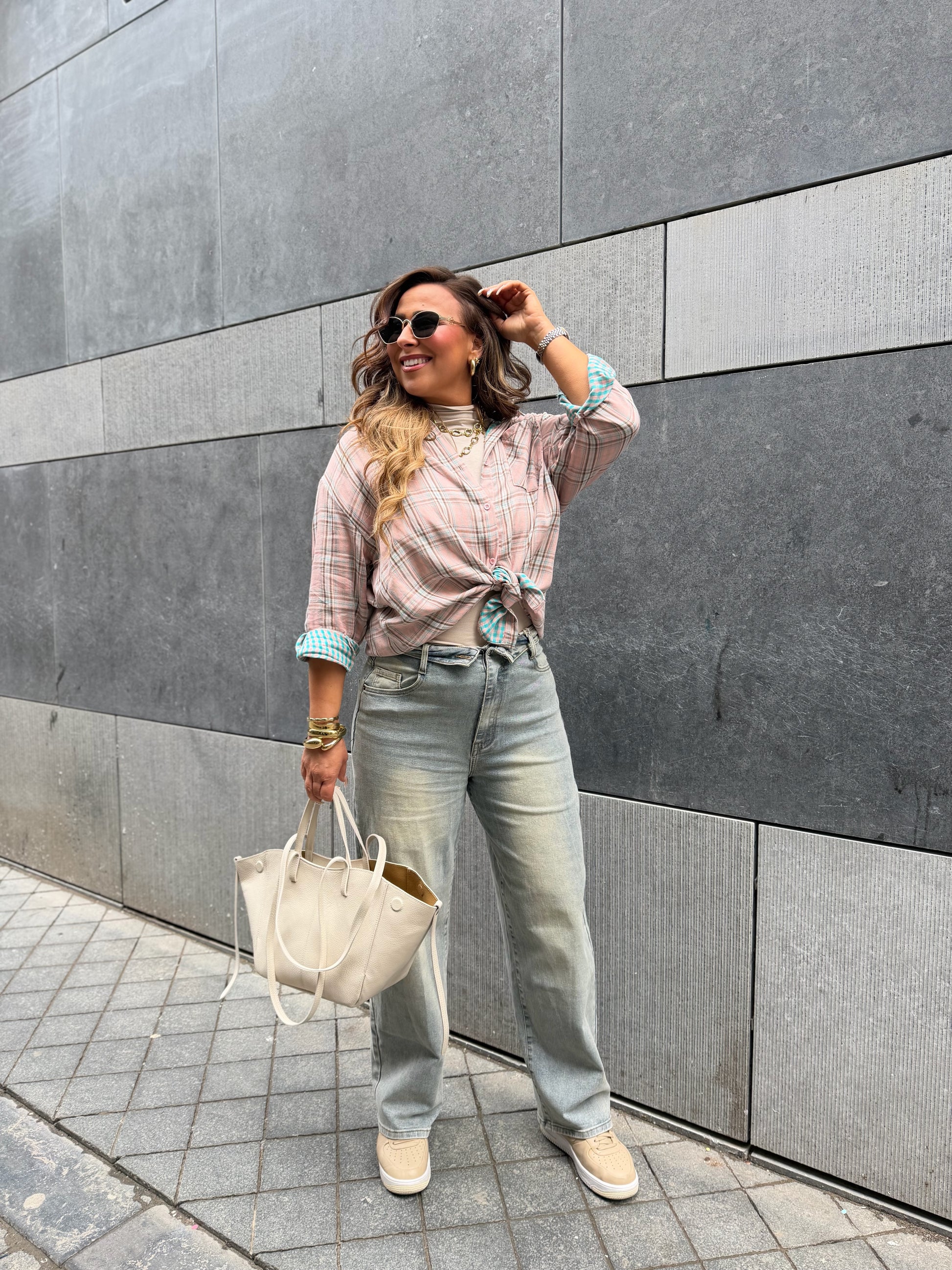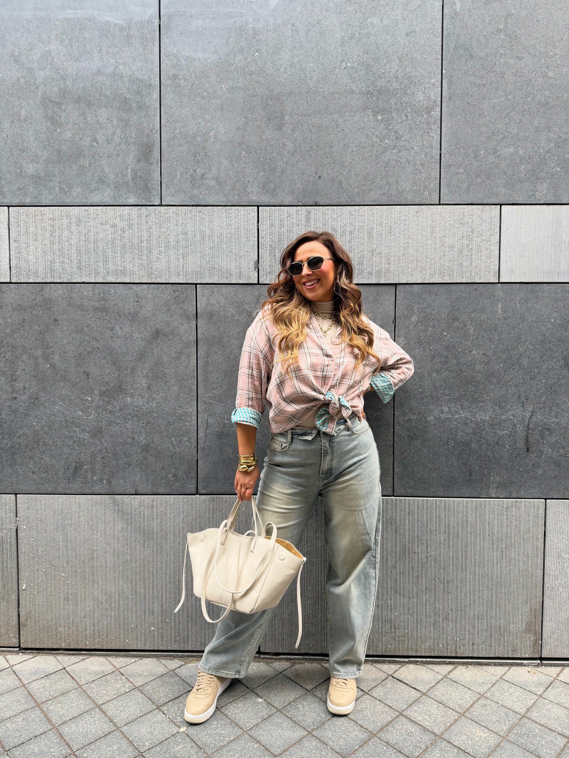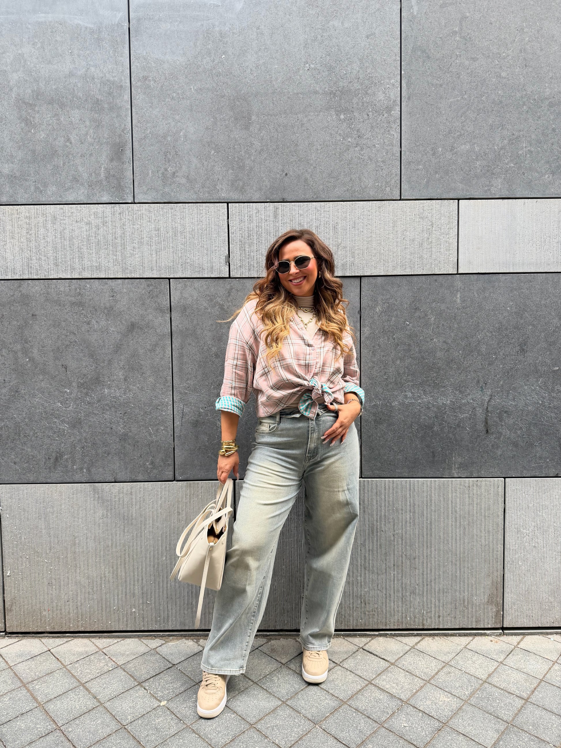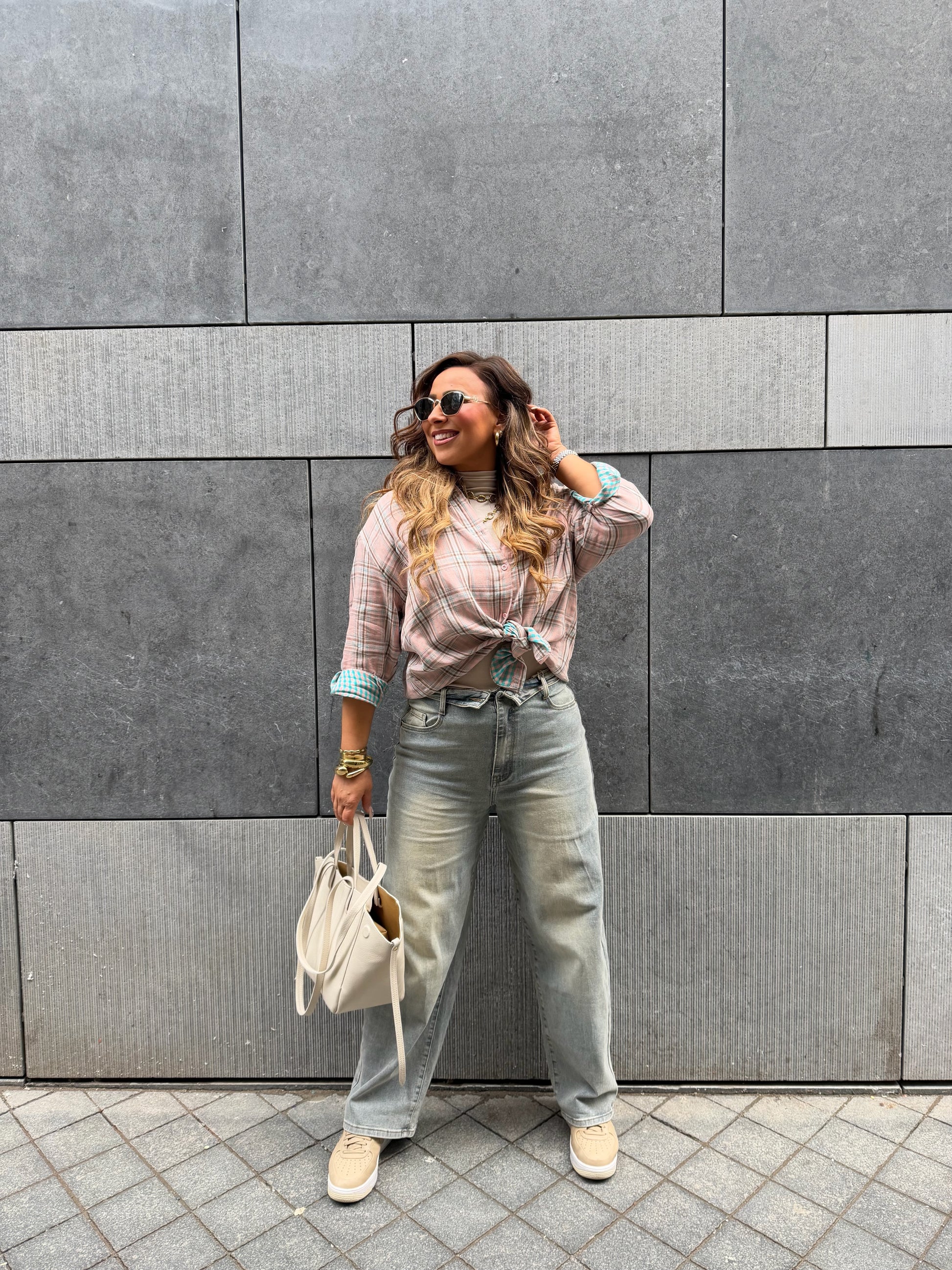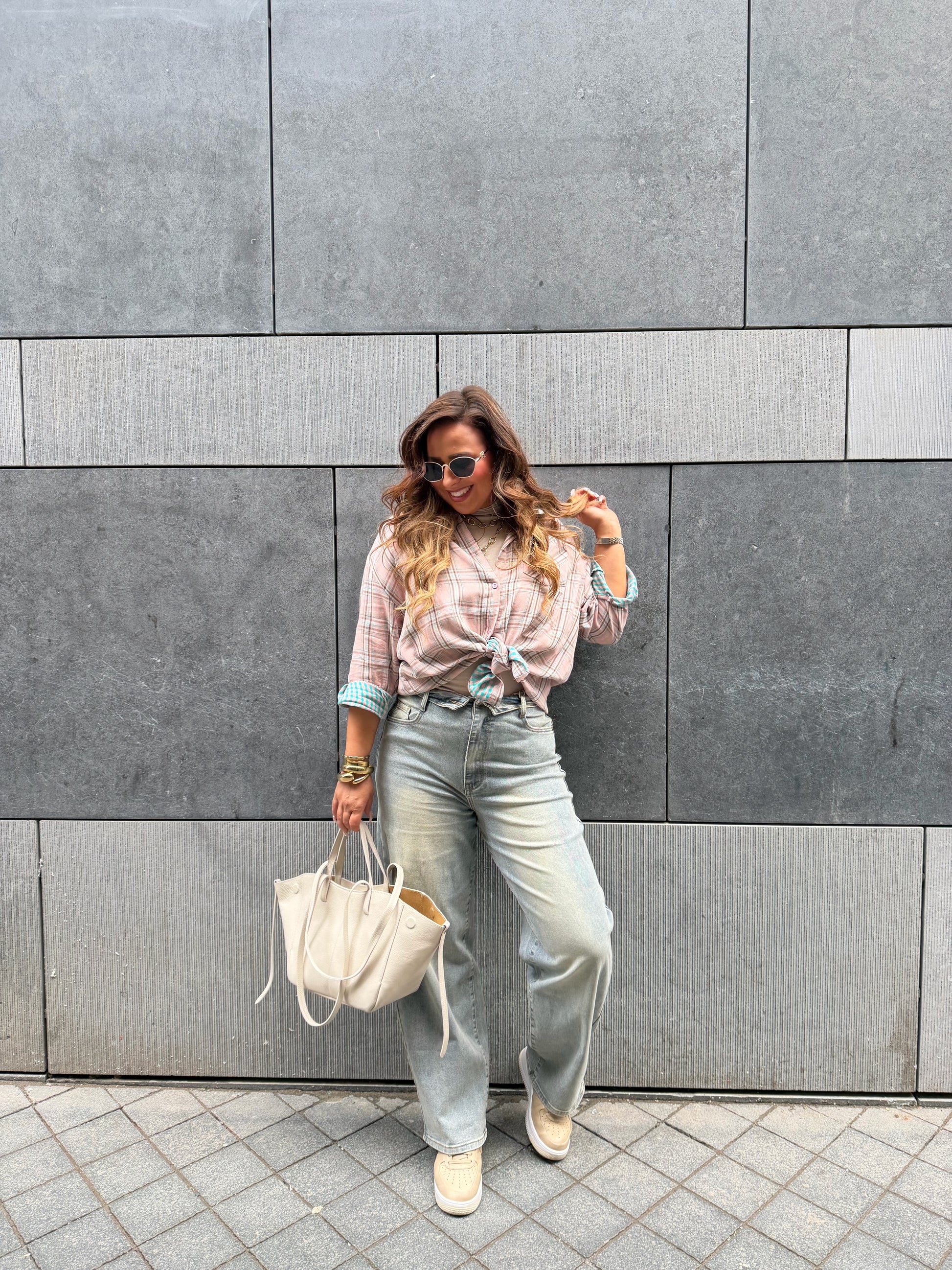 Oversized bloesje die je leuk kan knopen of los in de broek dragen. One size, draagbaar voor de maatjes xs t/m xl.