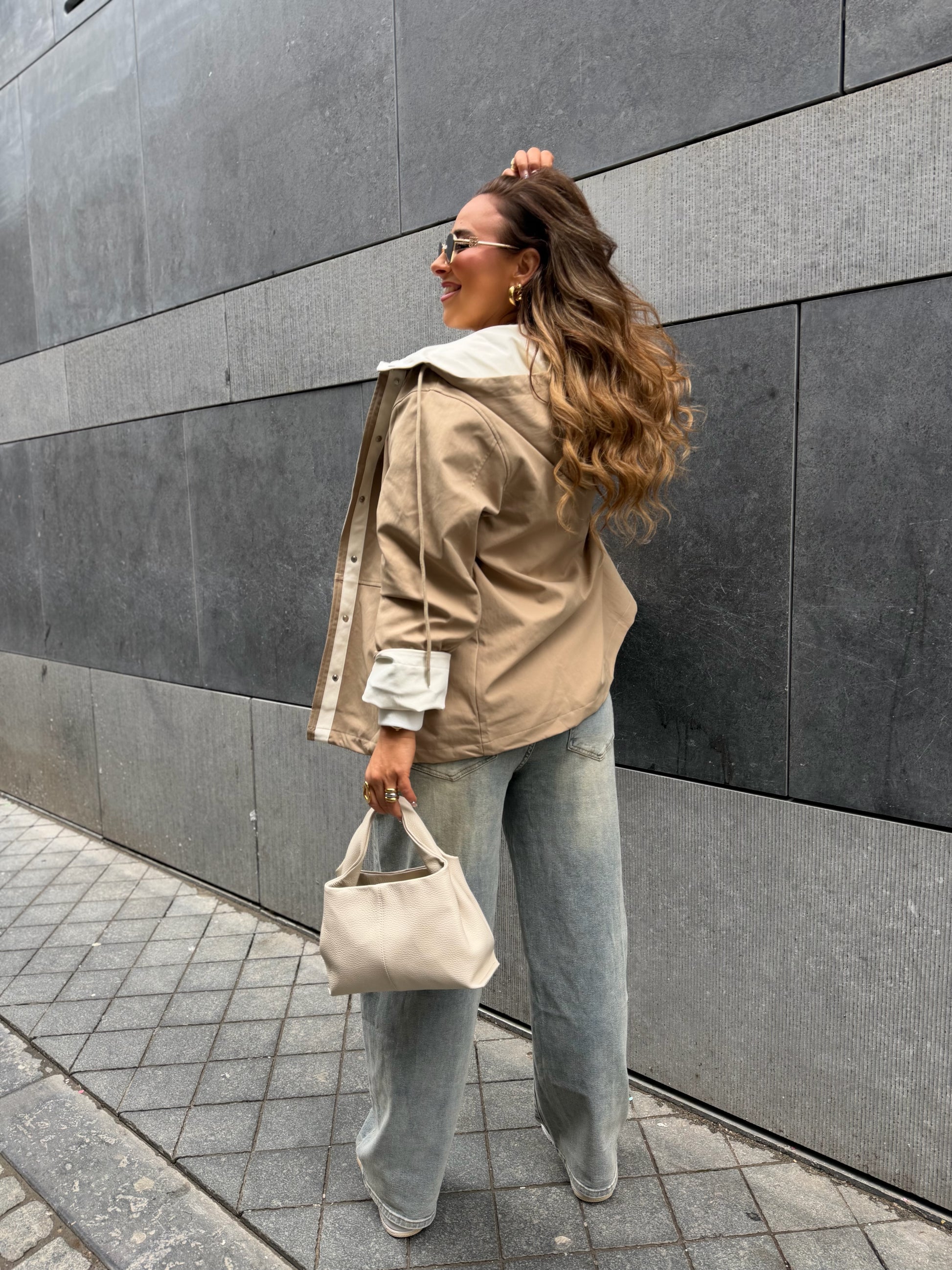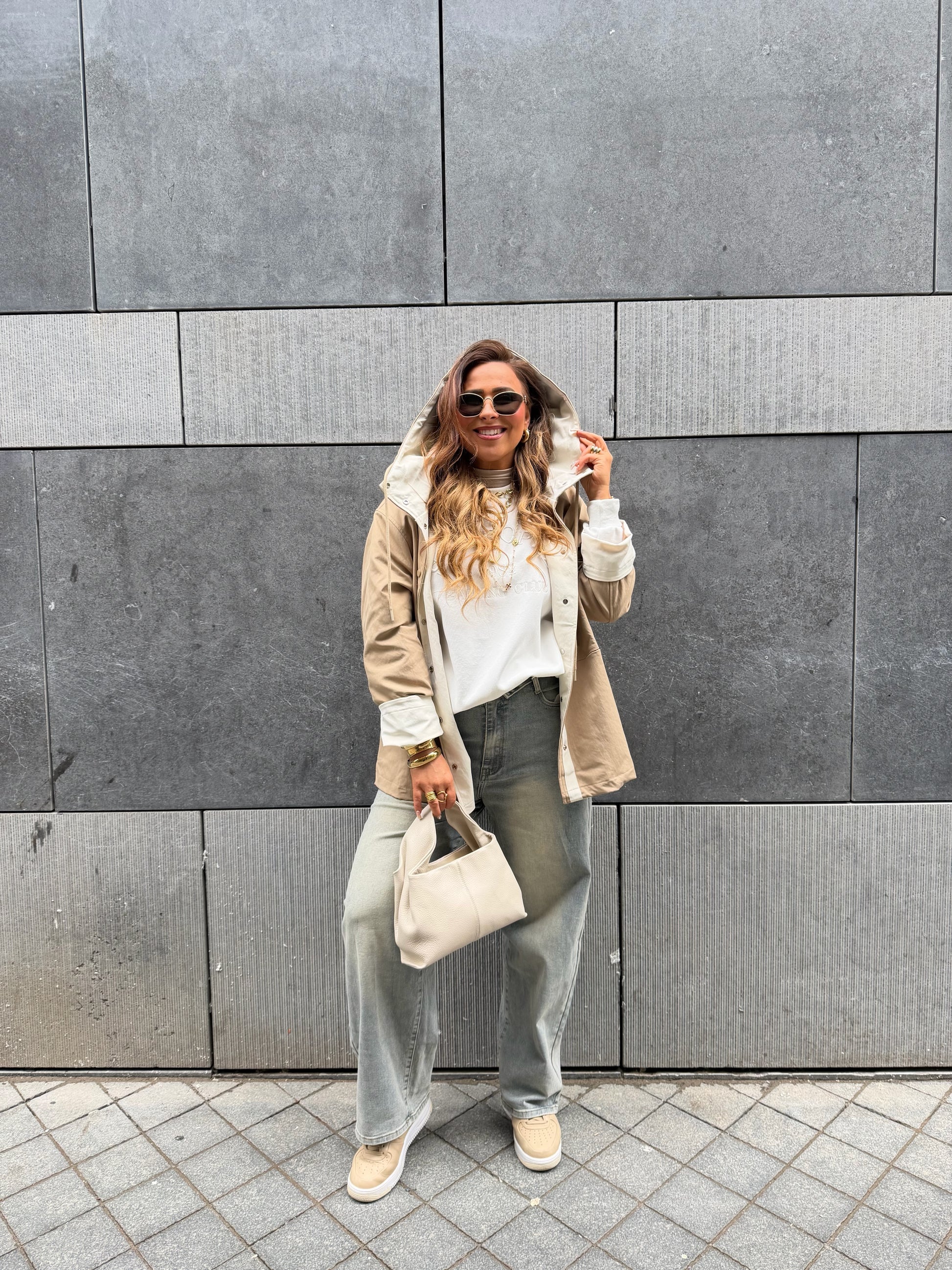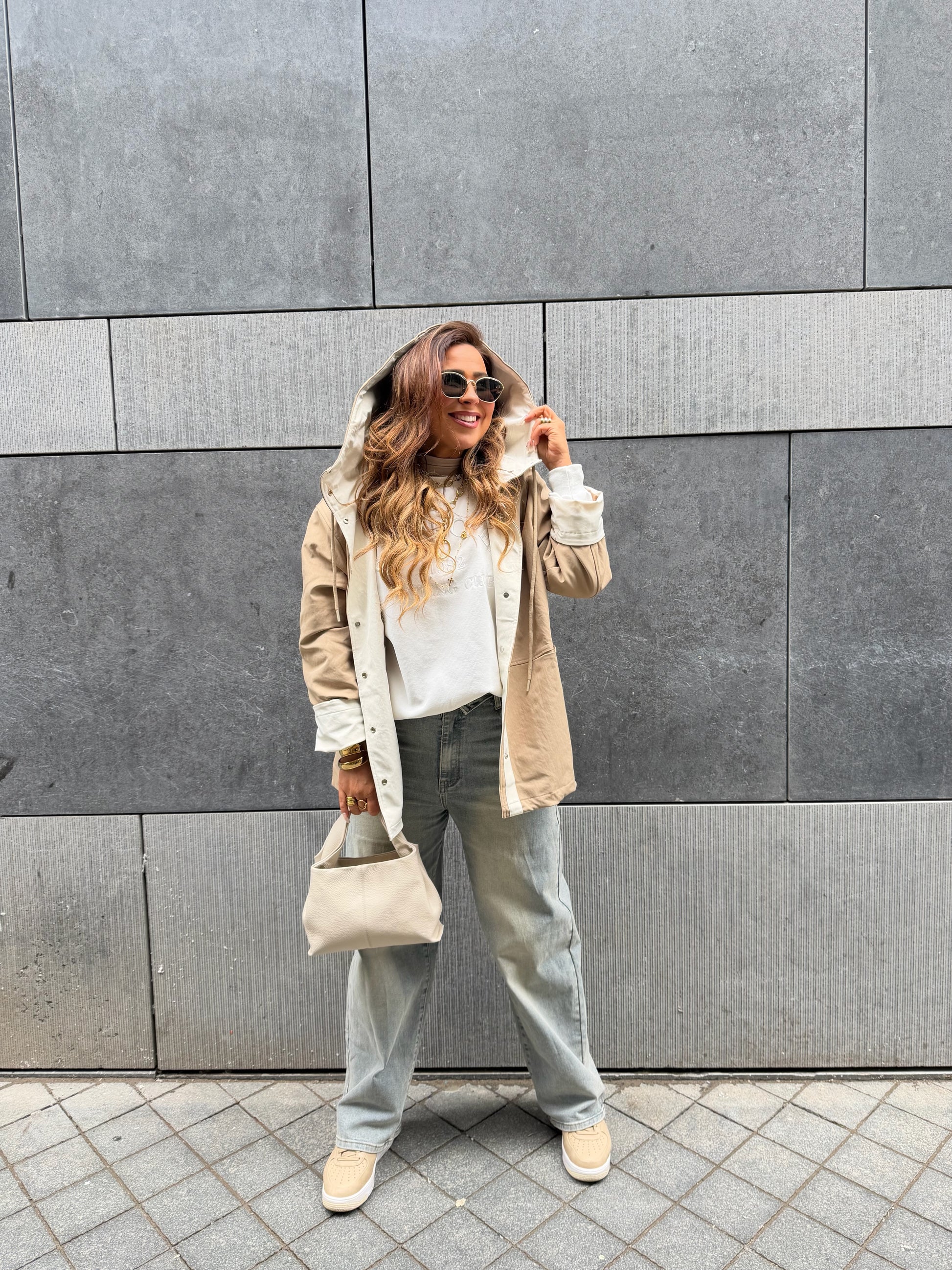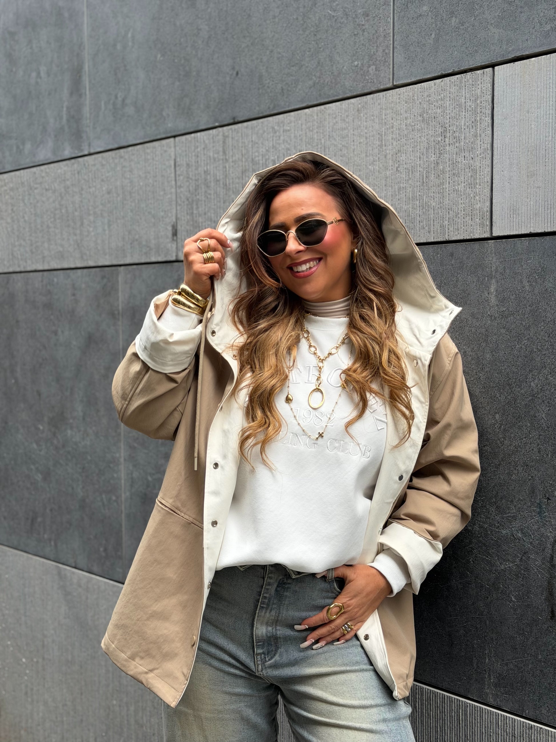 Oversized regenjasje met capuchon. Leuke omslagmouwtjes, zodat je hem 7/8 kan dragen of gewoon omlaag en lang. Valt mooi oversized, ons model is 1.74m lang en draagt maat s/m.