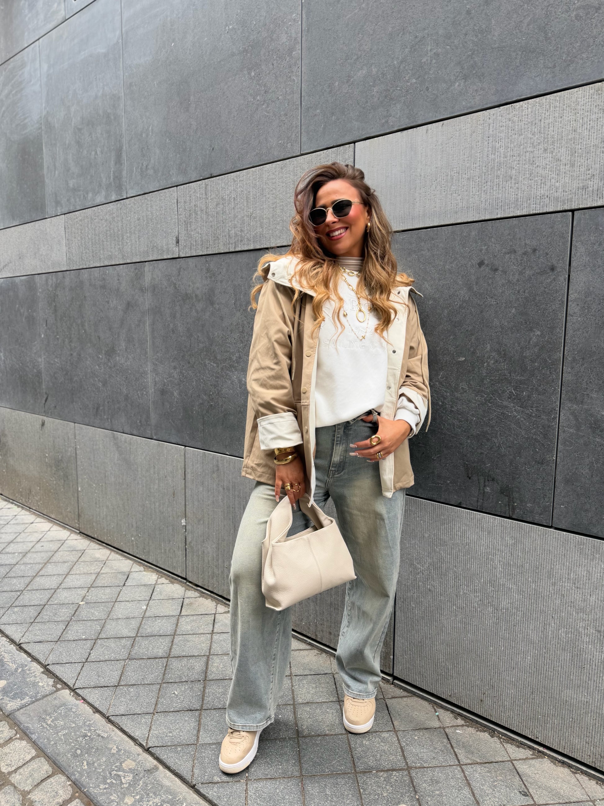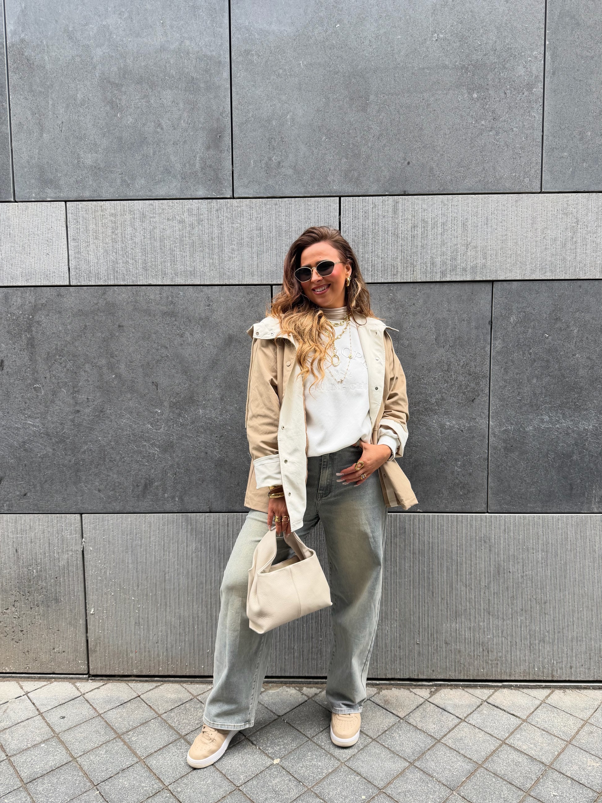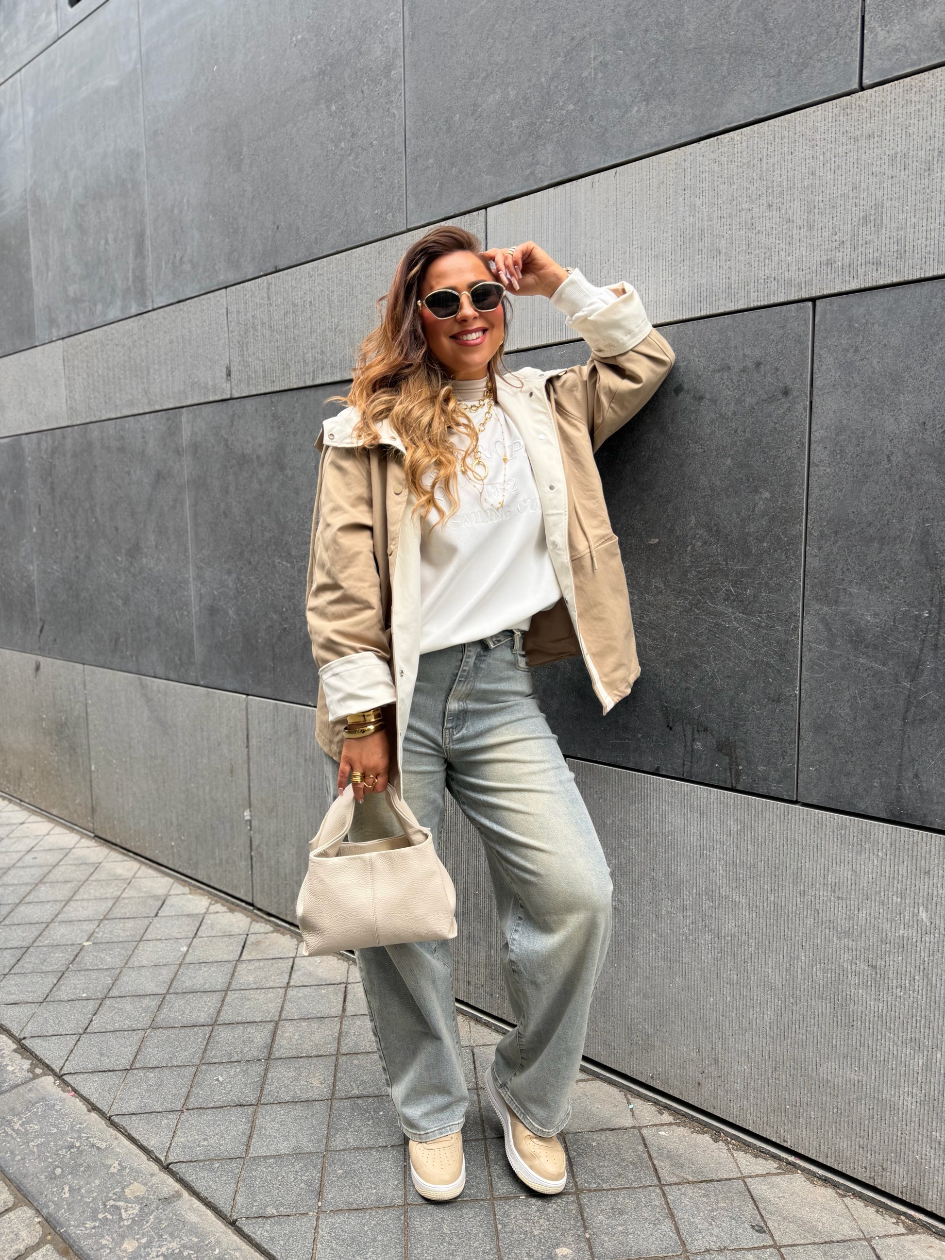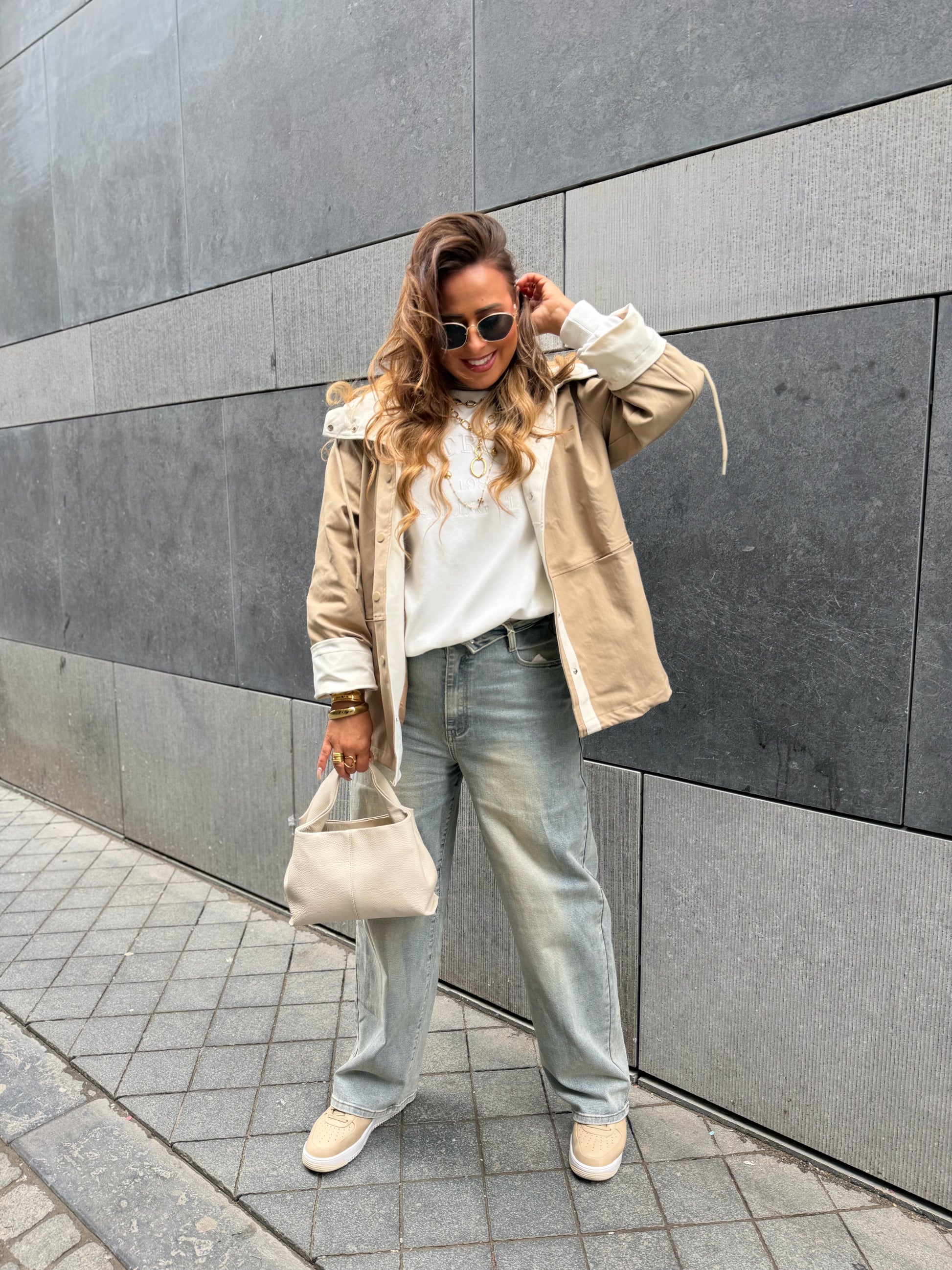 Oversized regenjasje met capuchon. Leuke omslagmouwtjes, zodat je hem 7/8 kan dragen of gewoon omlaag en lang. Valt mooi oversized, ons model is 1.74m lang en draagt maat s/m.