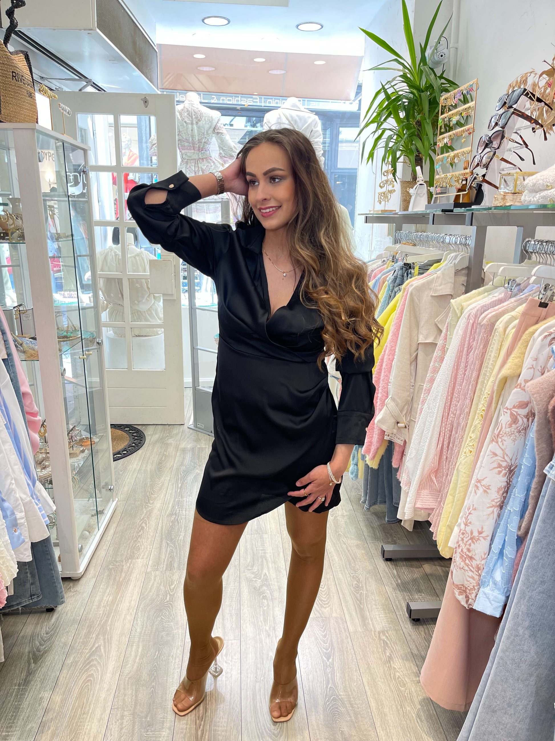 Prachtig satin look jurkje met een kleine v-hals. Valt kleiner uit, ons model is 1.58 lang en draagt maat s/m.
