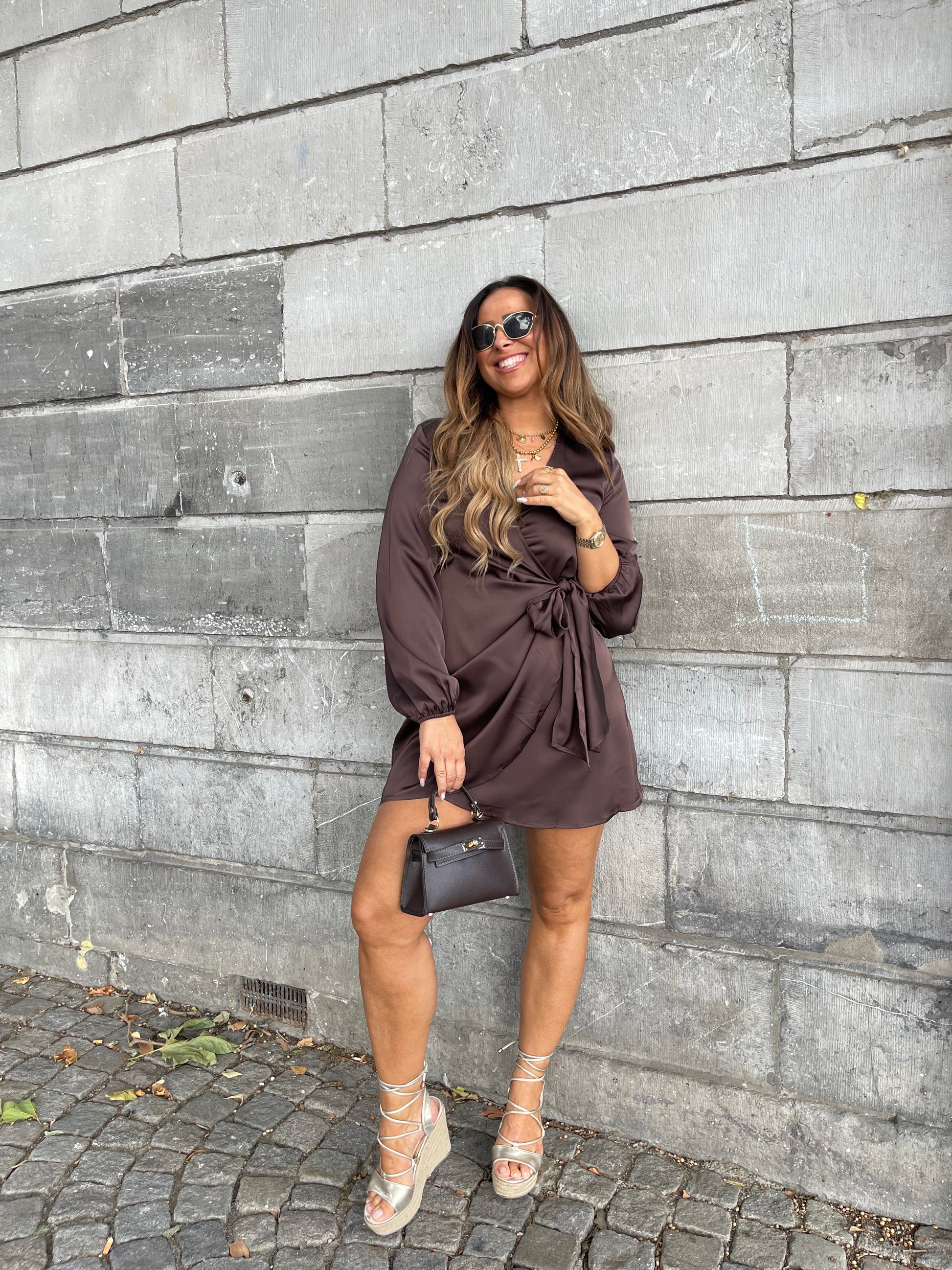 Mooie satijnen wikkeljurk die je heel leuk kan combineren met een hakje. Ideaal voor een avondje uit. Love it. Ons model is 1.74m lang en draagt maat m.