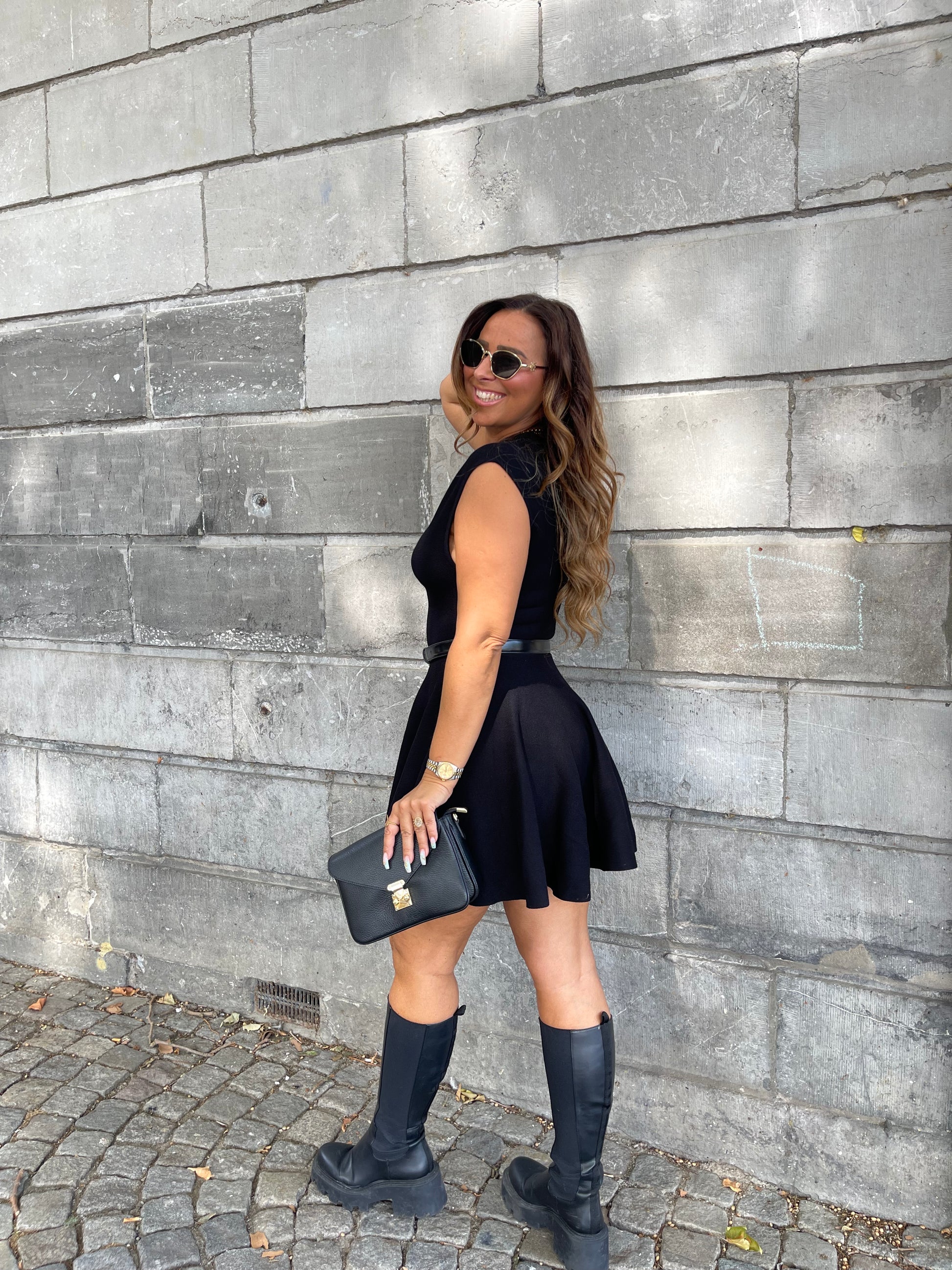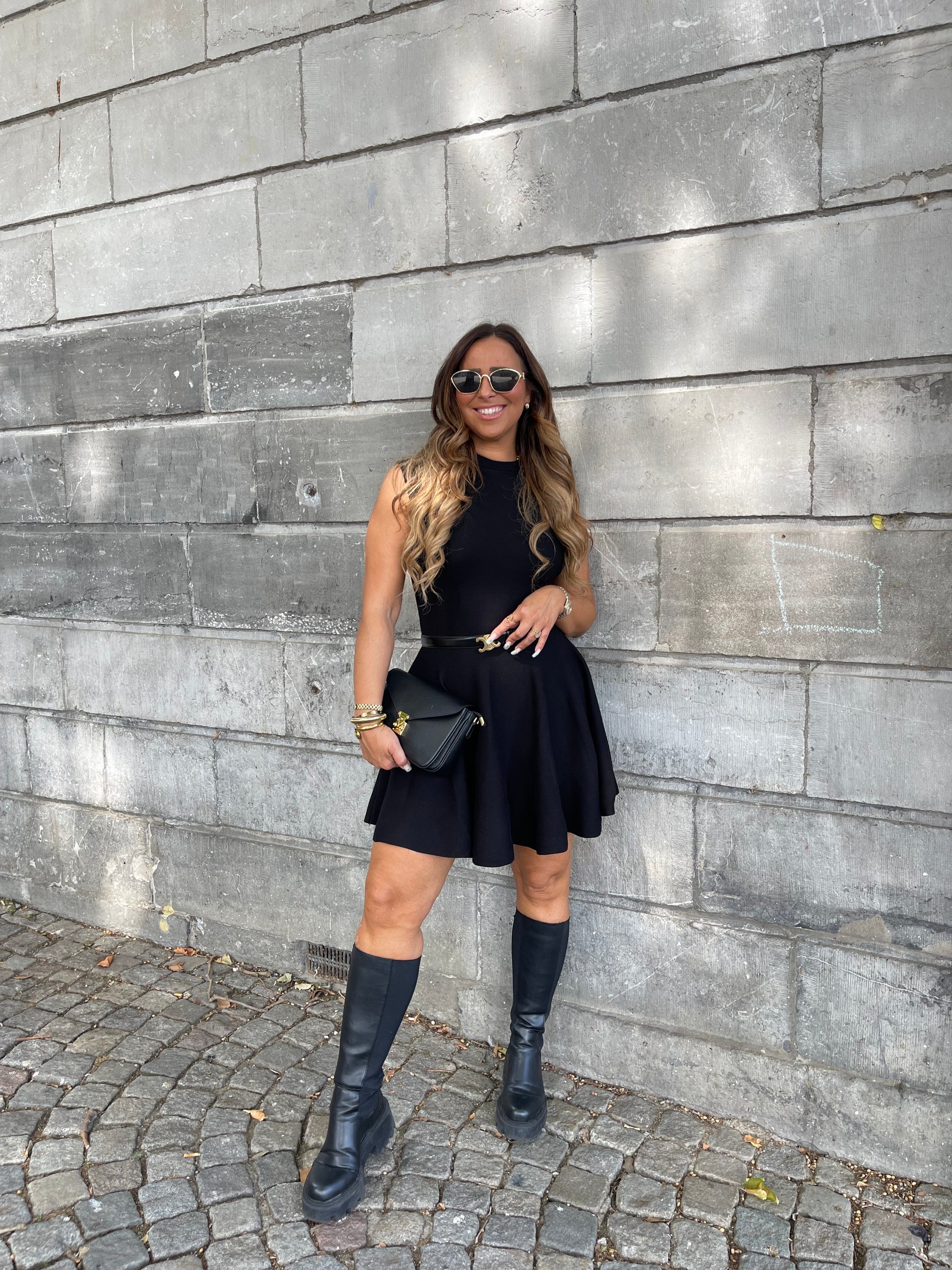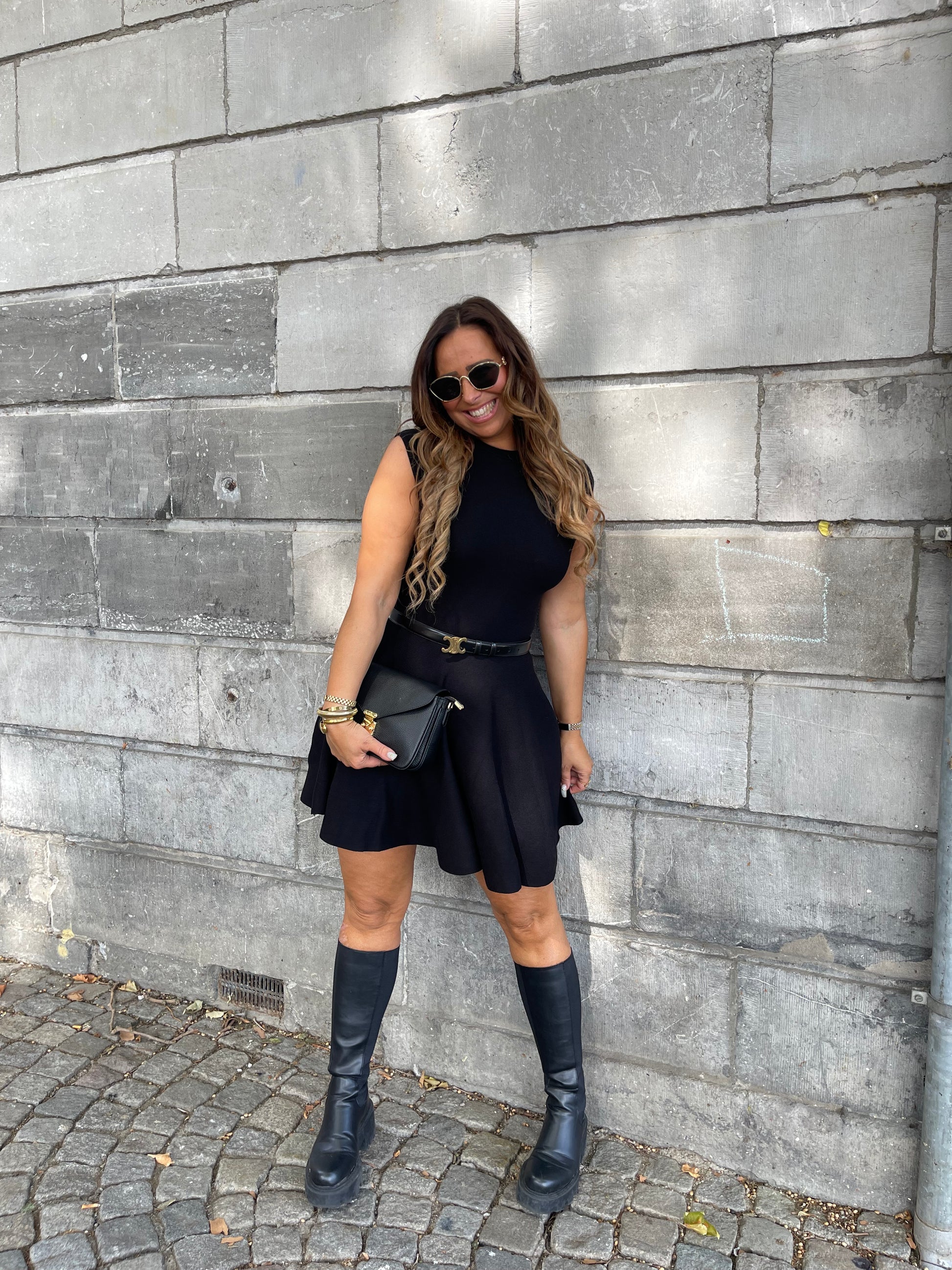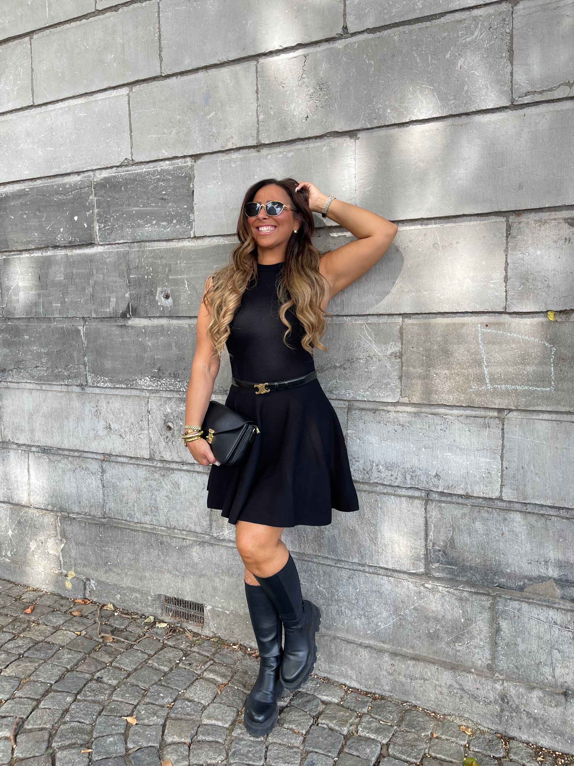Mooie getailleerde jurk die je heel leuk kan combineren met een boot of een sneaker. Ook mega leuk af te stylen met een lederen jasje. Ons model is 1.74m lang en draagt maat m/l.