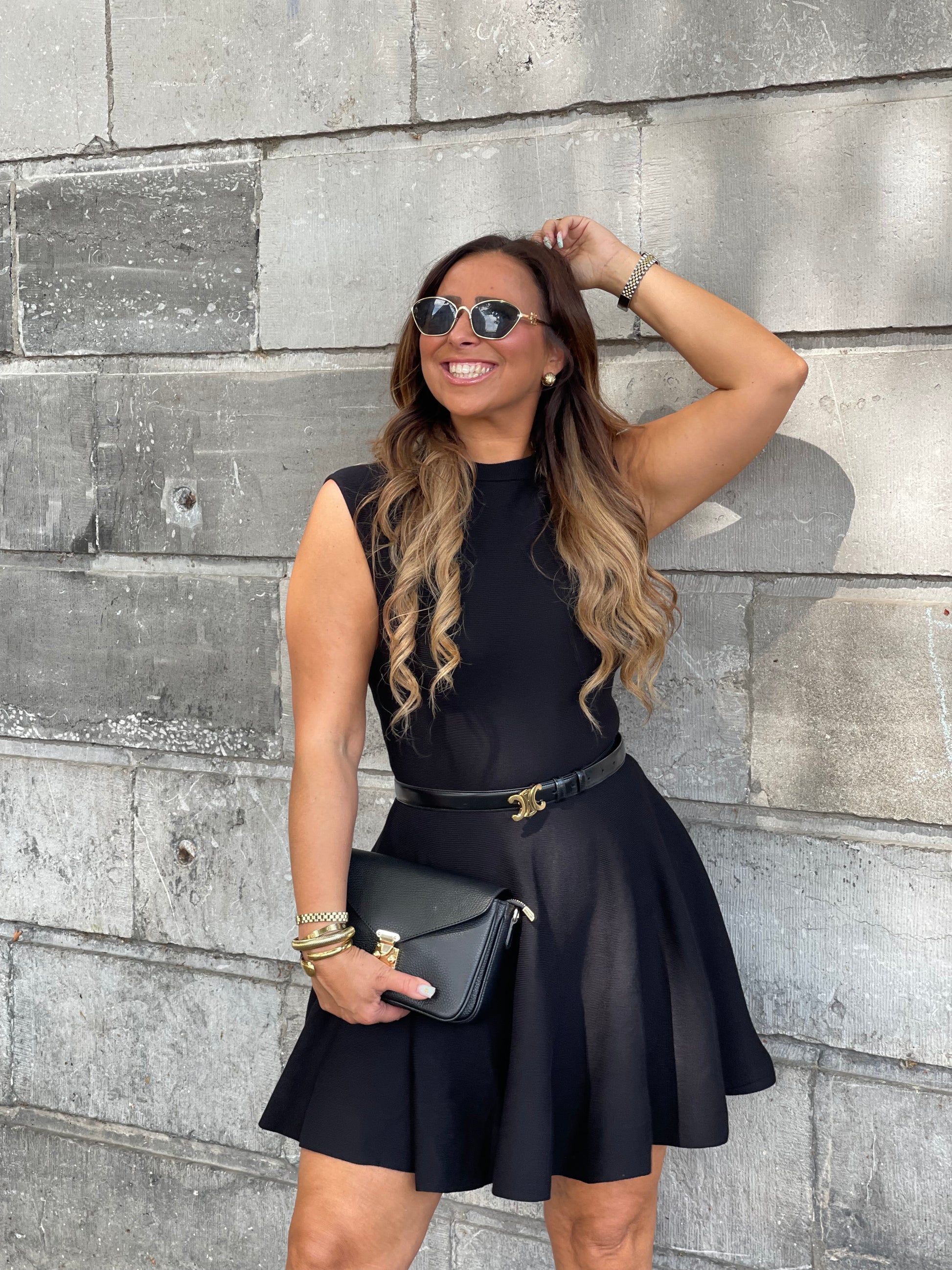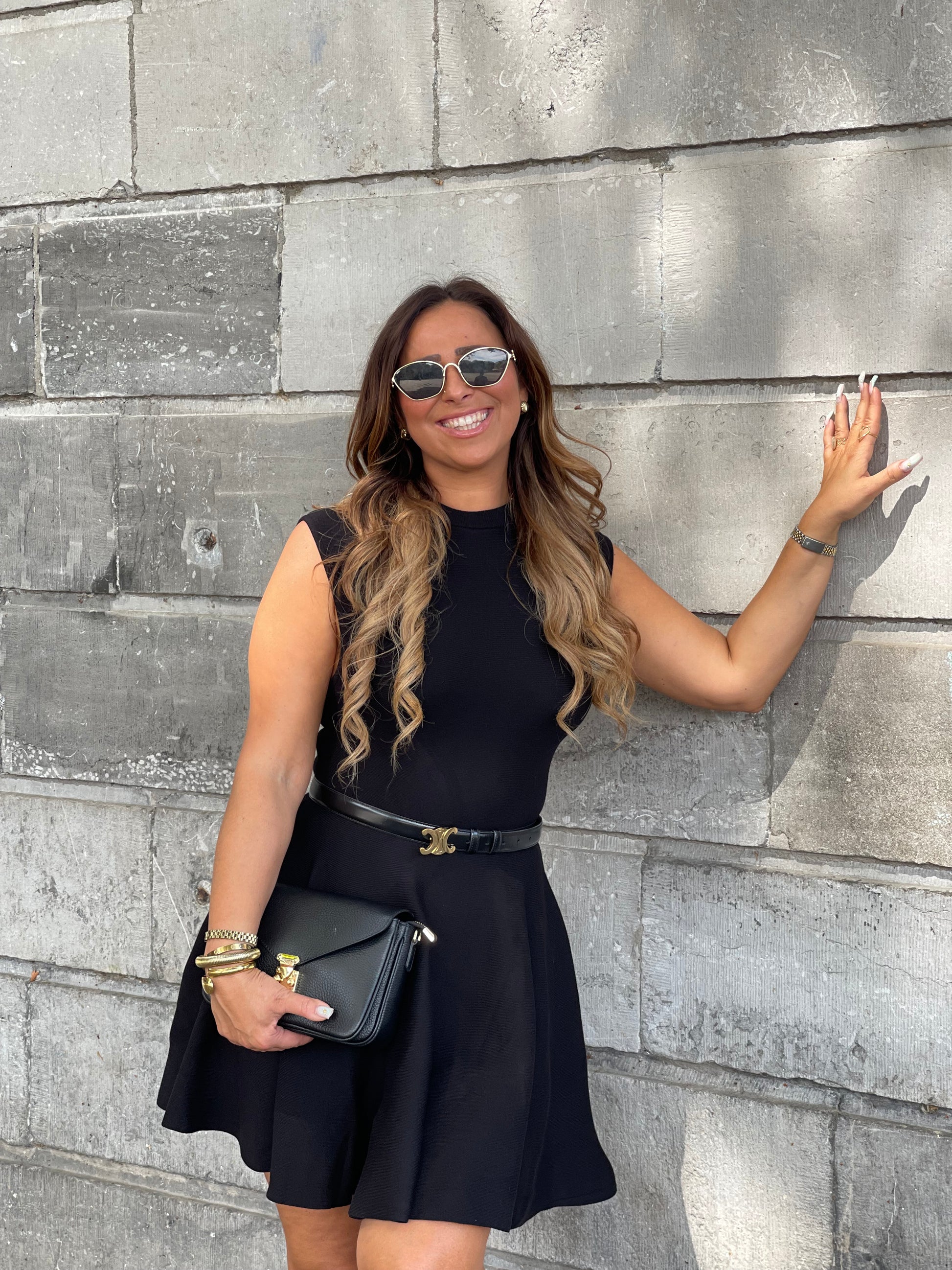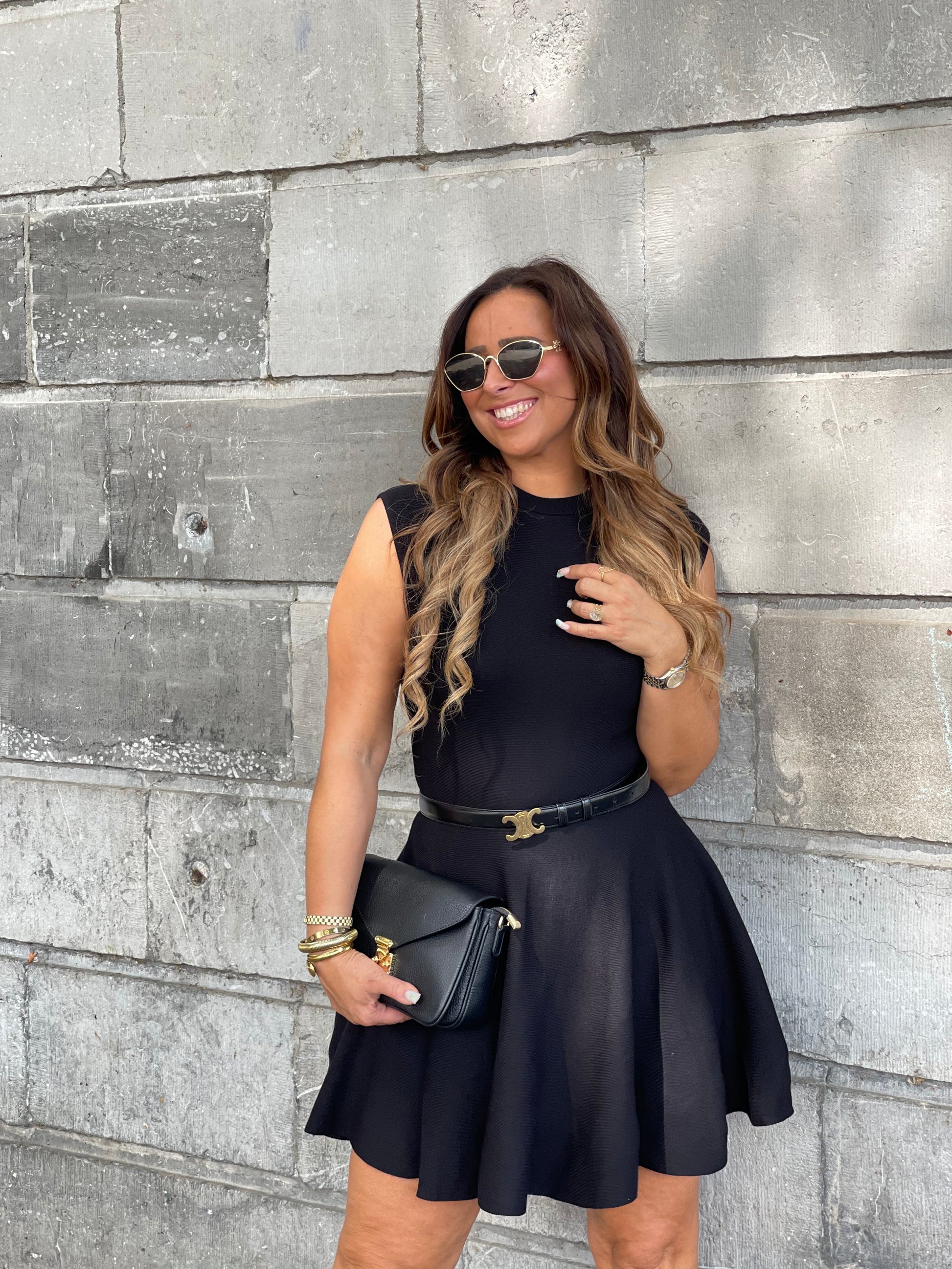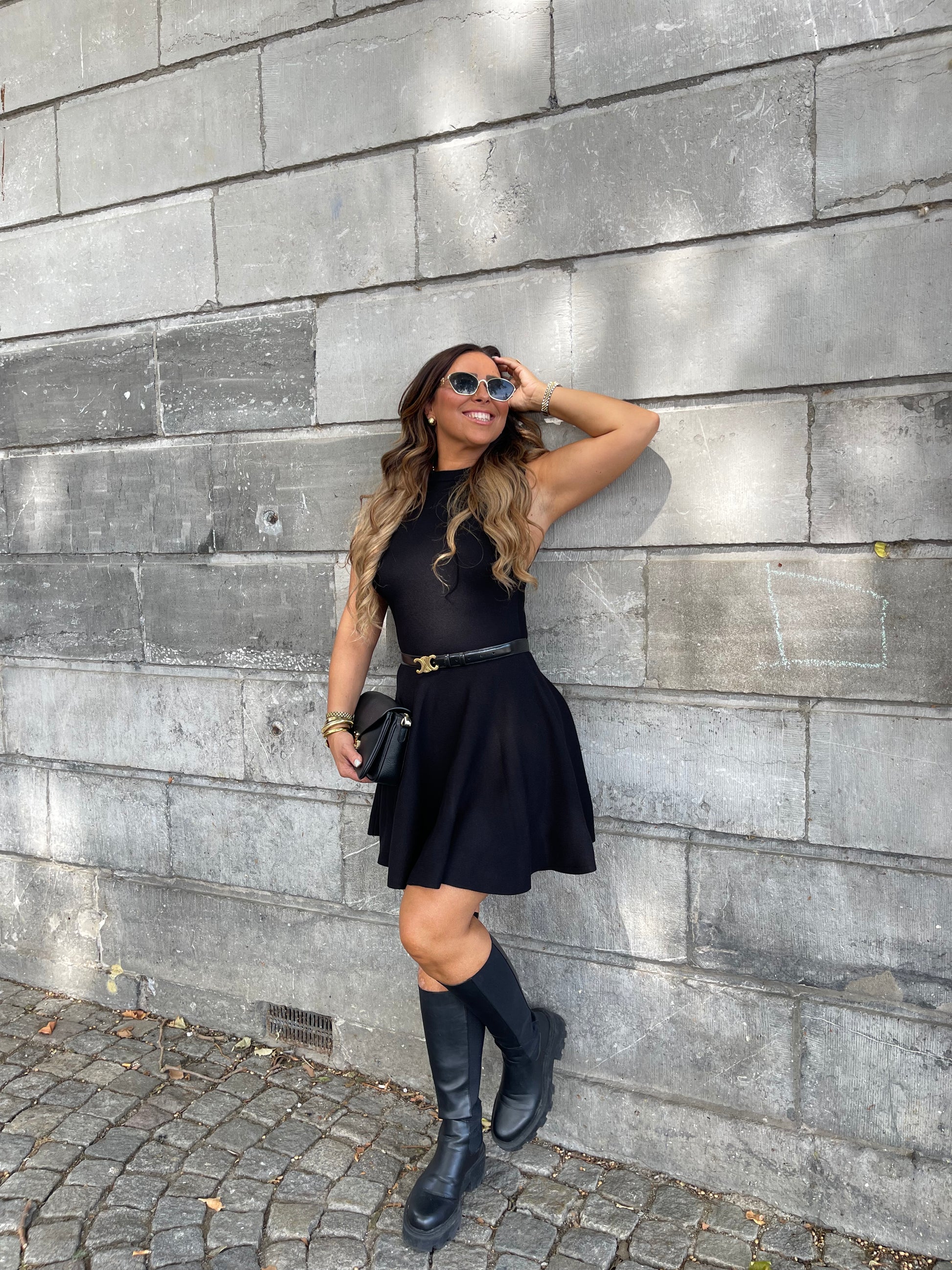 Mooie getailleerde jurk die je heel leuk kan combineren met een boot of een sneaker. Ook mega leuk af te stylen met een lederen jasje. Ons model is 1.74m lang en draagt maat m/l.