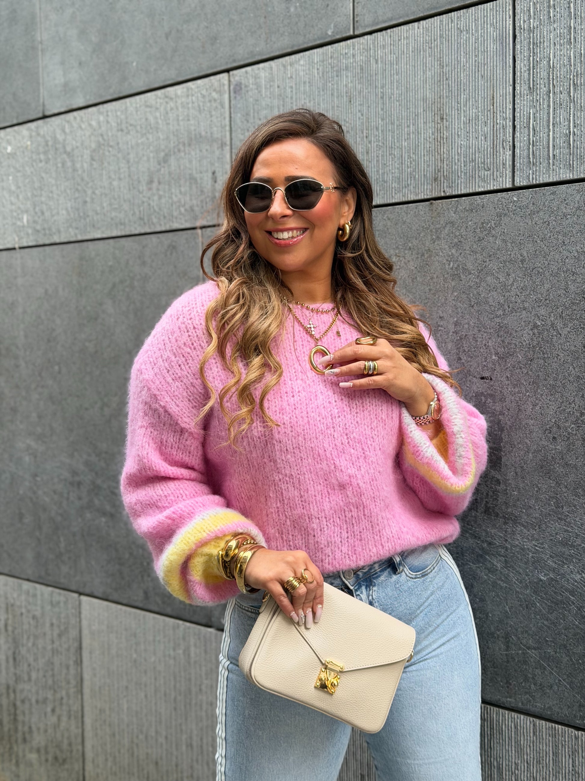 Super cute sweater met leuke streepjes details op de mauw. One size, draagbaar voor de maatjes xs t/m xl. De sweater bevat een klein beetje wol, let op op de hand wassen niet in de machine.