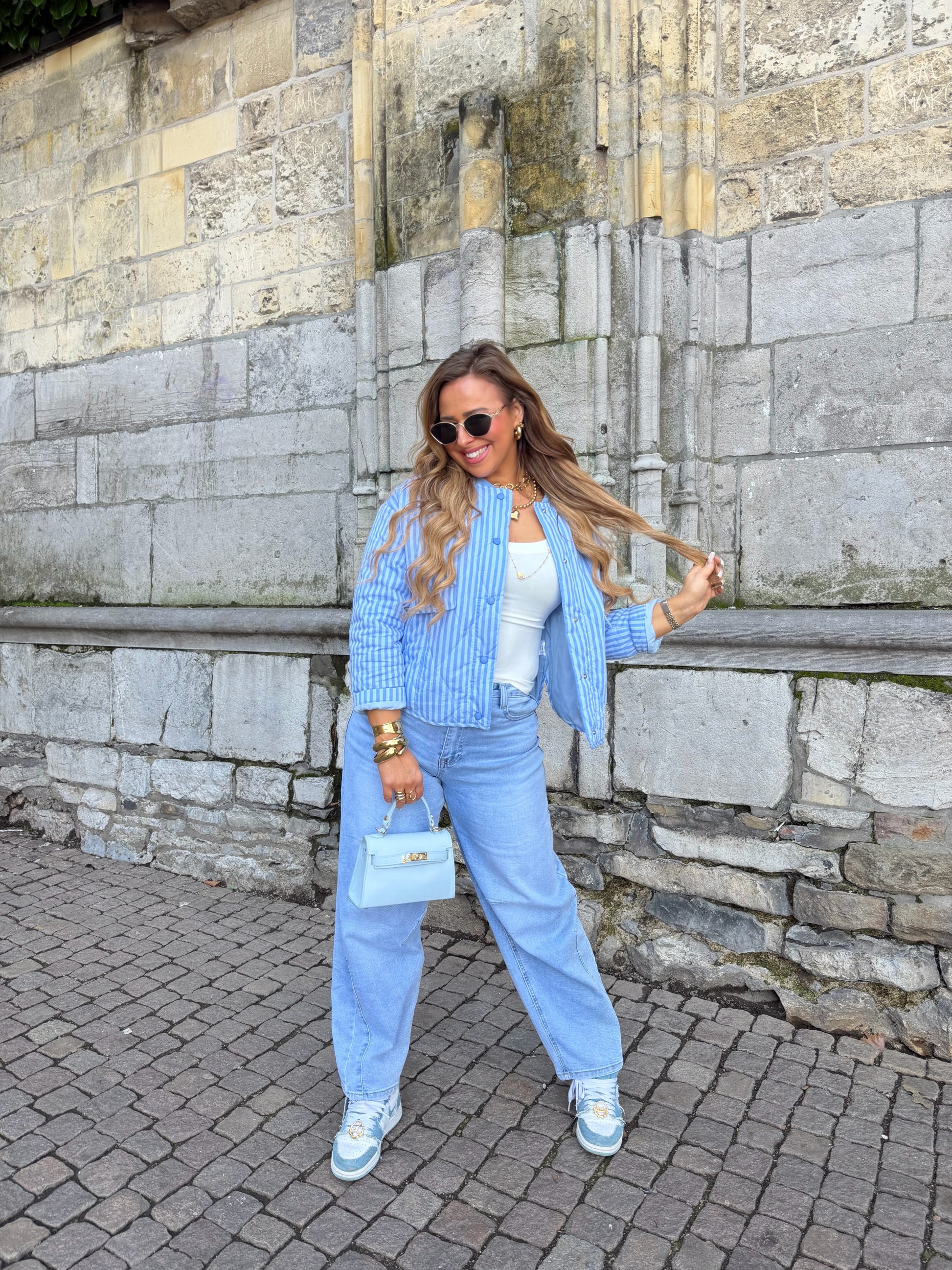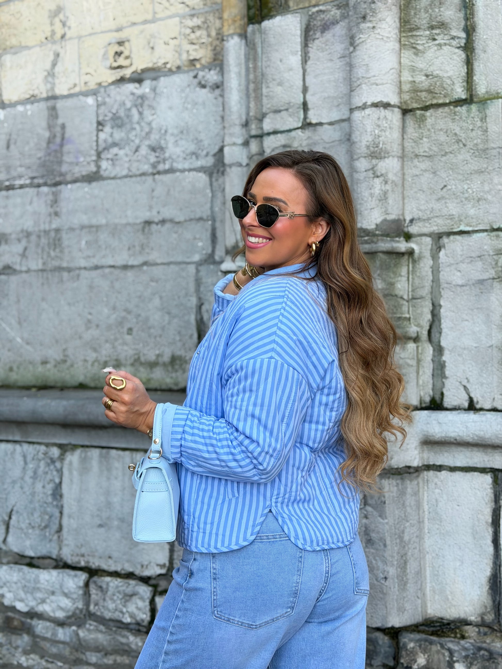 Mooi oversized jasje met leuke streepjes details. Ons model is 1.74m lang en draagt maat m/l.
