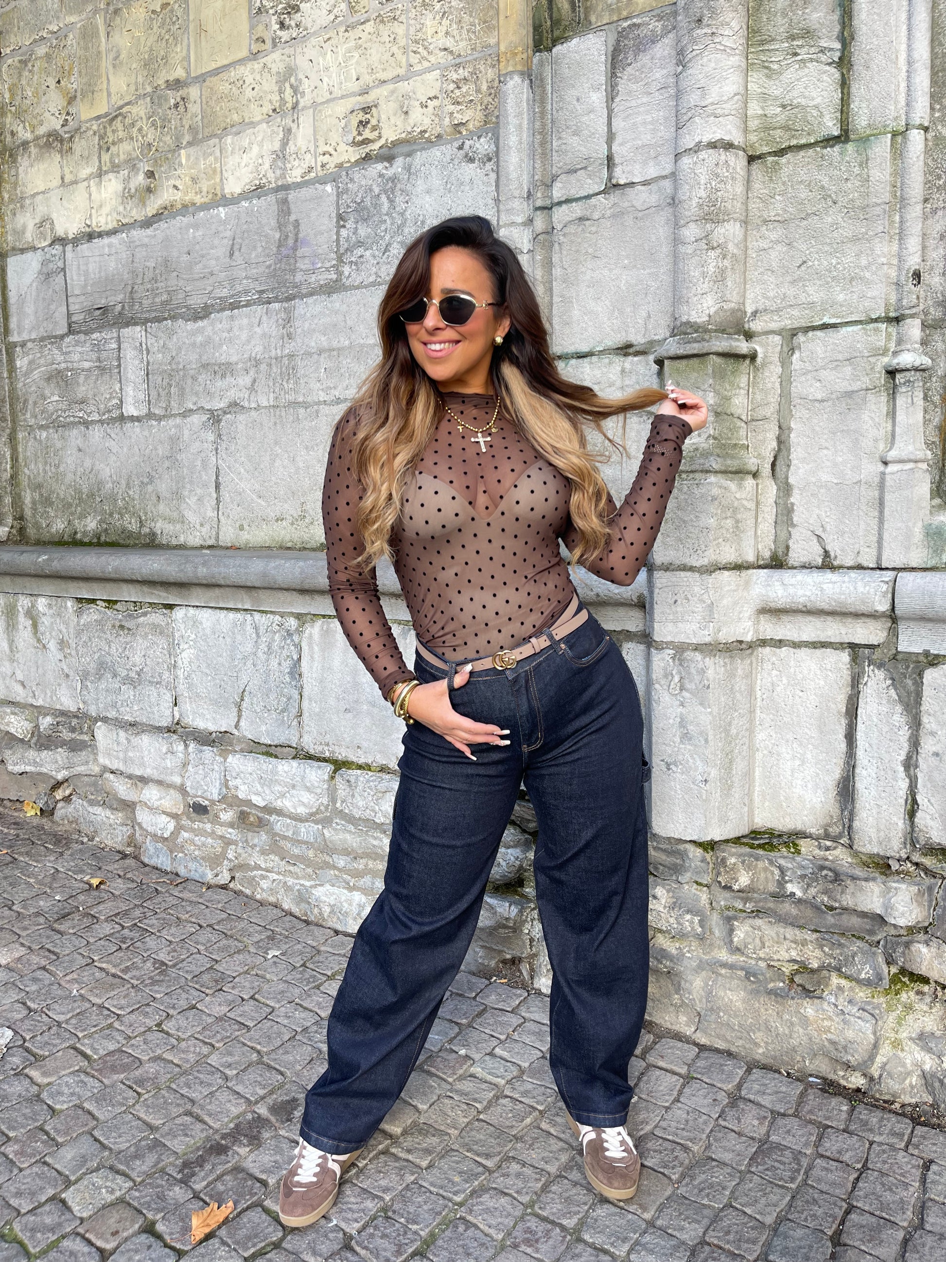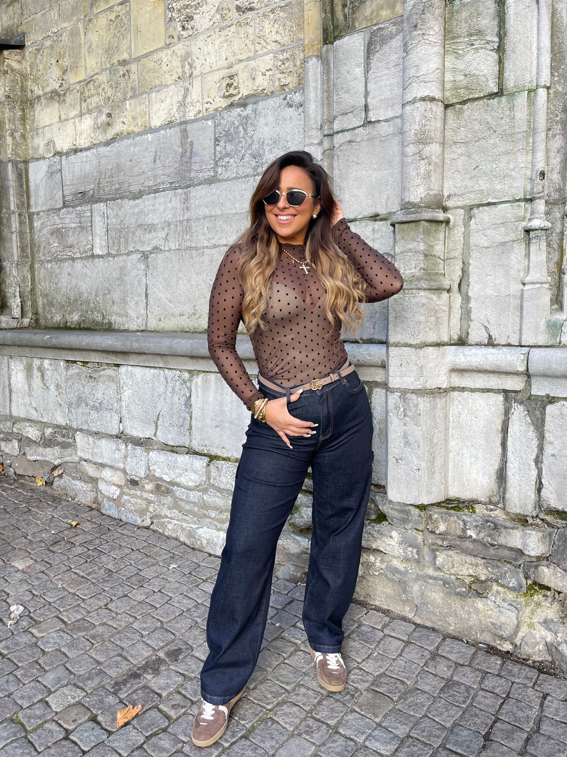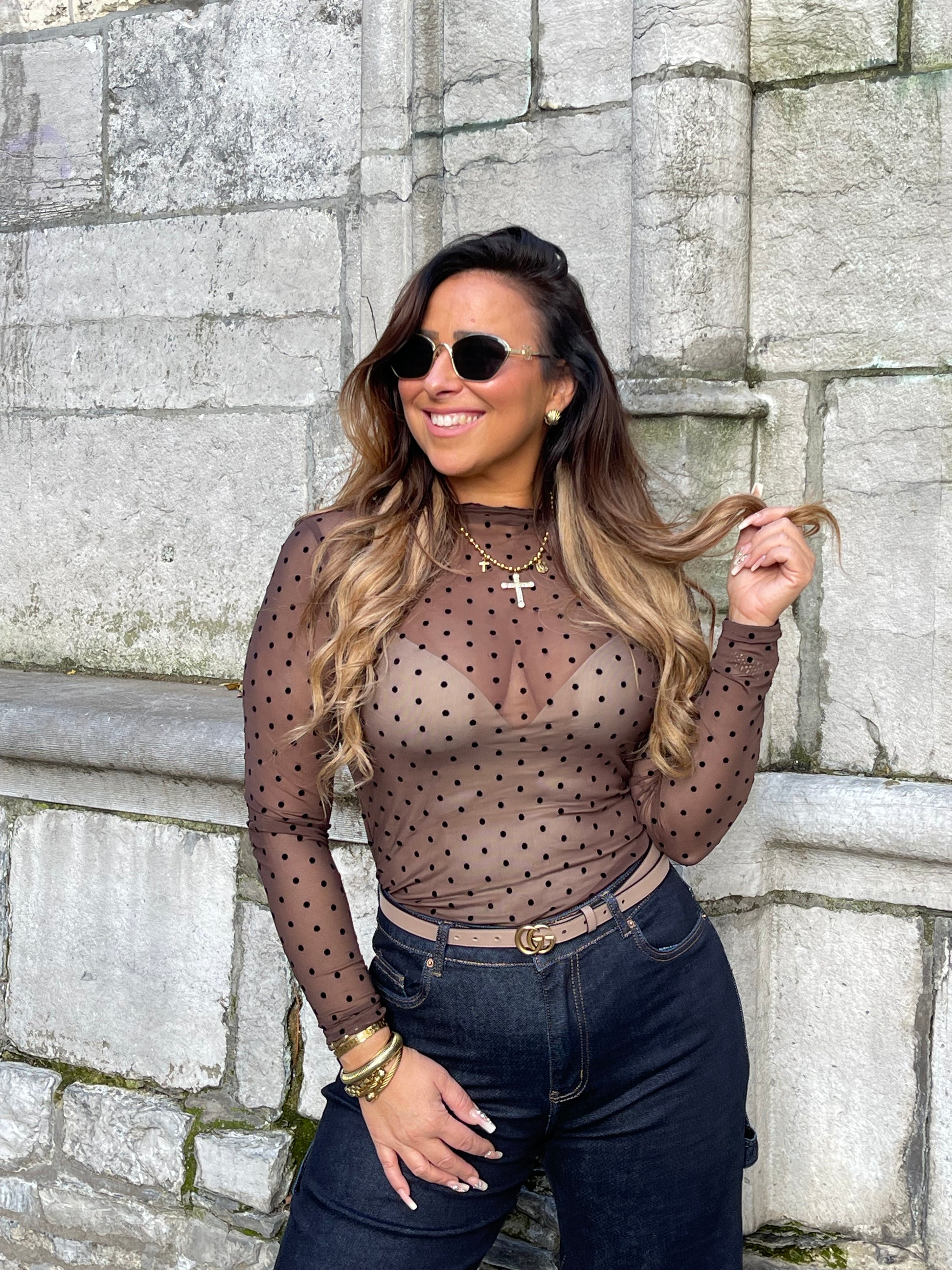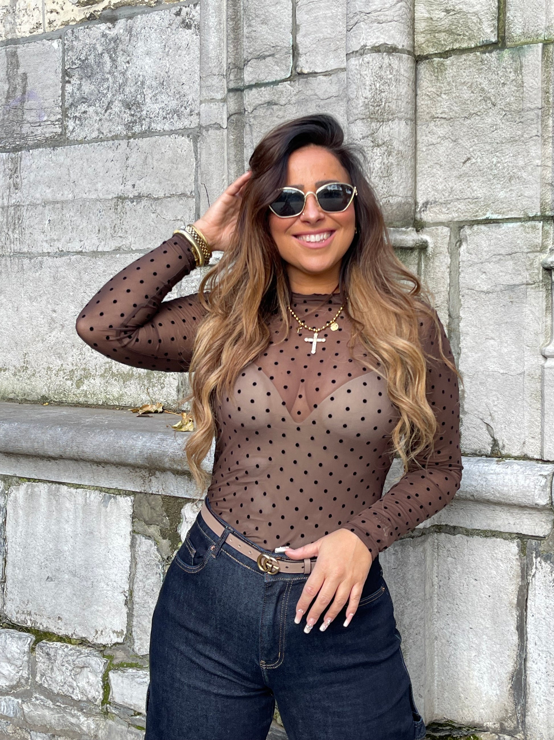 Basic see trough top met stipjes. Leuk onder een blazer te dragen en in combi met een jeans is je lookje helemaal af.