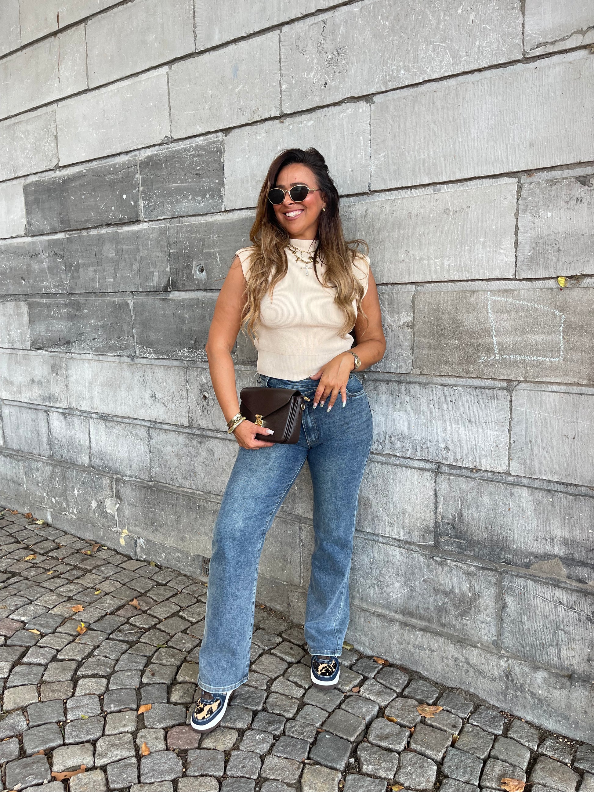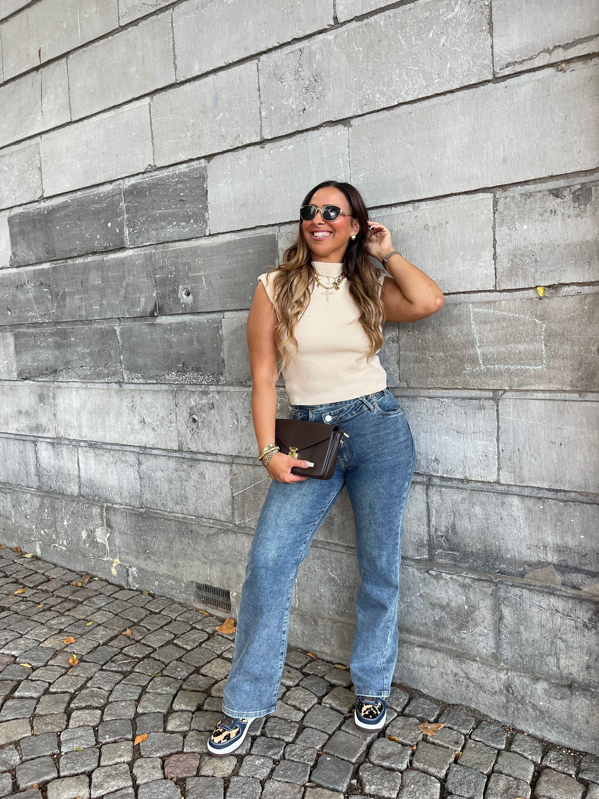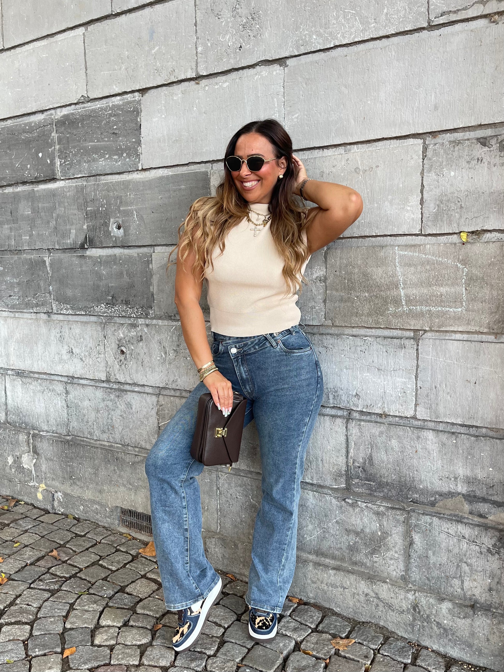High waist straigt jeans met stretch die schuin afloopt aan de voorkant bij de rits/kruis. Valt goed op maat, ons model is 1.58m lang en draagt maat 36.