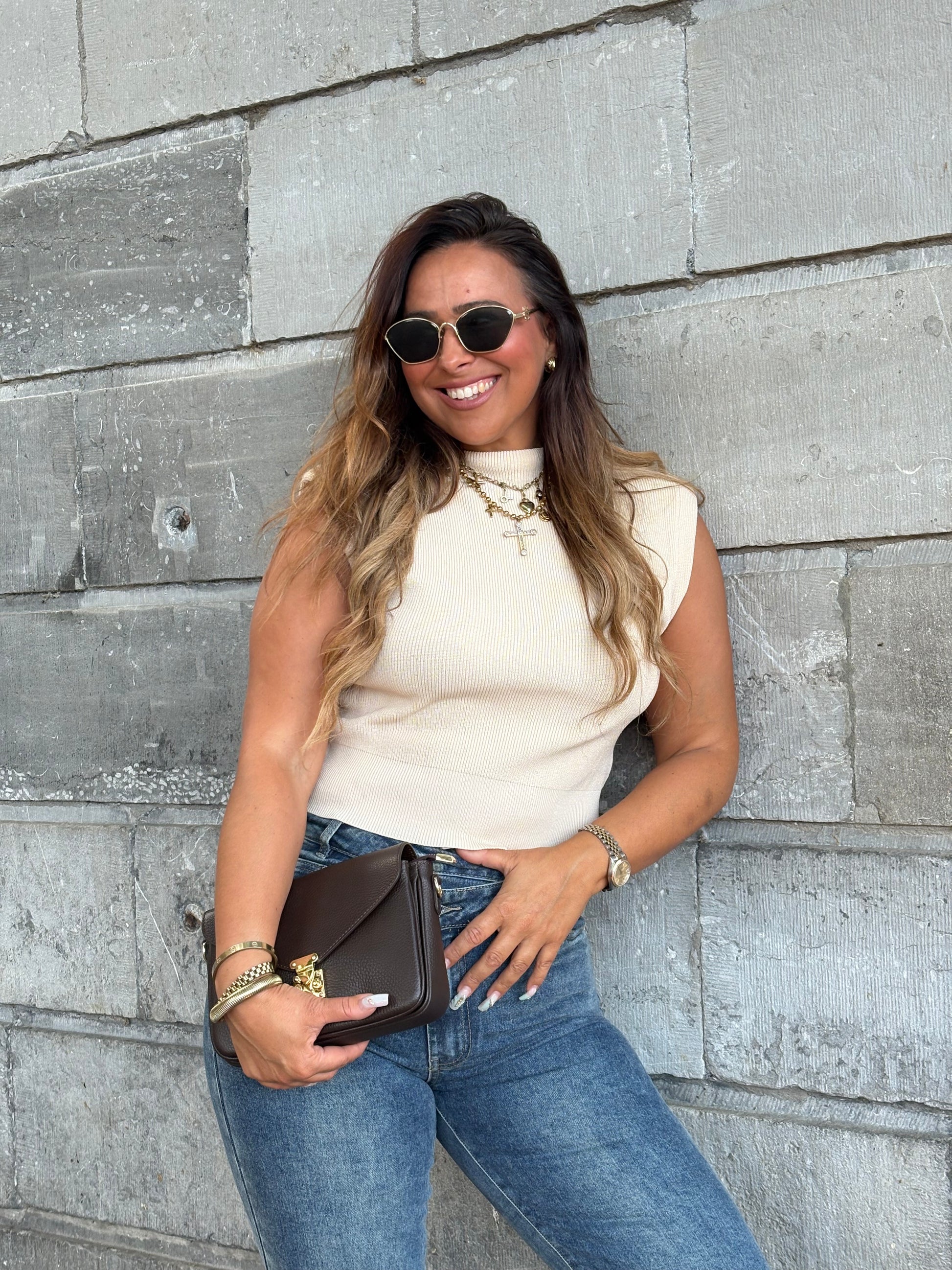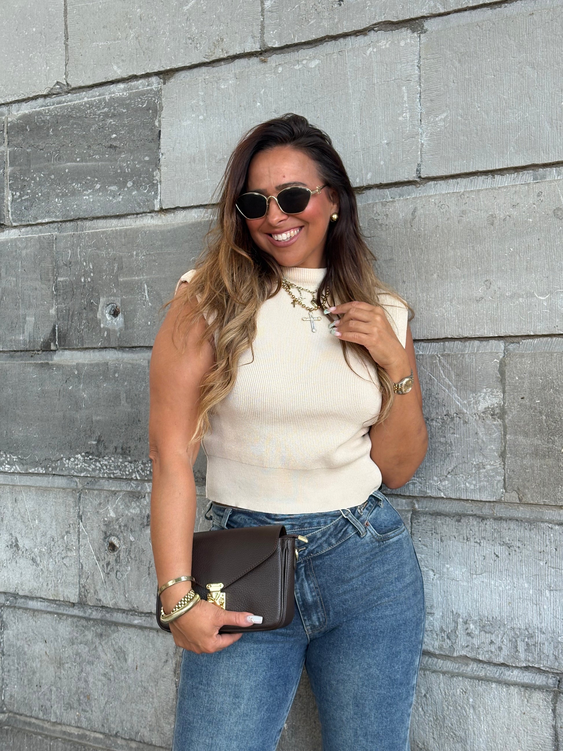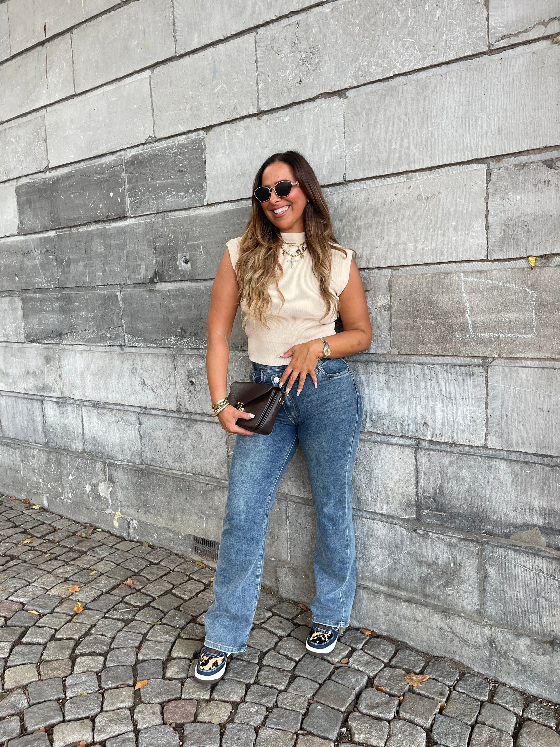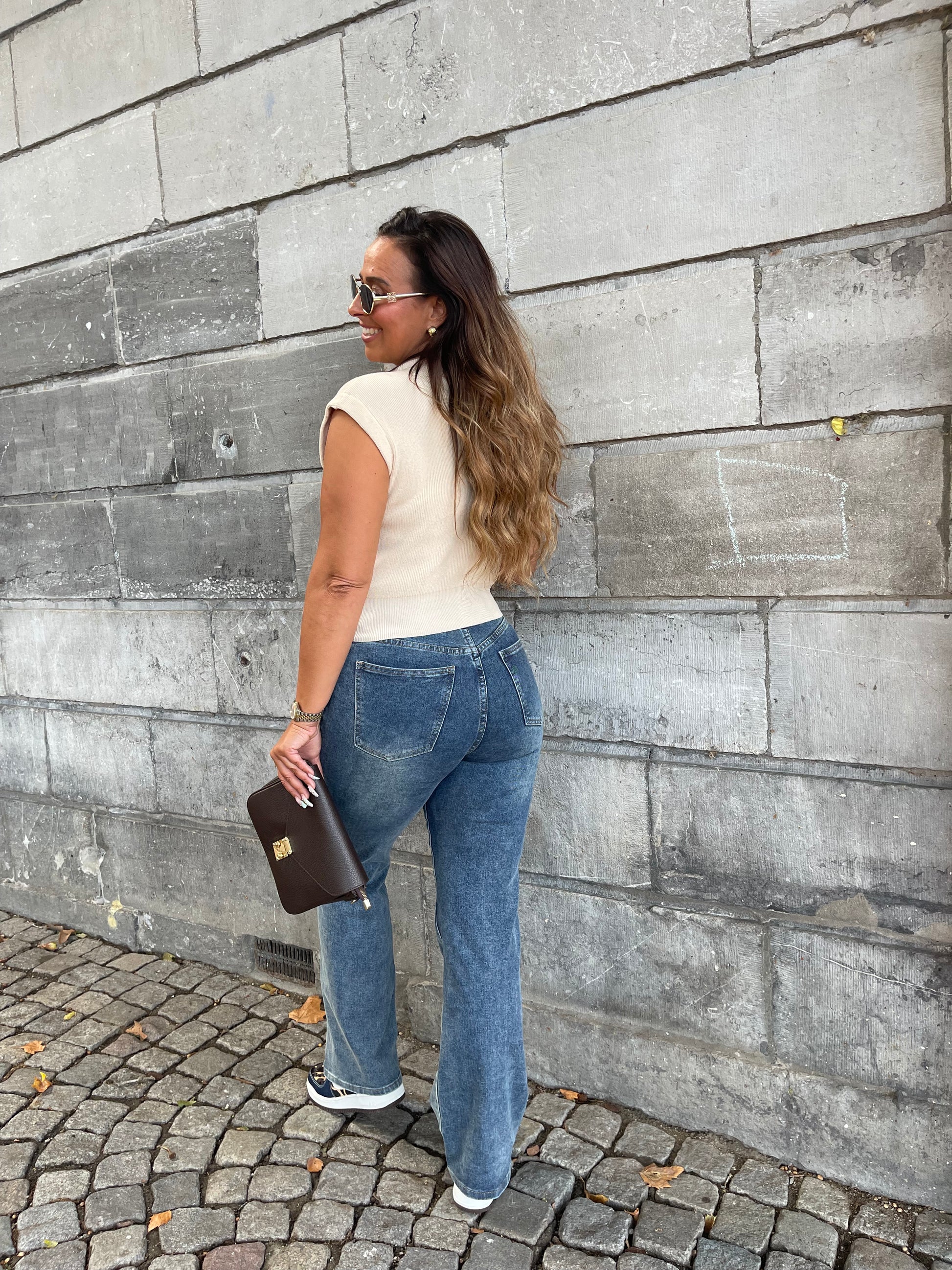 High waist straigt jeans met stretch die schuin afloopt aan de voorkant bij de rits/kruis. Valt goed op maat, ons model is 1.58m lang en draagt maat 36.
