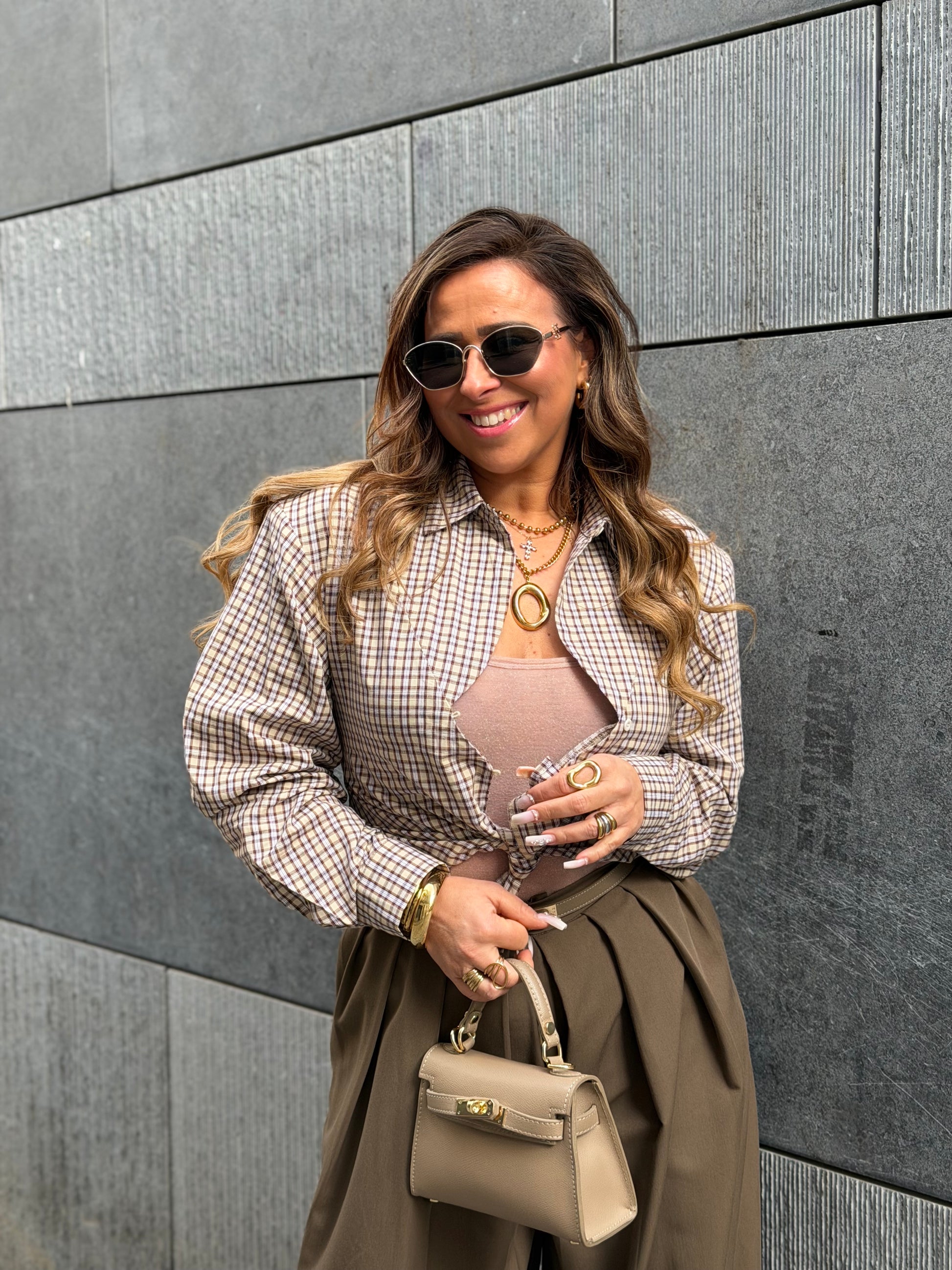 Cute geblokt bloesje die je heel mooi zowel open als dicht kan dragen. Valt klein, ons model draagt maat m/l.