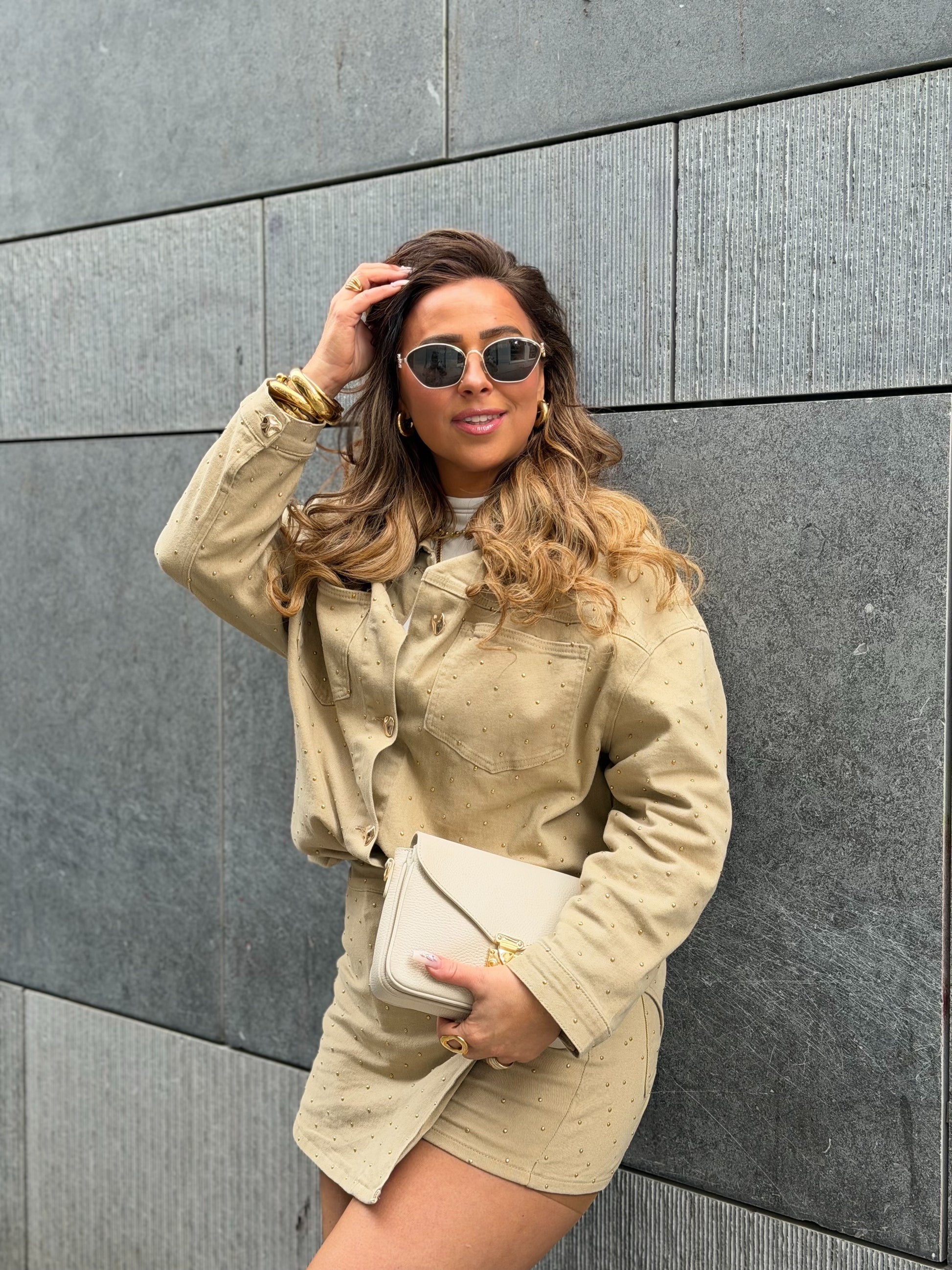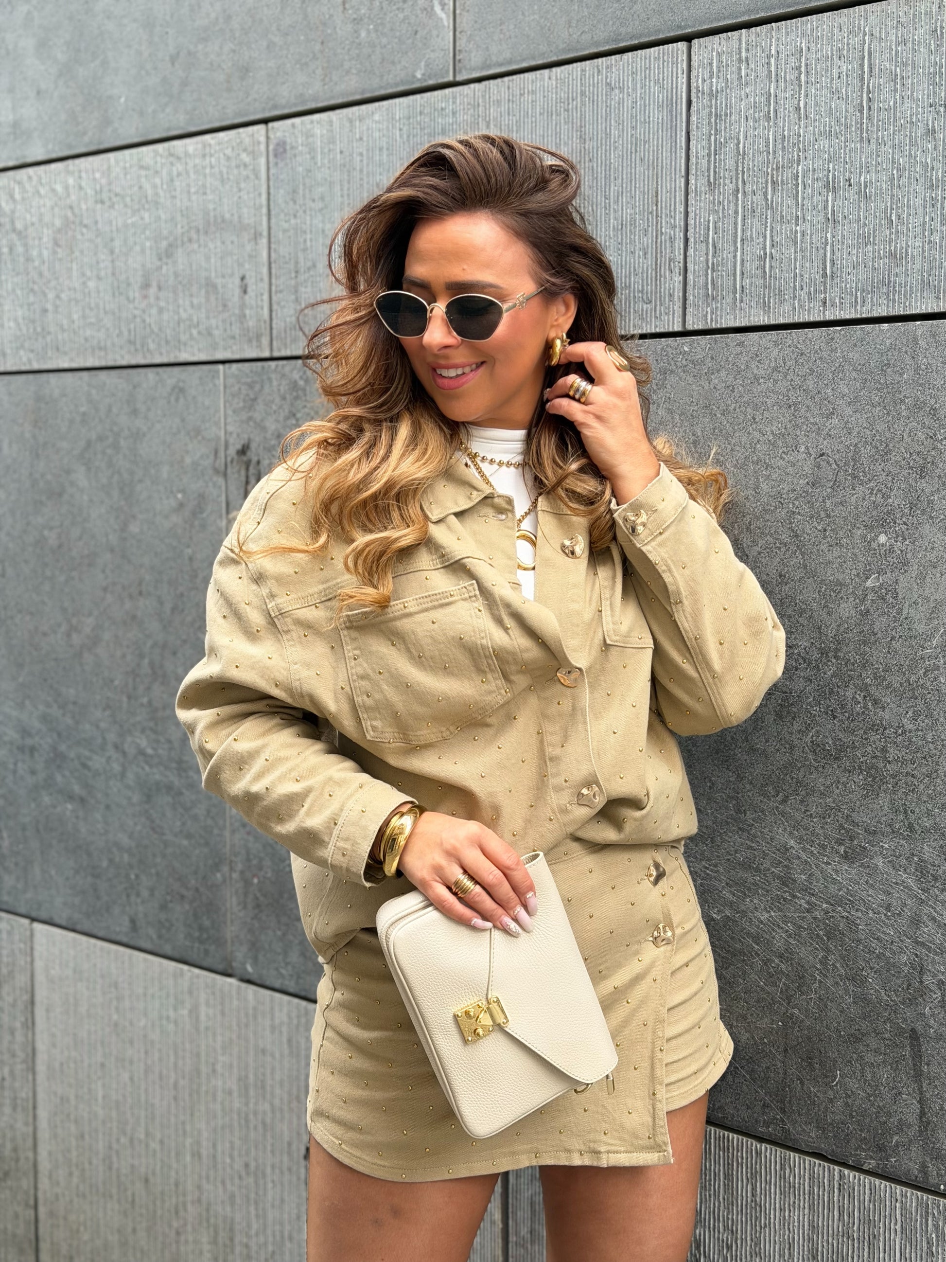 Stretchy high waist skortje met gouden studs. Leuk te combineren met het matchende jasje. Ons model is 1.74m lang en draagt maat s. Let op deze set valt ruimer dan de blauwe! Mag niet in de wasmachine gewassen worden maar op de hand ivm de studs.