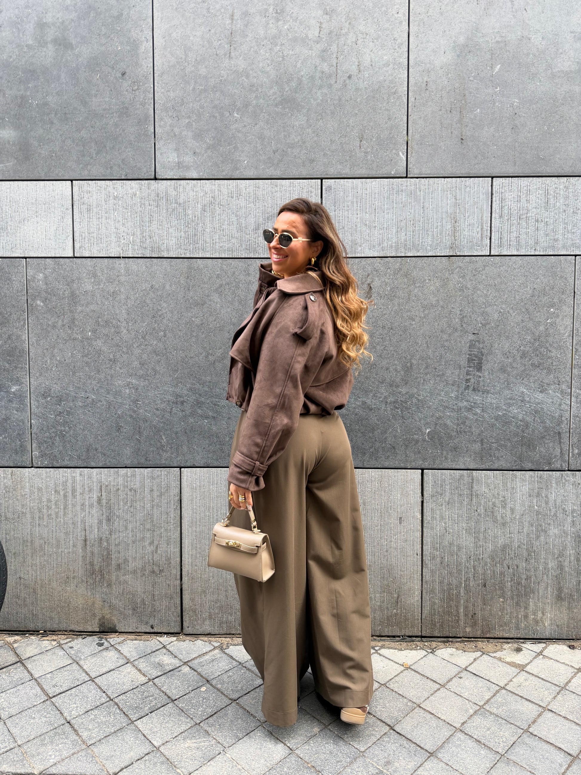 Mooie cropped suéde look jacket die je heel leuk zowel open als dicht kan dragen. Oversized fitting, ons model is 1.74m lang en draagt maat s/m.