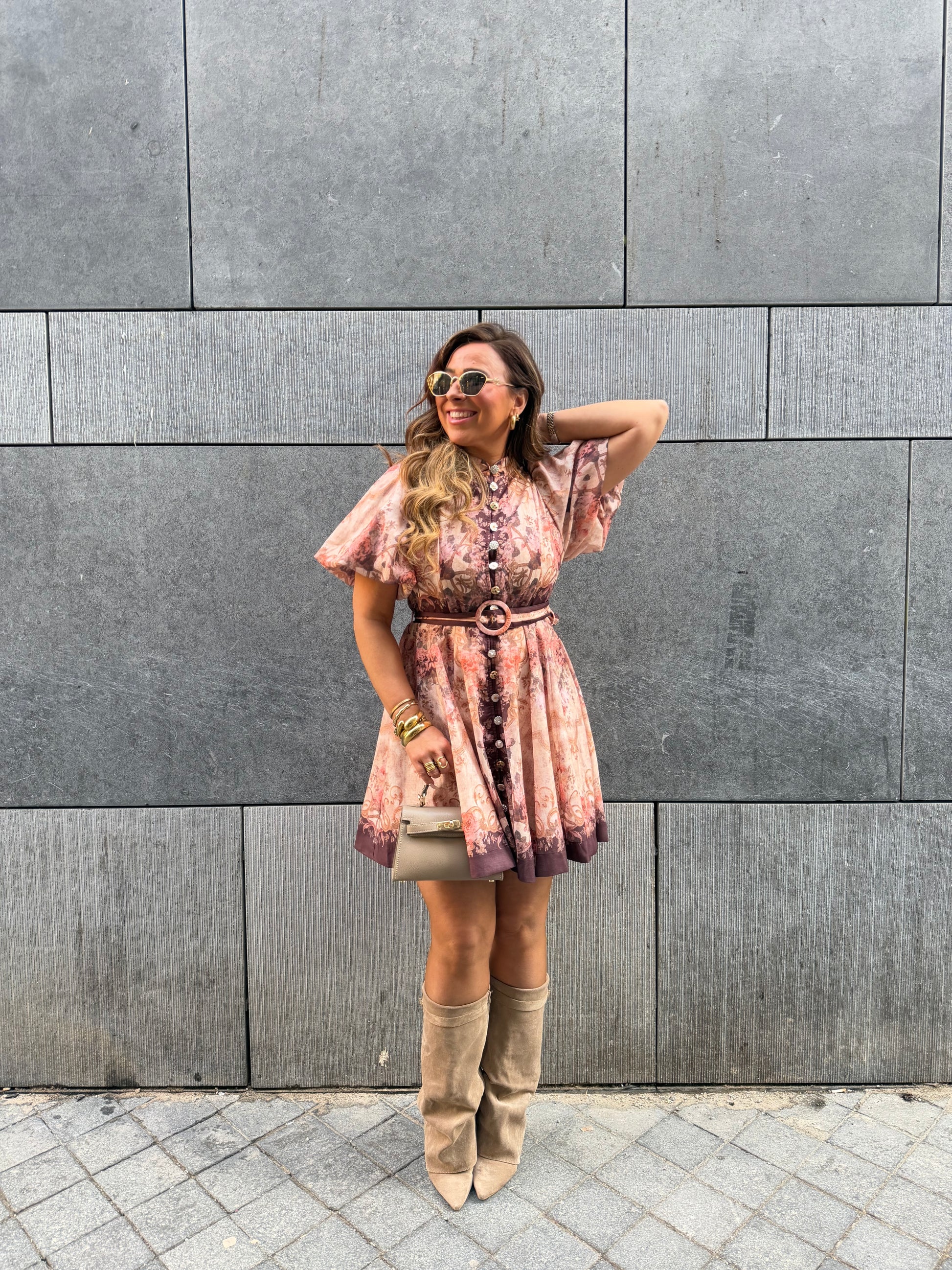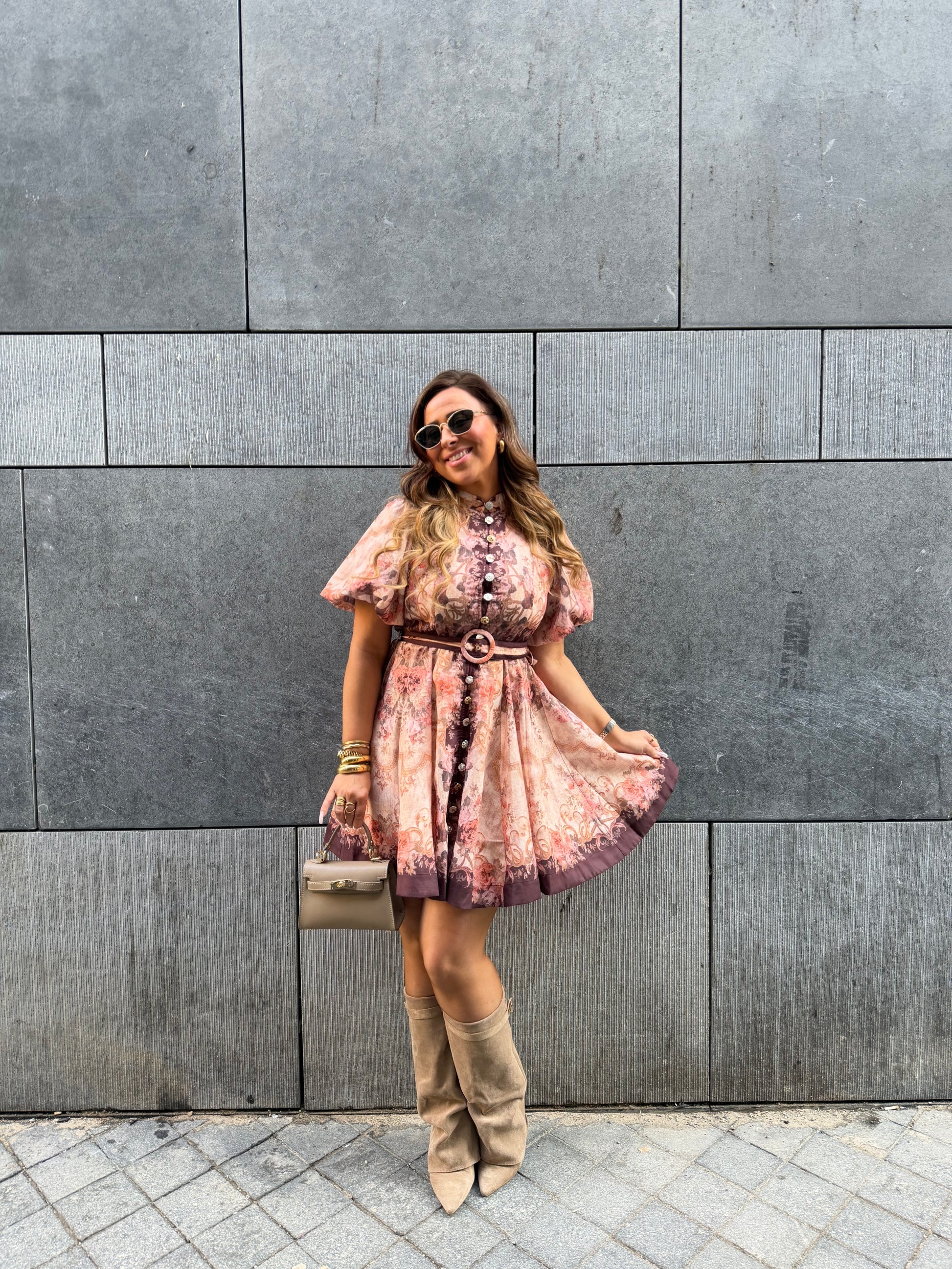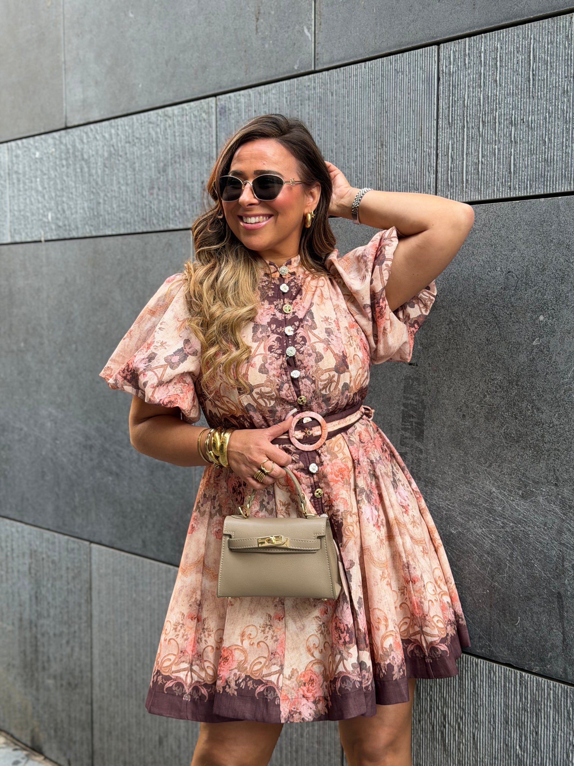 Prachtige jurk met een beeldige bloemenprint en super mooie knoopjes. Pofmauwtje waar je wauw tegen zegt met een matching centuurtje. Gemaakt van 70% katoen em 30% linnen. Echt een eyecatcher! Ons model is 1.74m lang en draagt maat s/m.