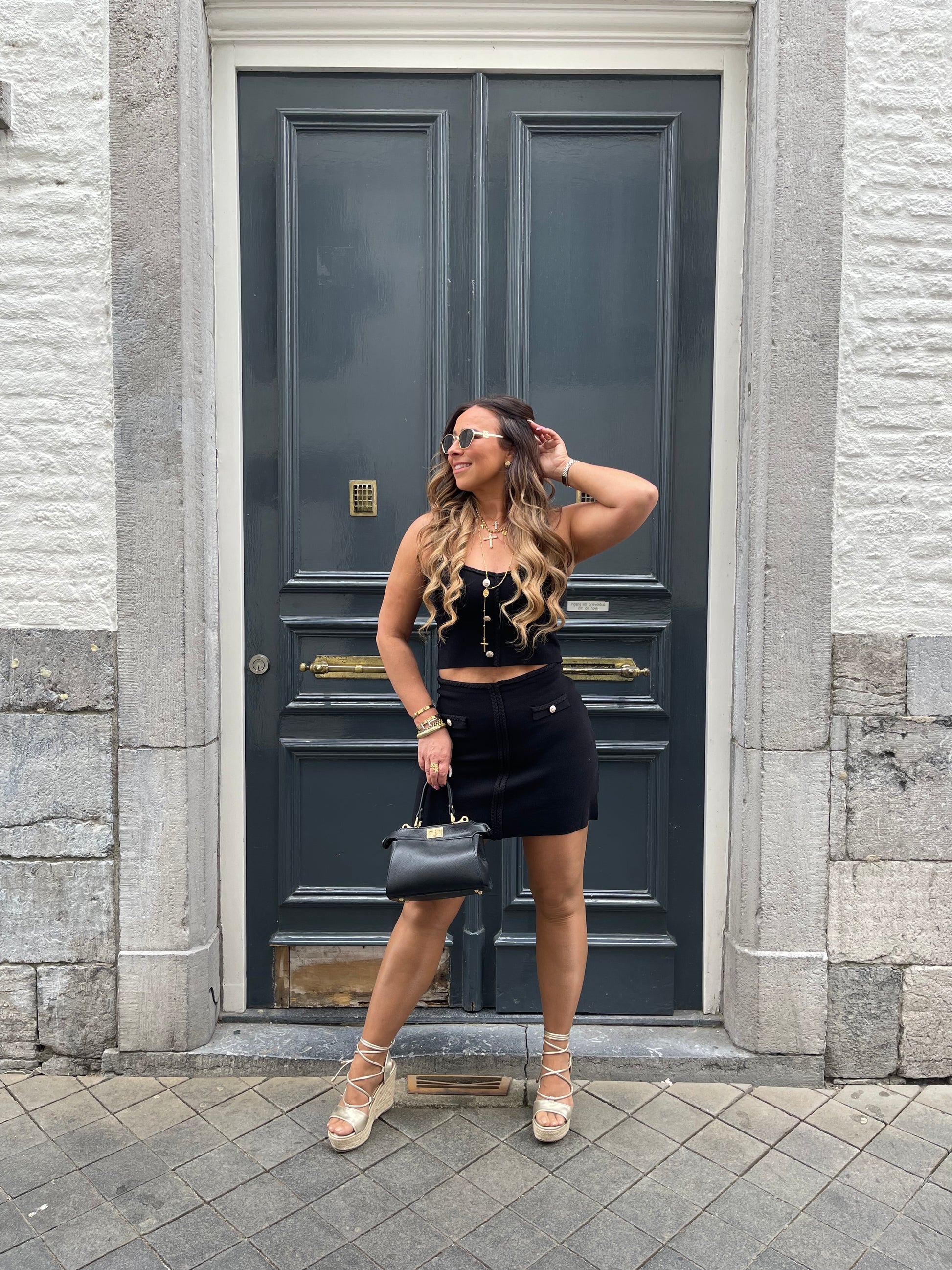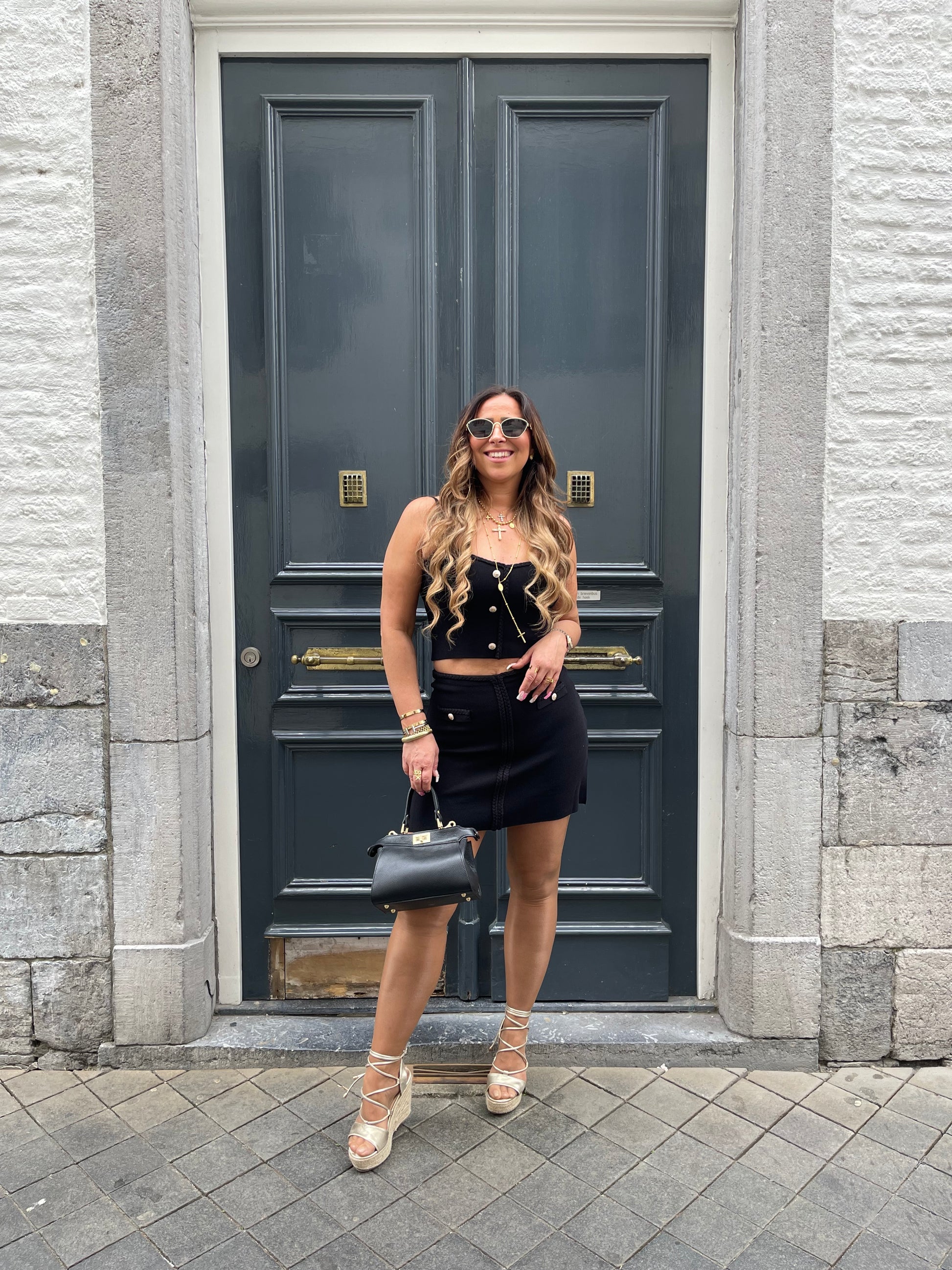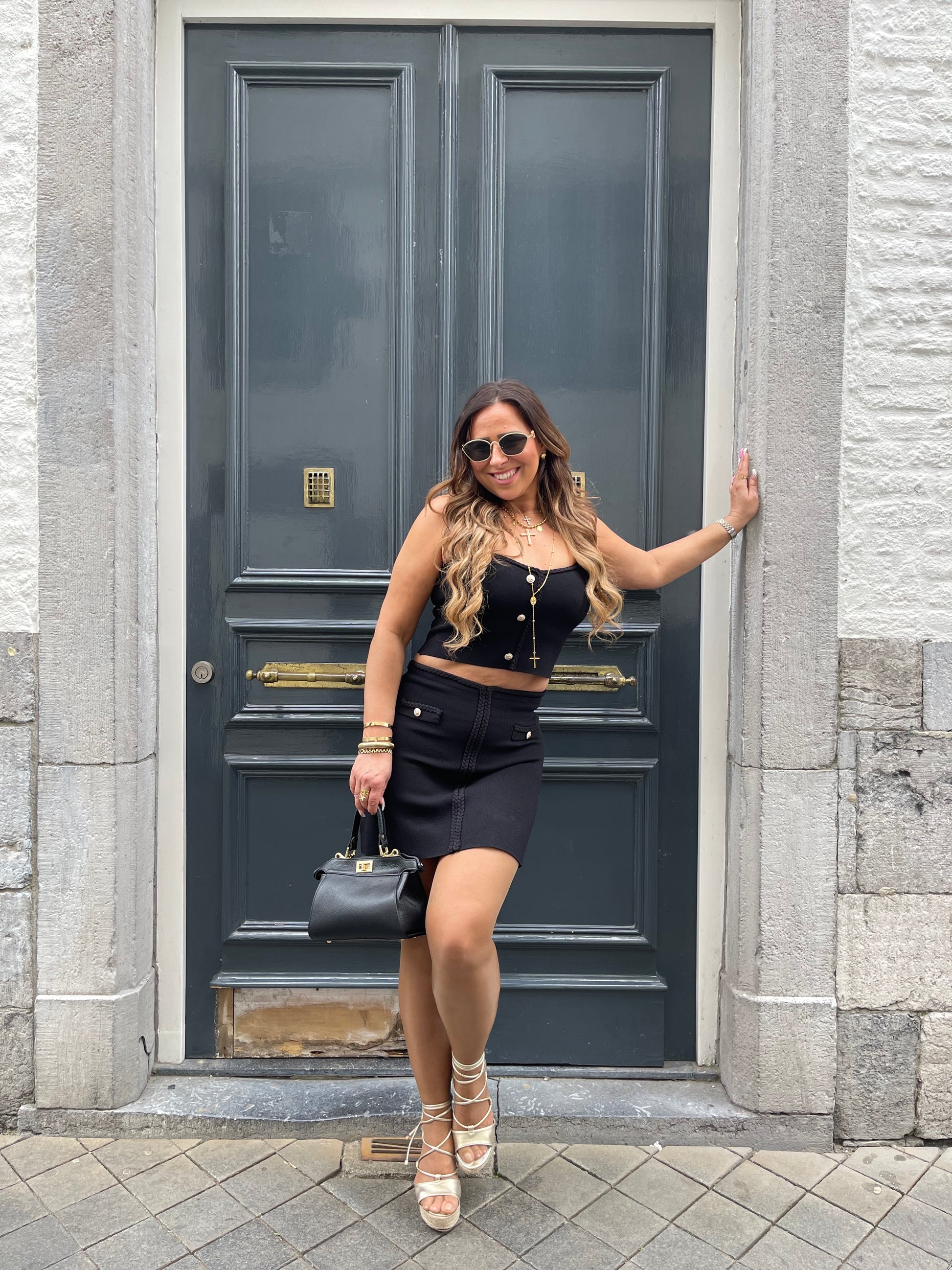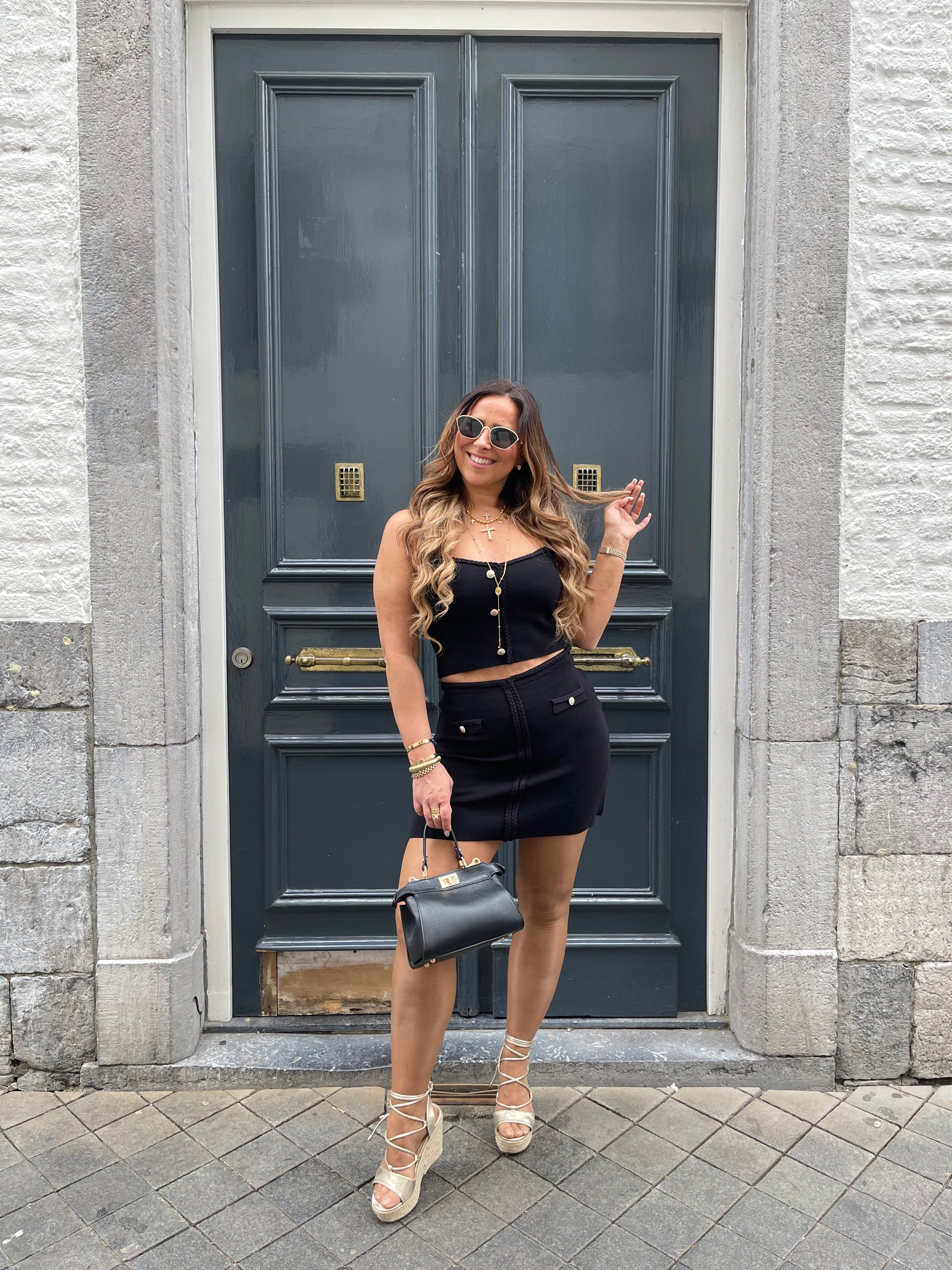 Twin-setje met gevlochten details. Stretchy, ons model is 1.74m lang en draagt maat m/l.
