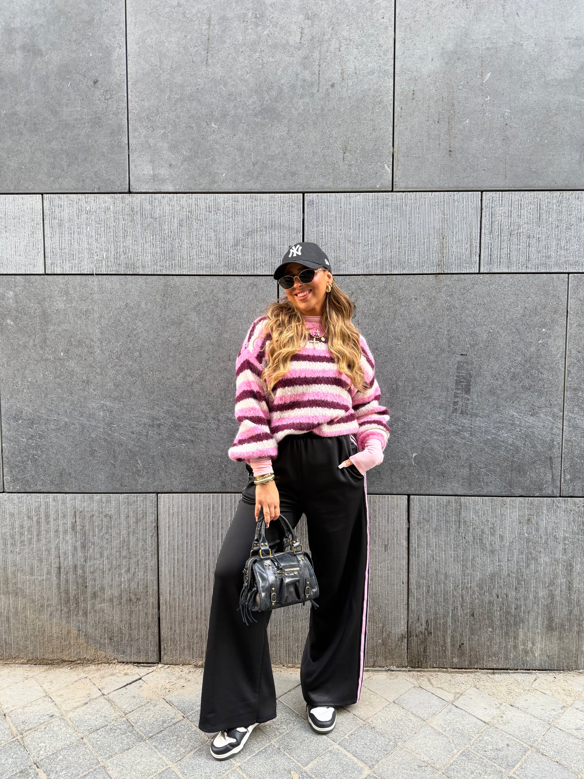 Oversized jogger met een elastieke band & en leuke details aan de zijkant. One size, stretchy, draagbaar voor de maatjes xs t/m l. Ons model is 1.74m lang en de lengte is perfect.