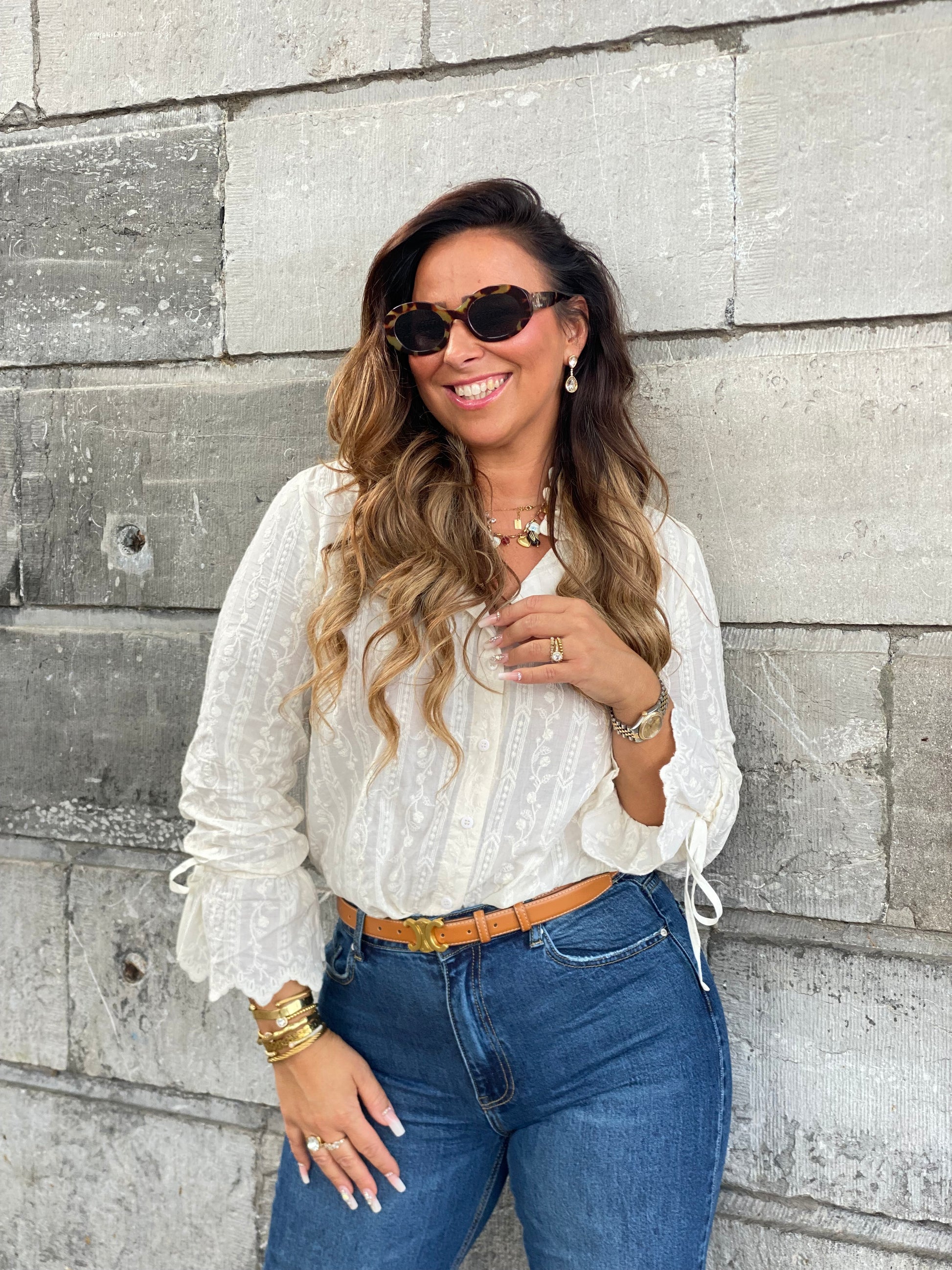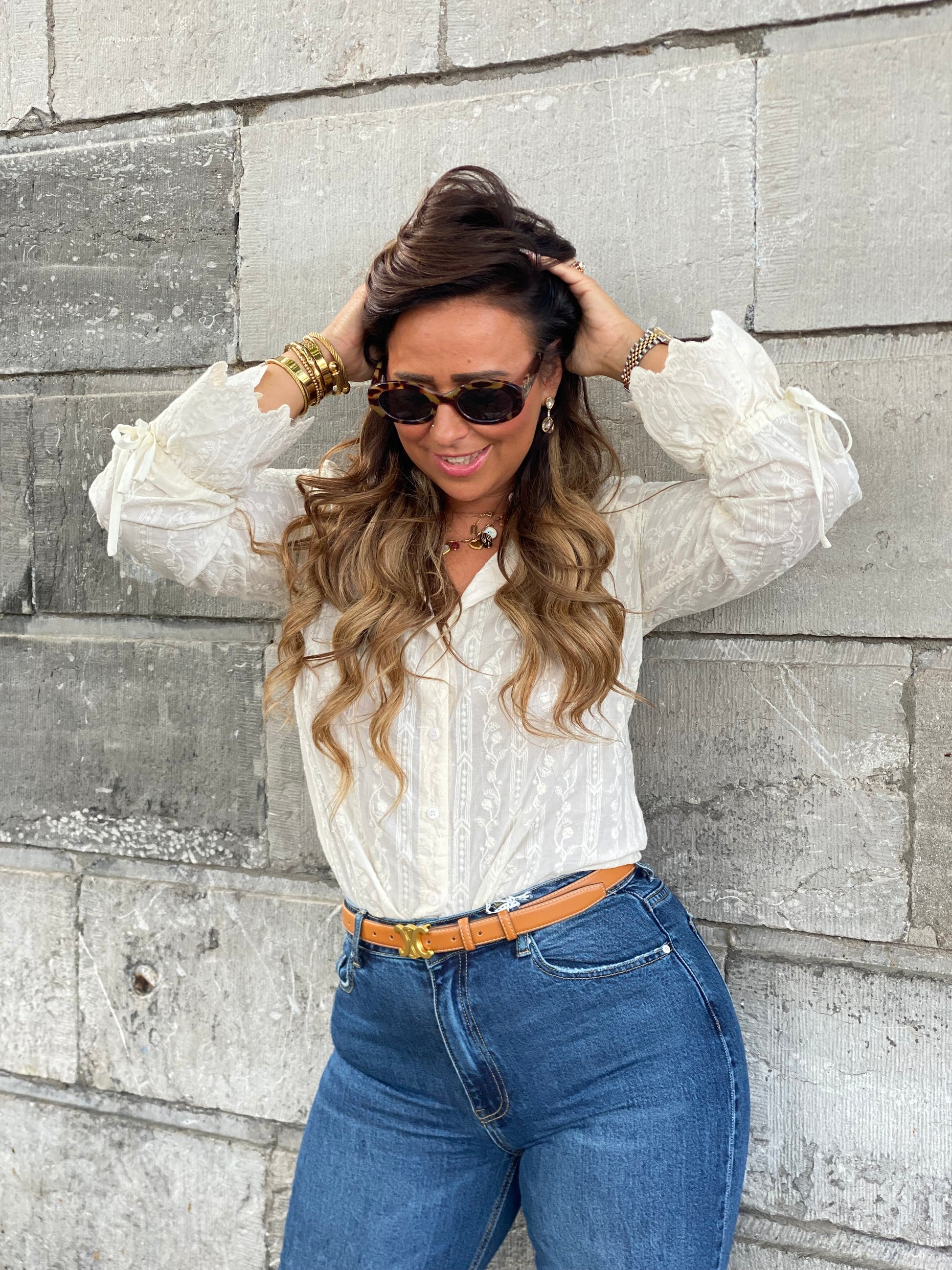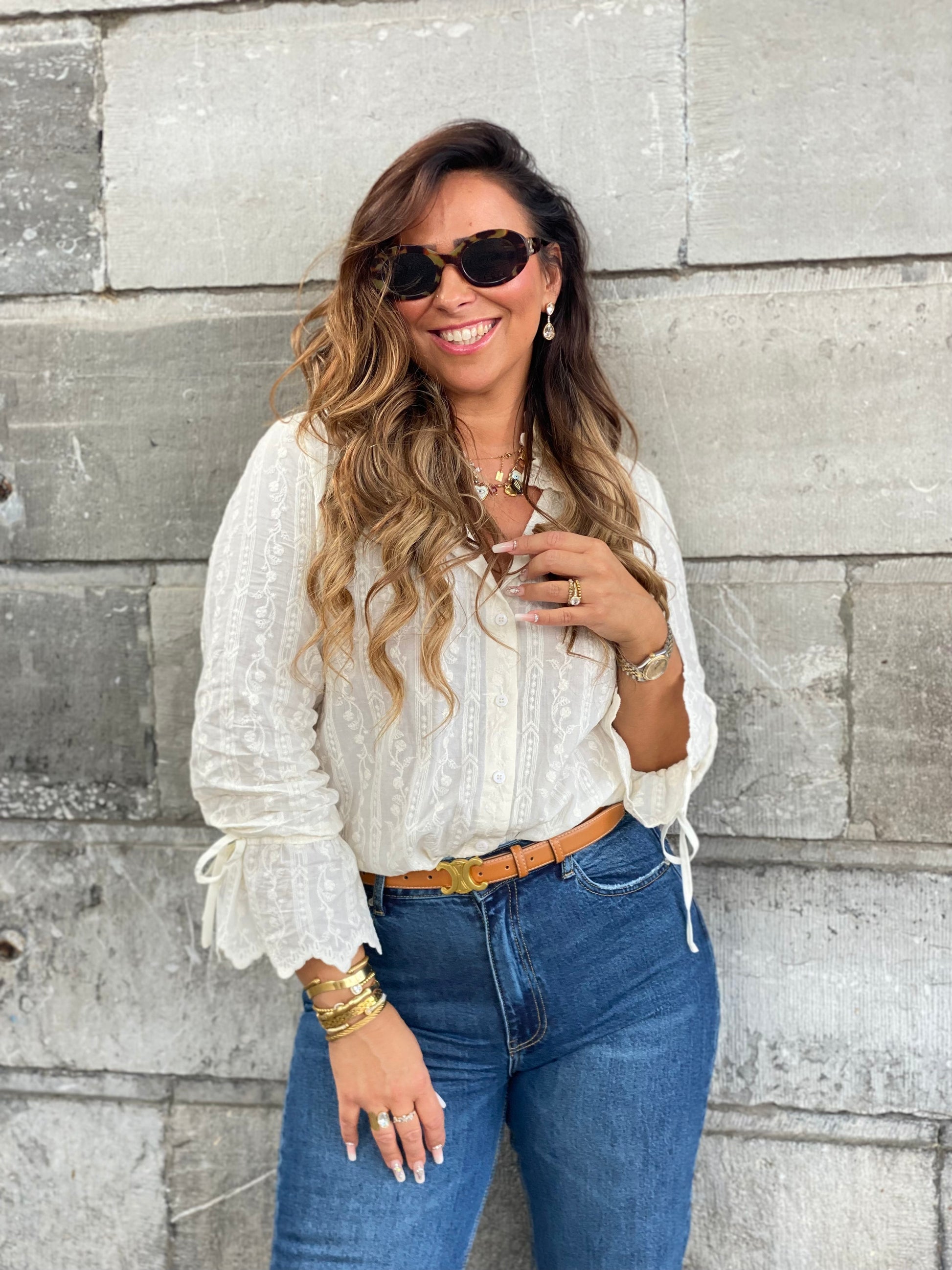 Prachtig bloesje met mooie broderie details en strikjes bij de mouwtjes. Heel leuk om met een gilletje of sweater te dragen. Ons model is 1.74m lang en draagt maat m.