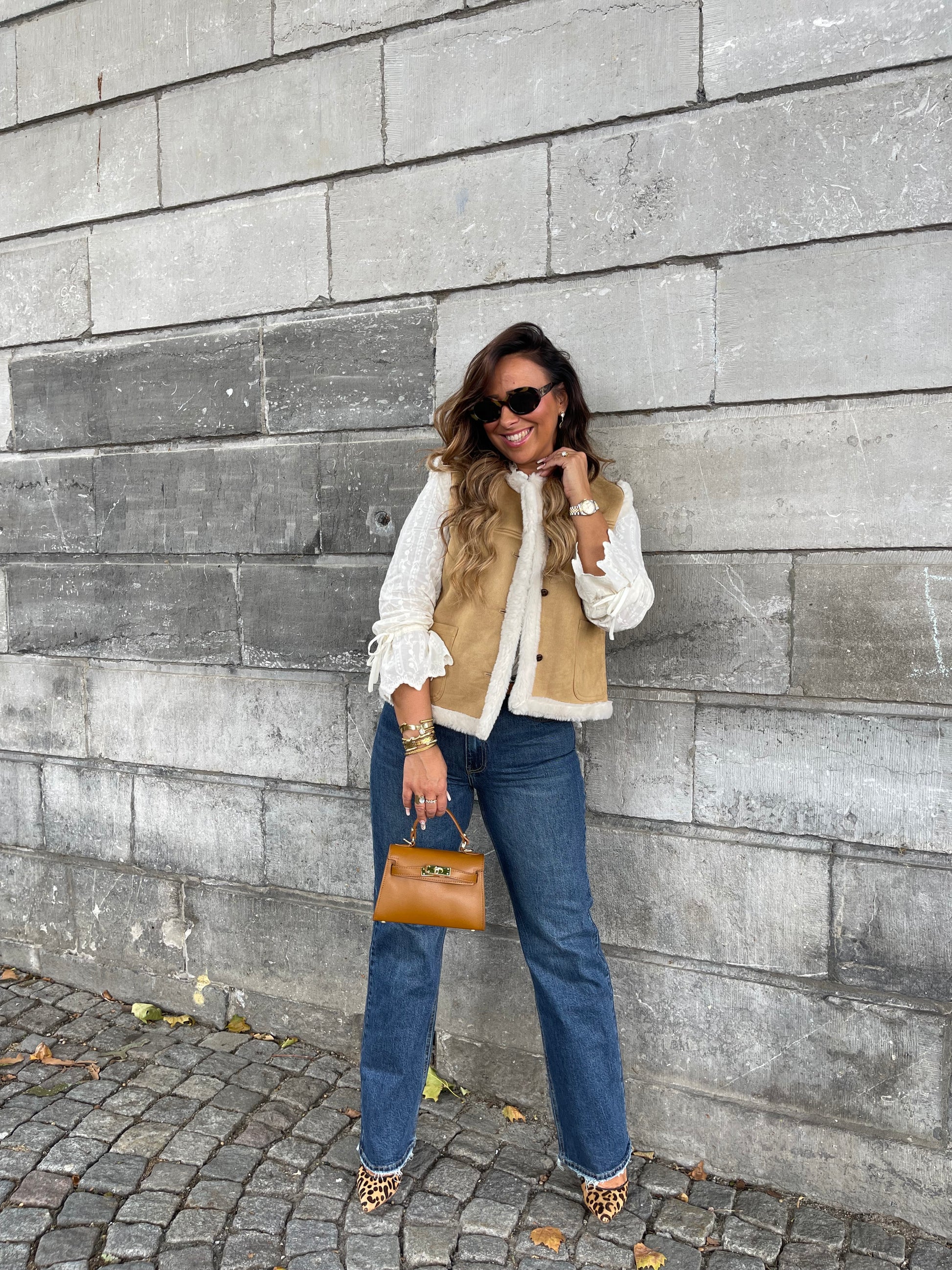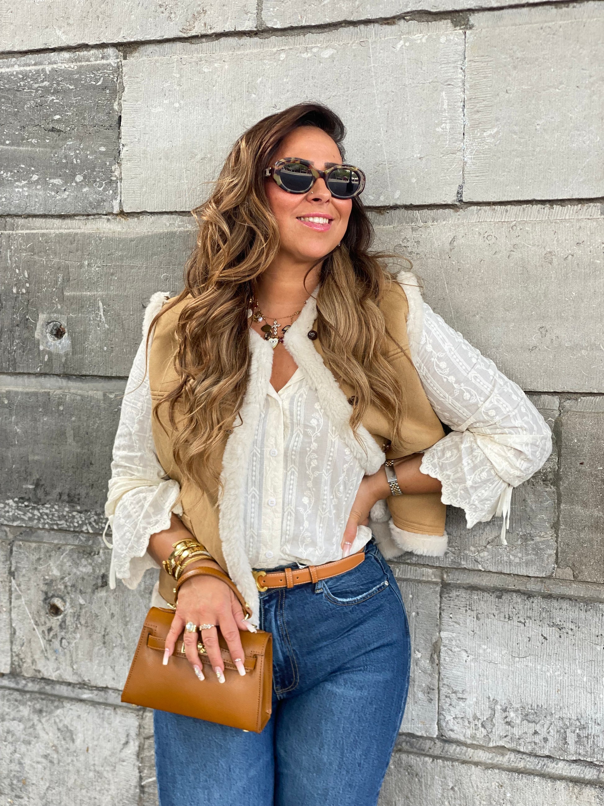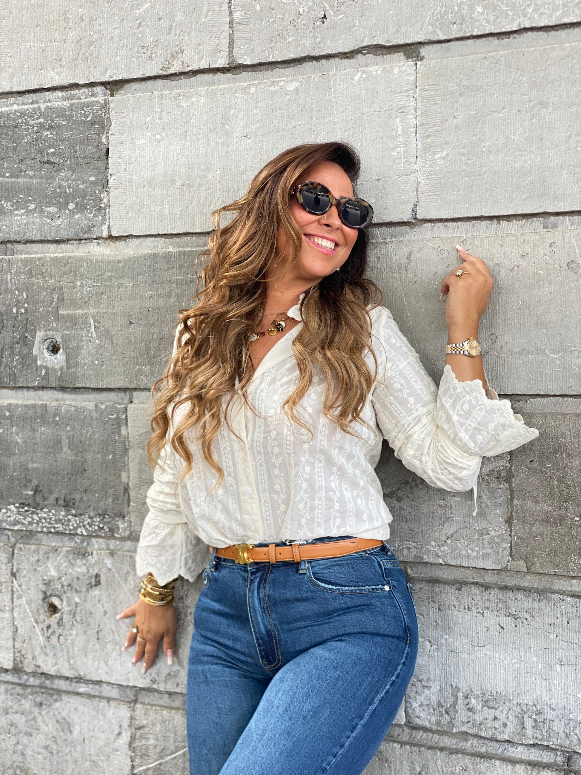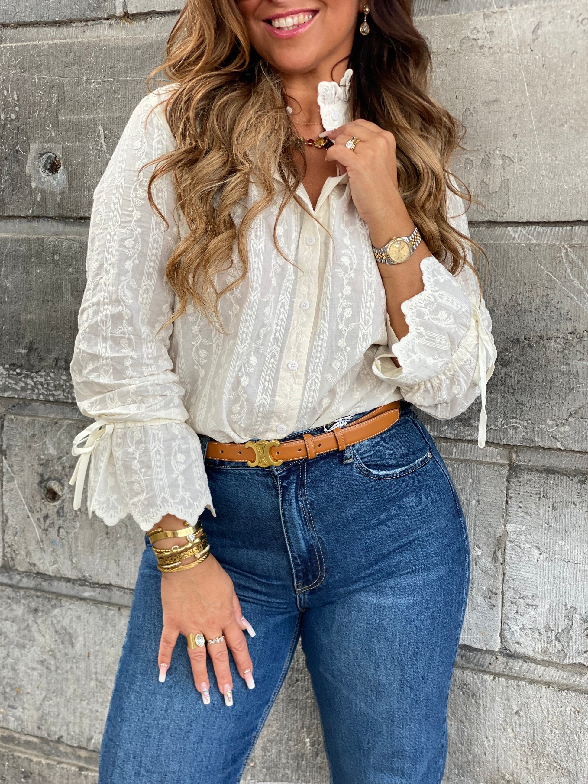 Prachtig bloesje met mooie broderie details en strikjes bij de mouwtjes. Heel leuk om met een gilletje of sweater te dragen. Ons model is 1.74m lang en draagt maat m.