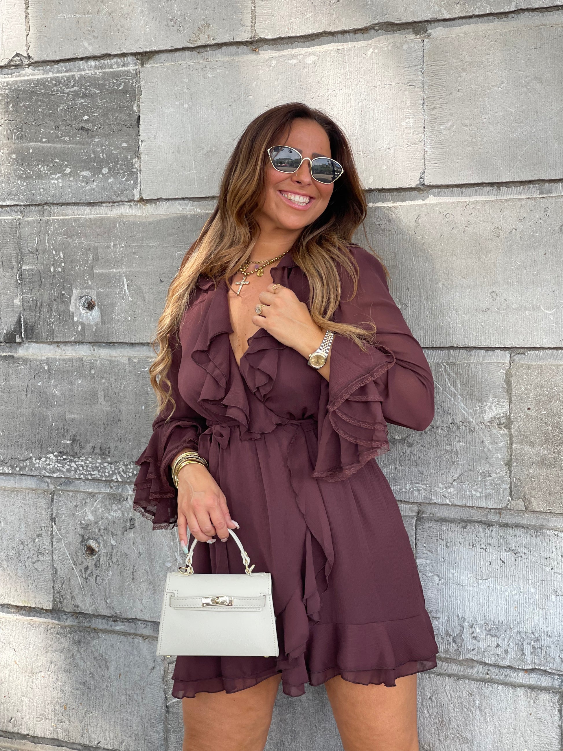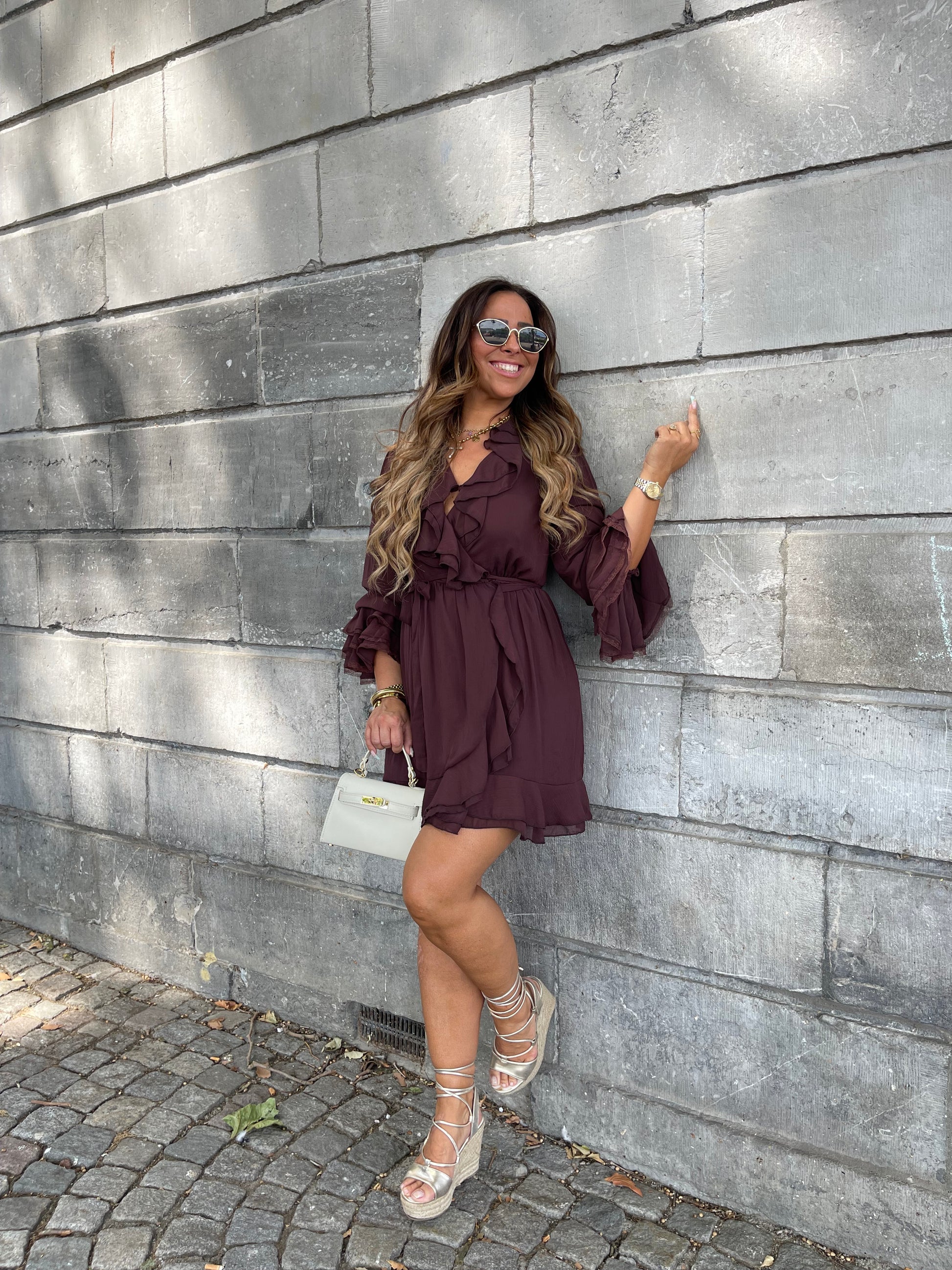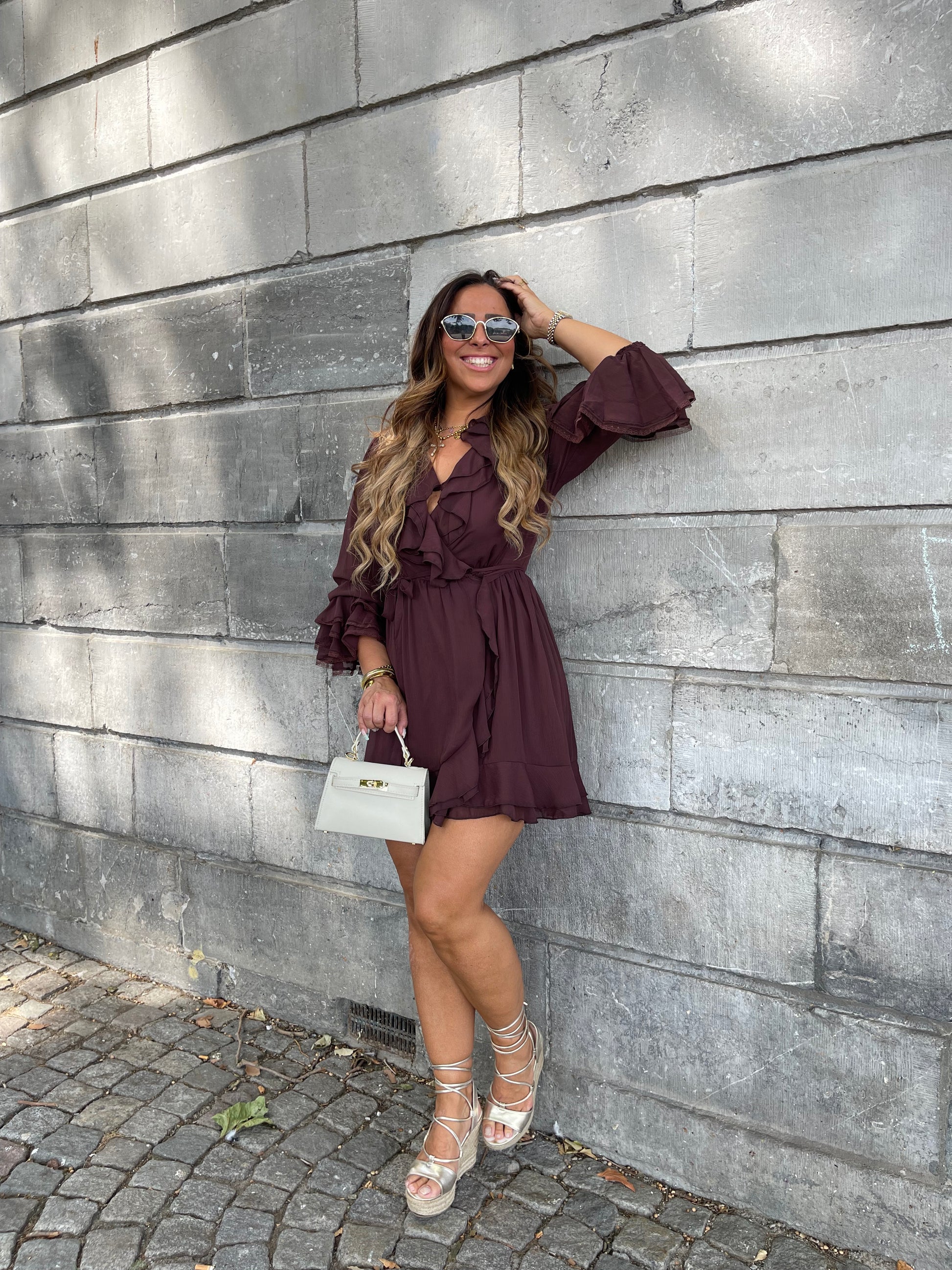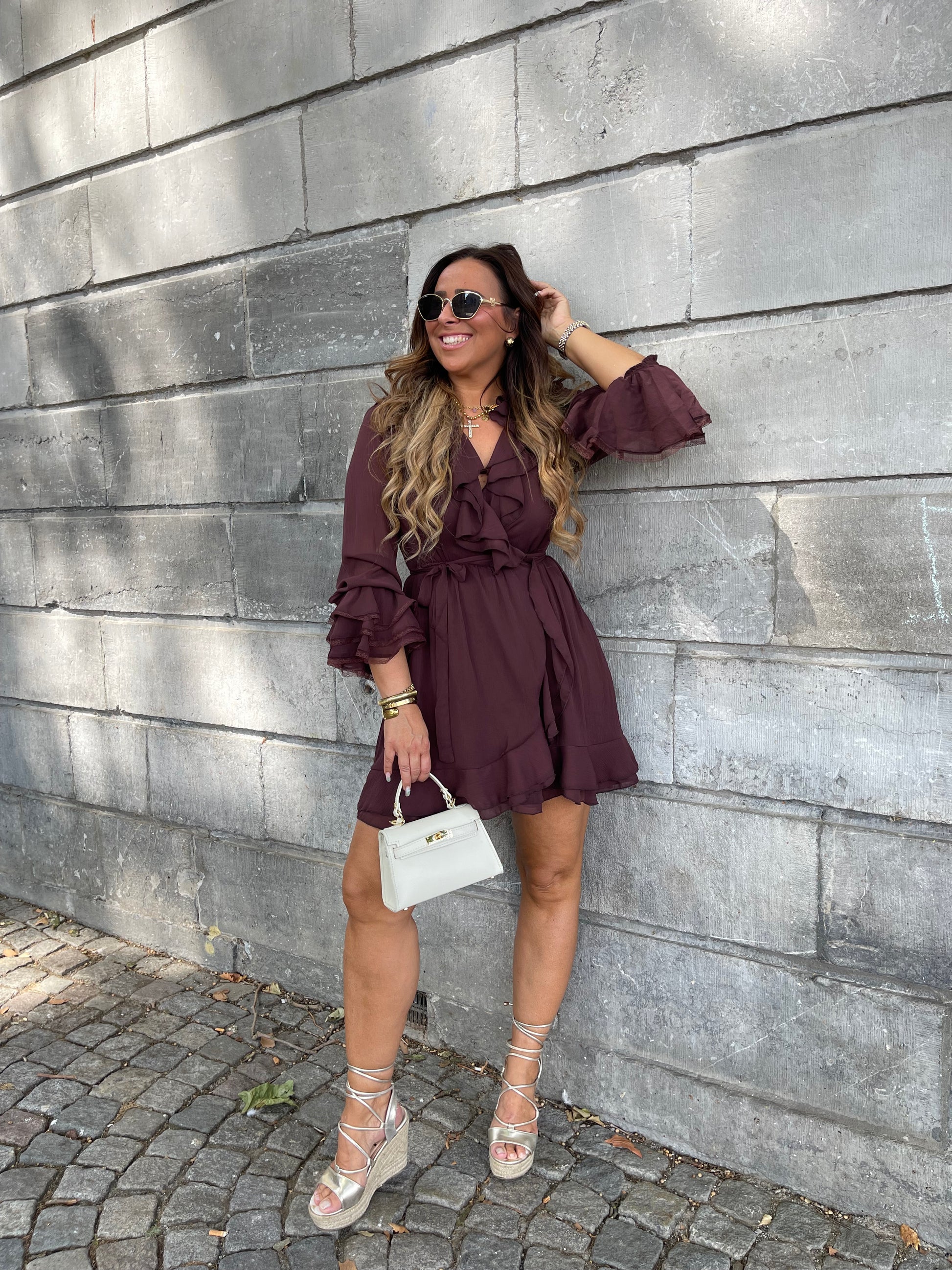 Prachtig wikkeljurkje met rouches. Valt goed op maat. Ons model draagt maat m en is 1.74m lang.