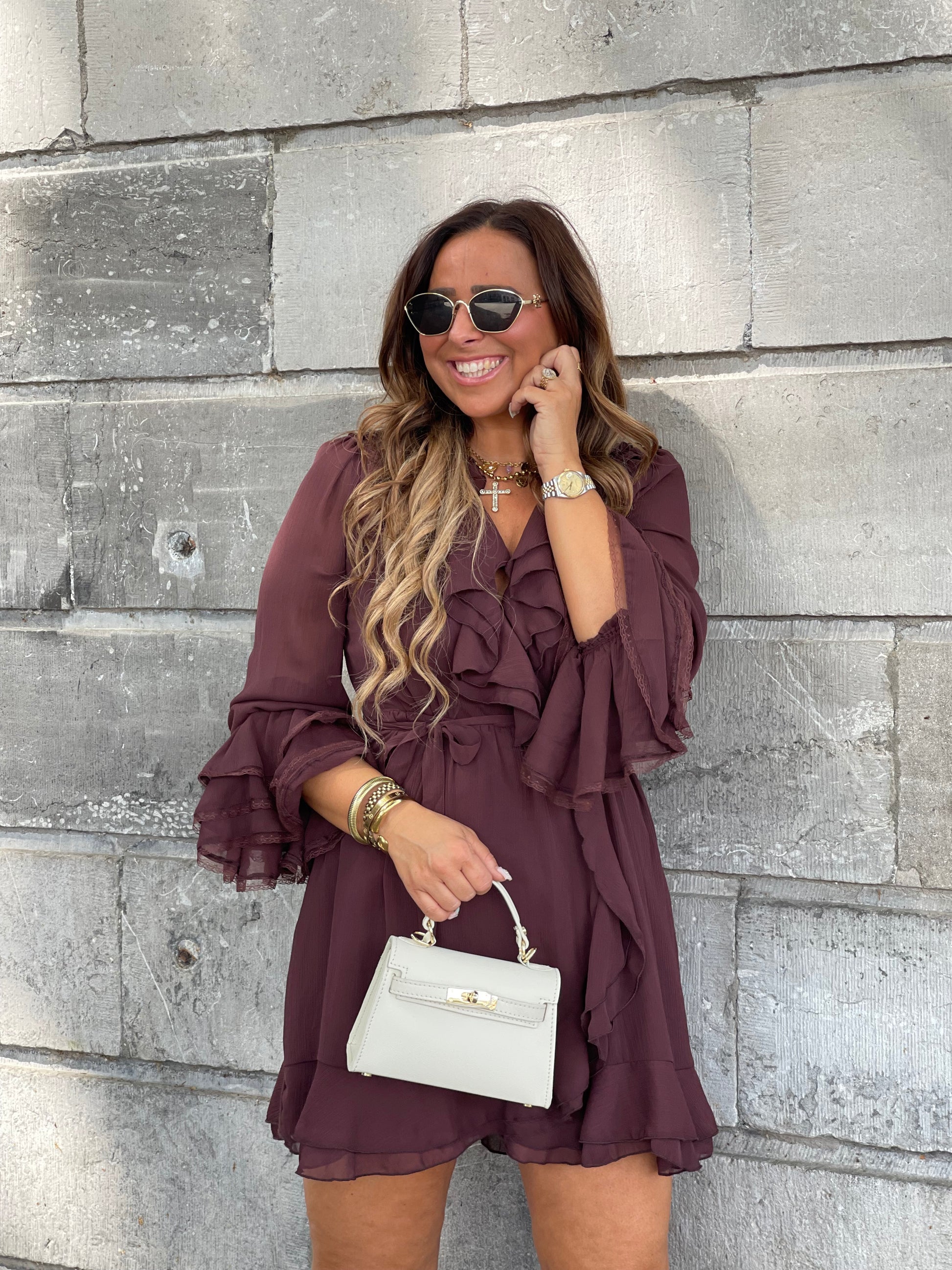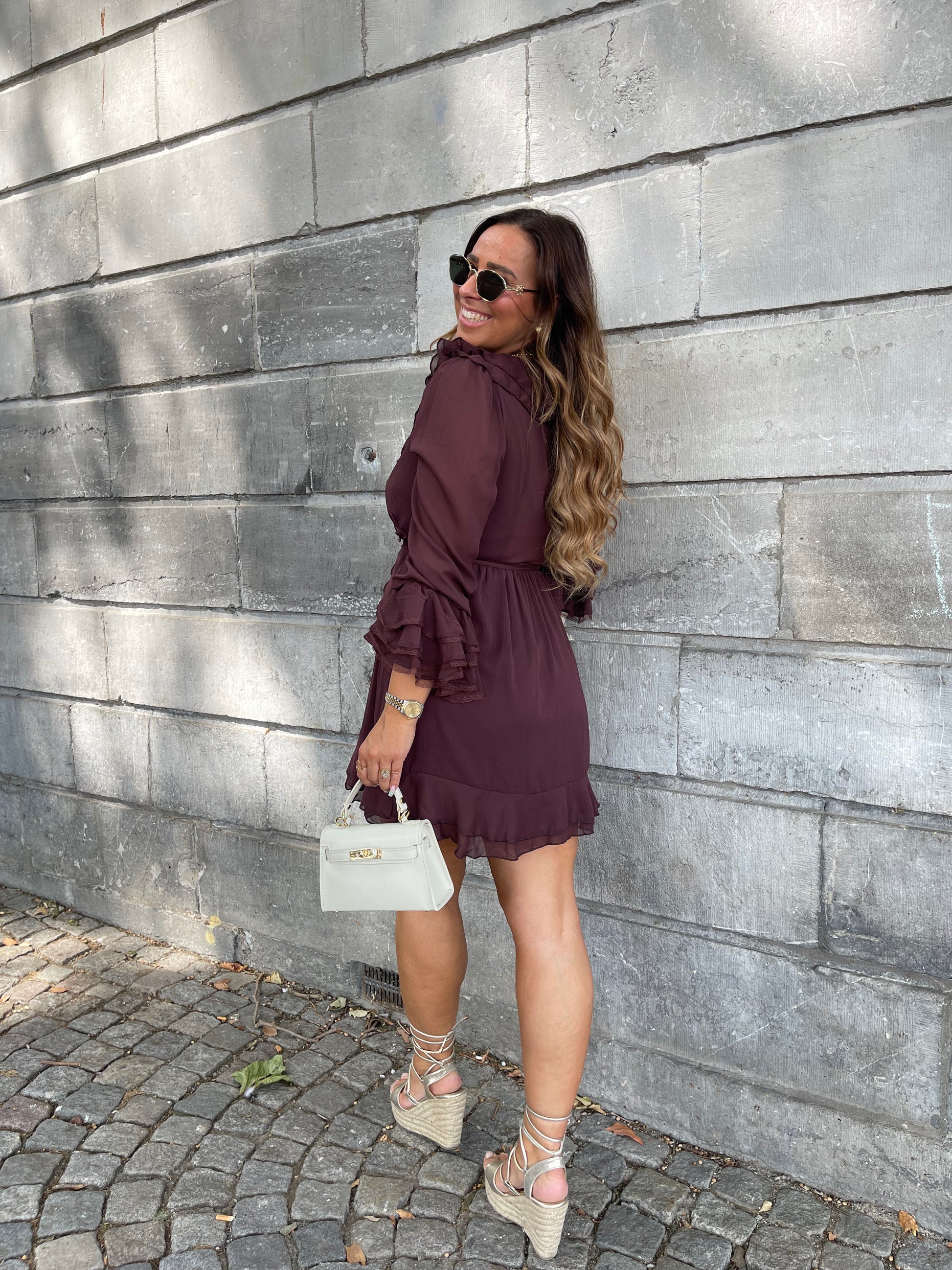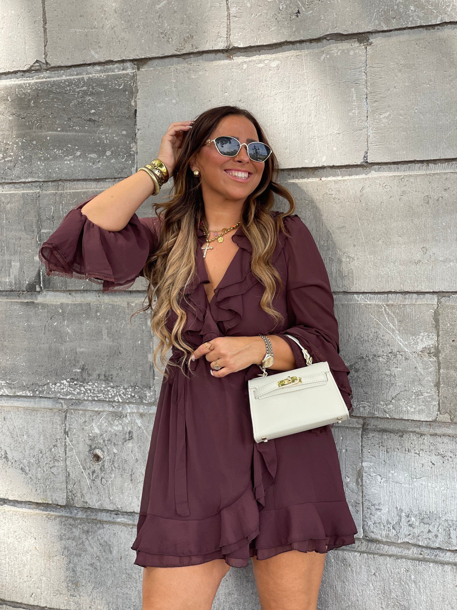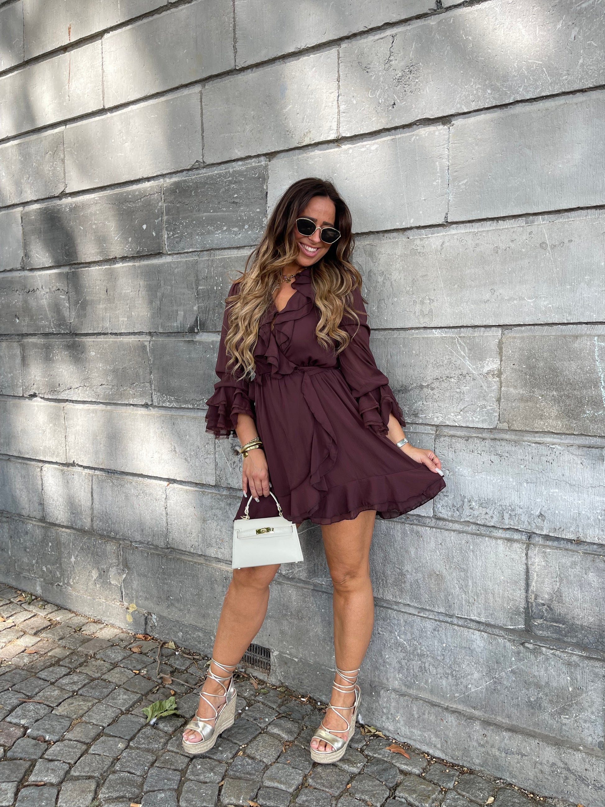 Prachtig wikkeljurkje met rouches. Valt goed op maat. Ons model draagt maat m en is 1.74m lang.