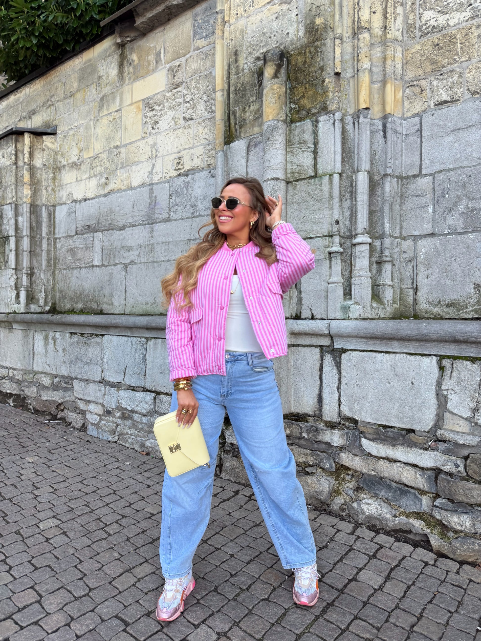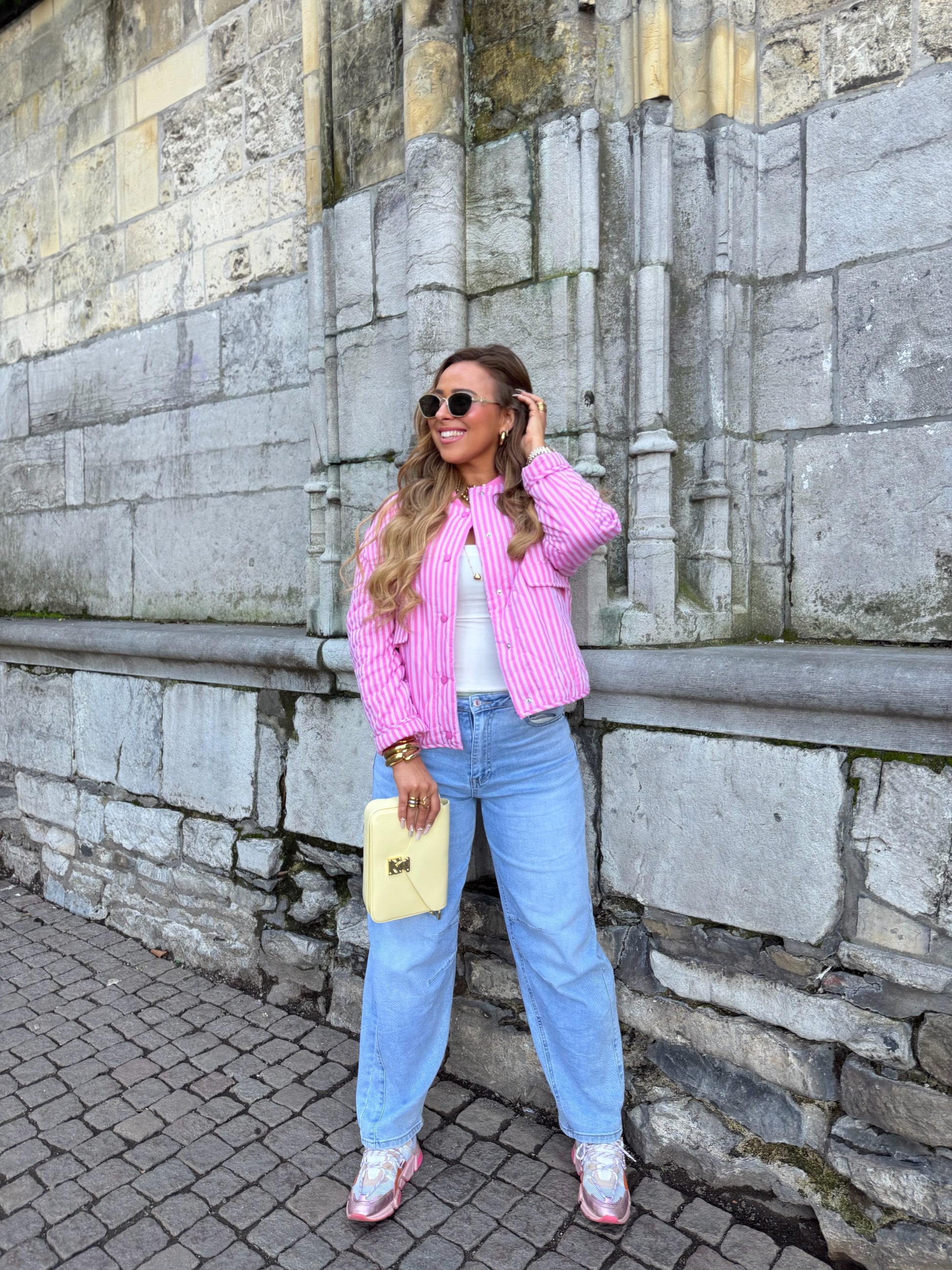 Mooi oversized jasje met leuke streepjes details. Ons model is 1.74m lang en draagt maat m/l.