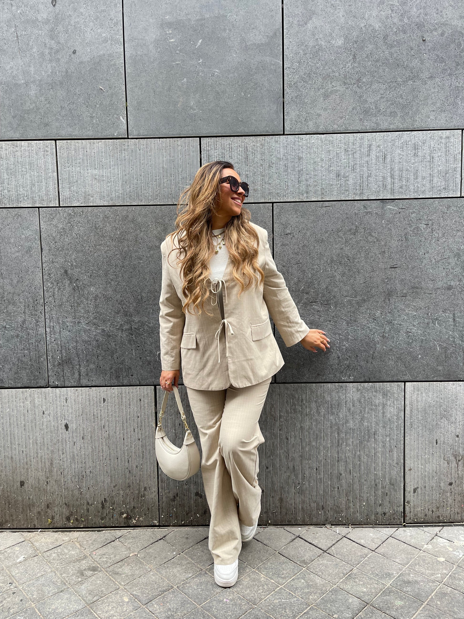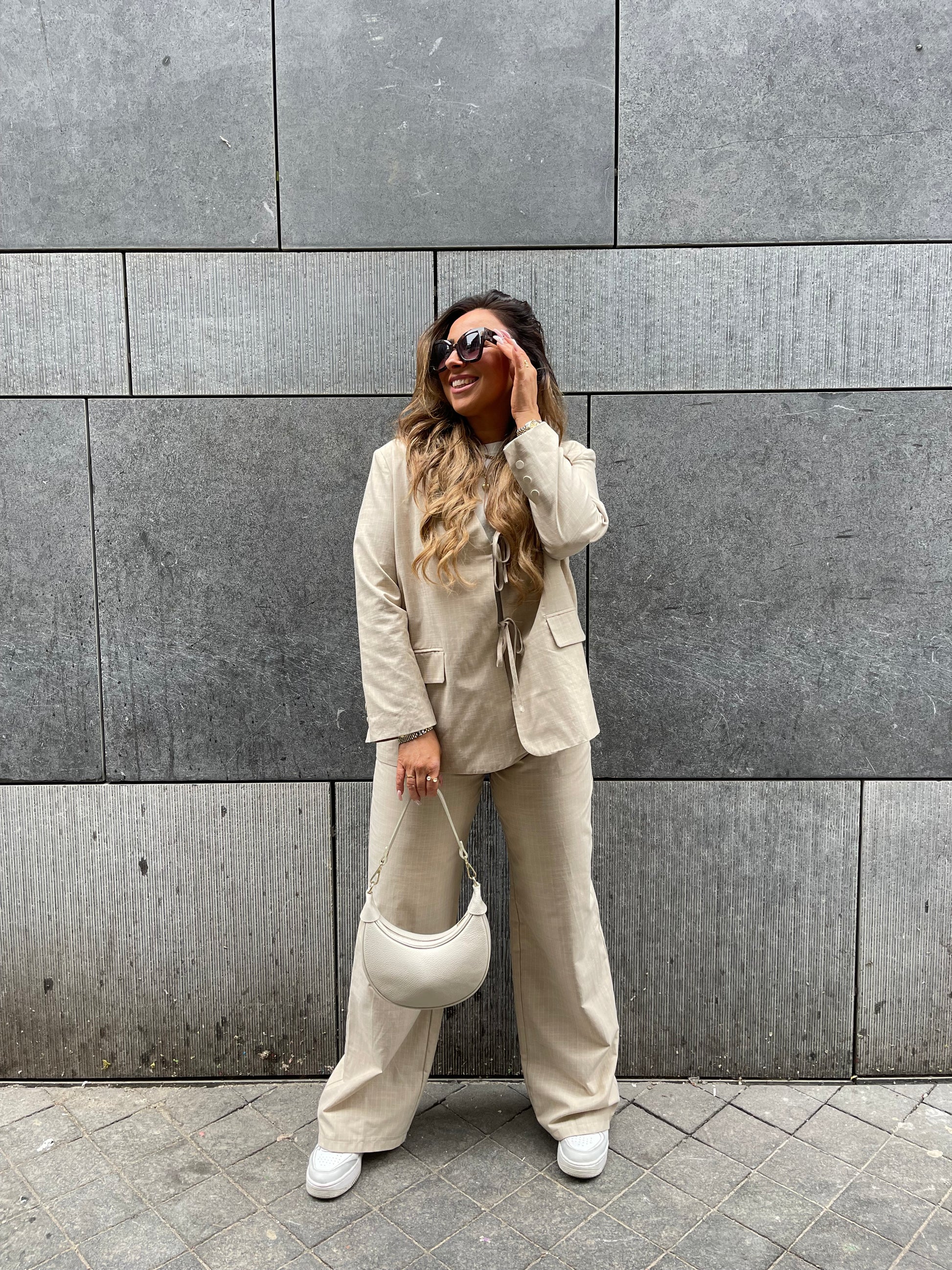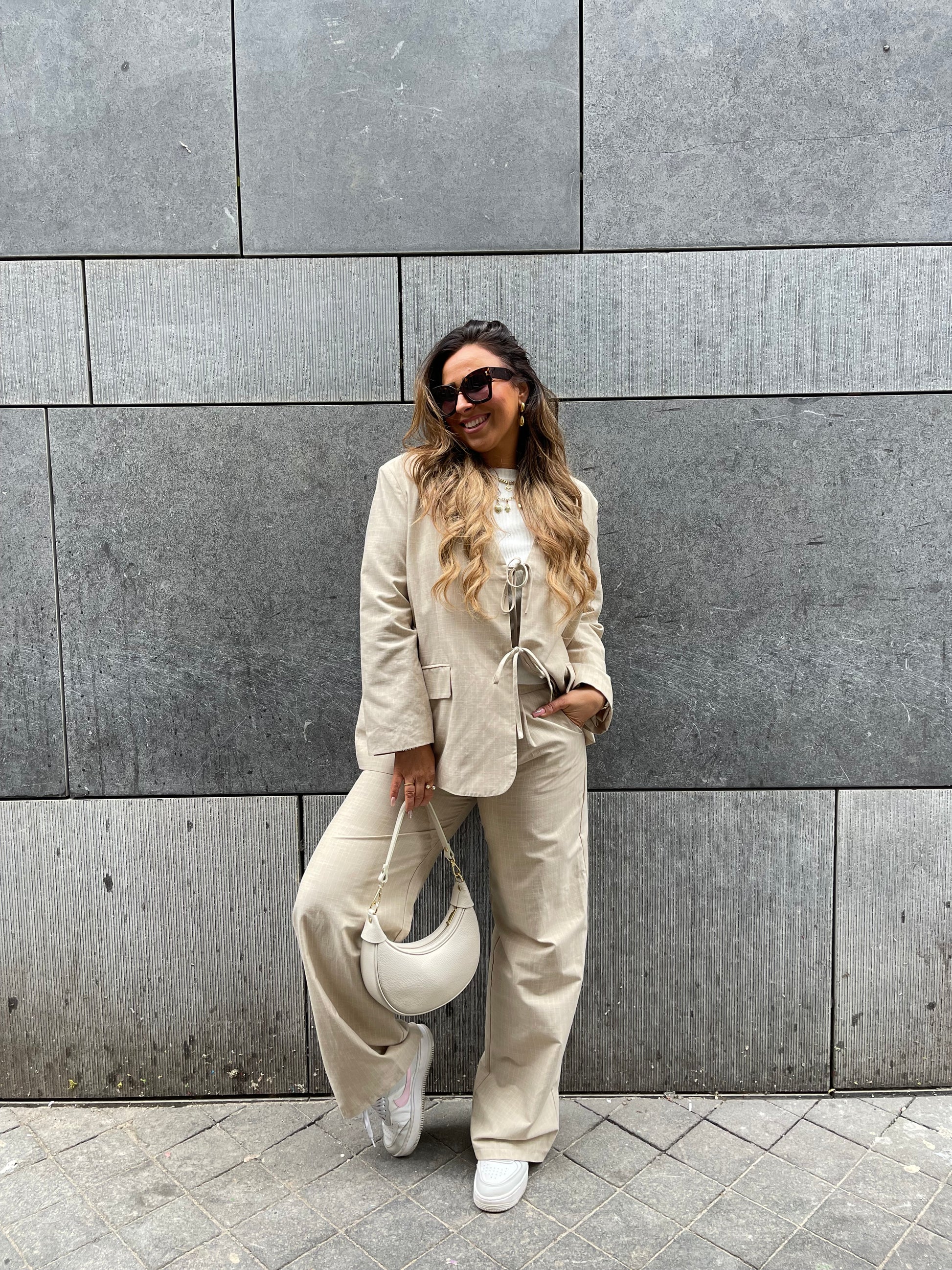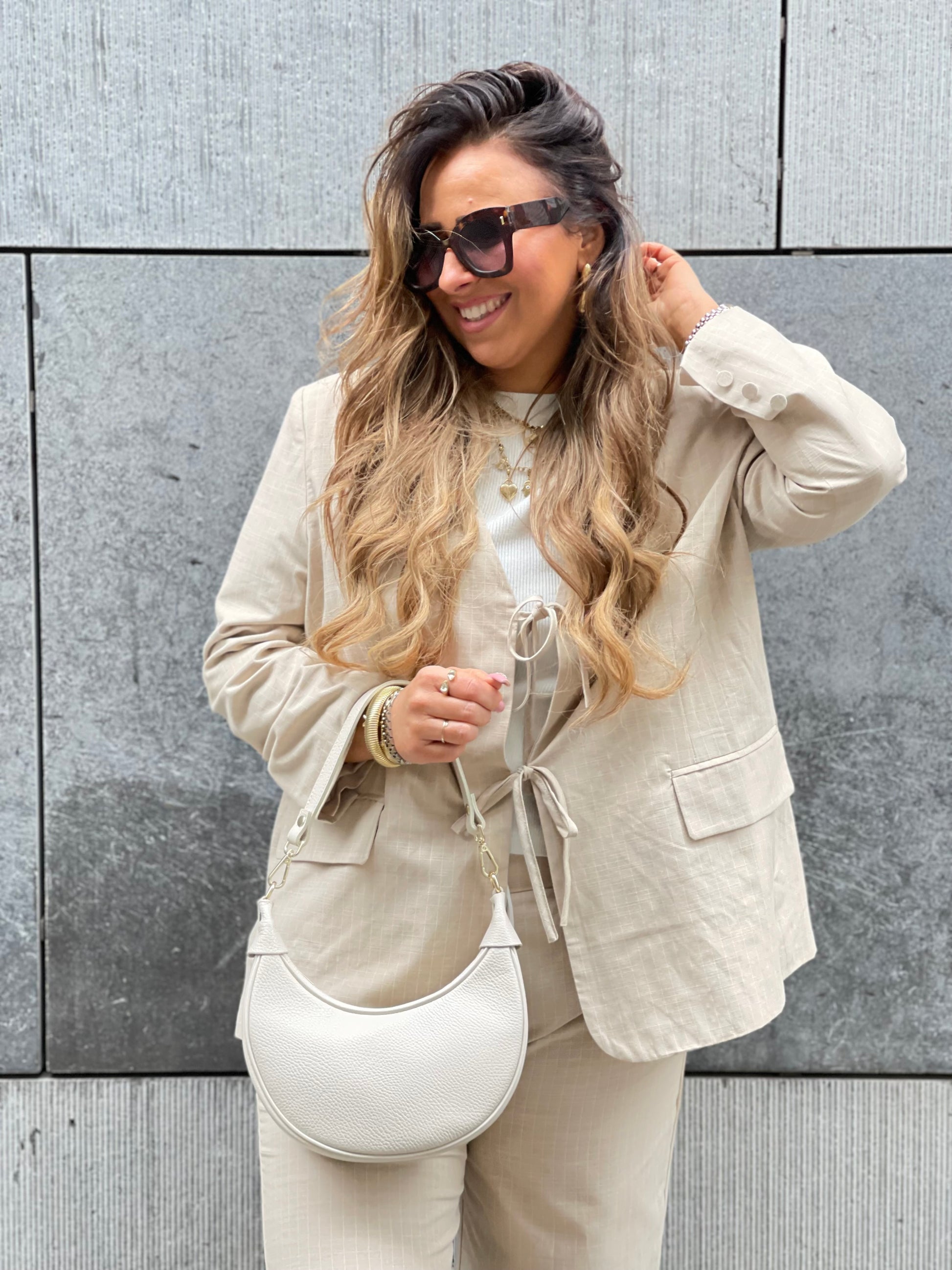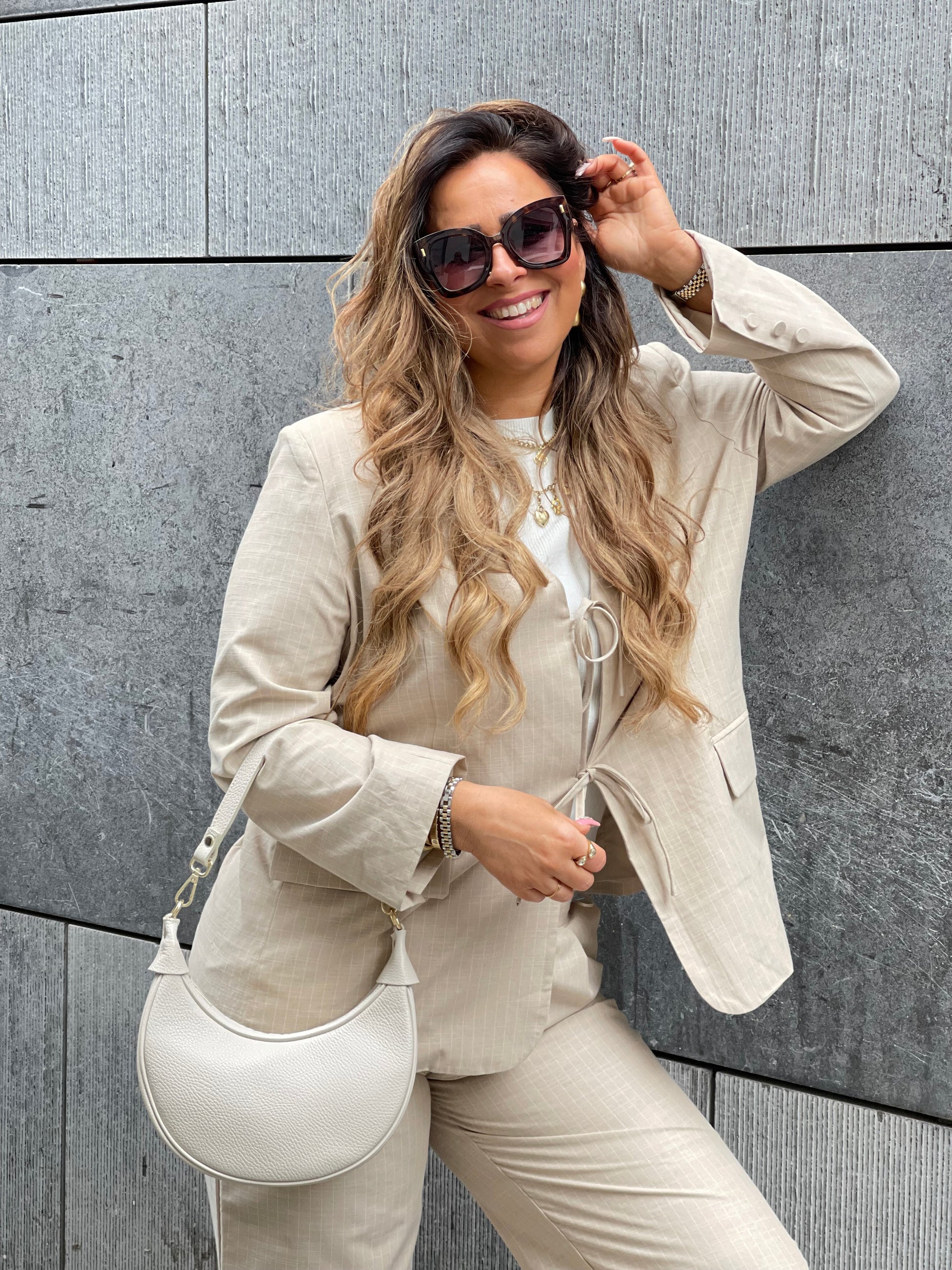 Beeldige oversized blazer met schattige strikjes aan de voorkant en een streepjes detail. One size, draagbaar voor de maatjes xs t/m l.