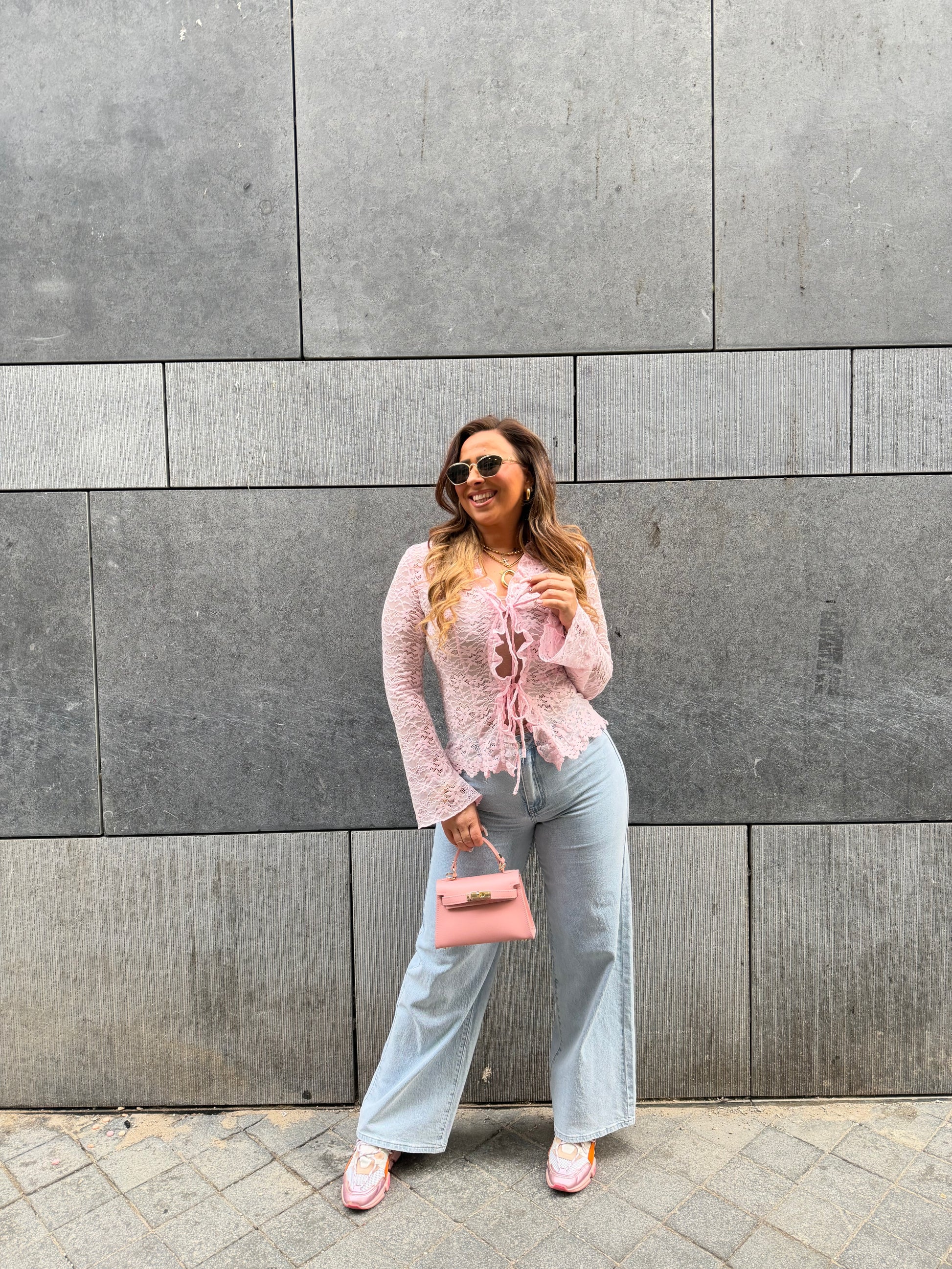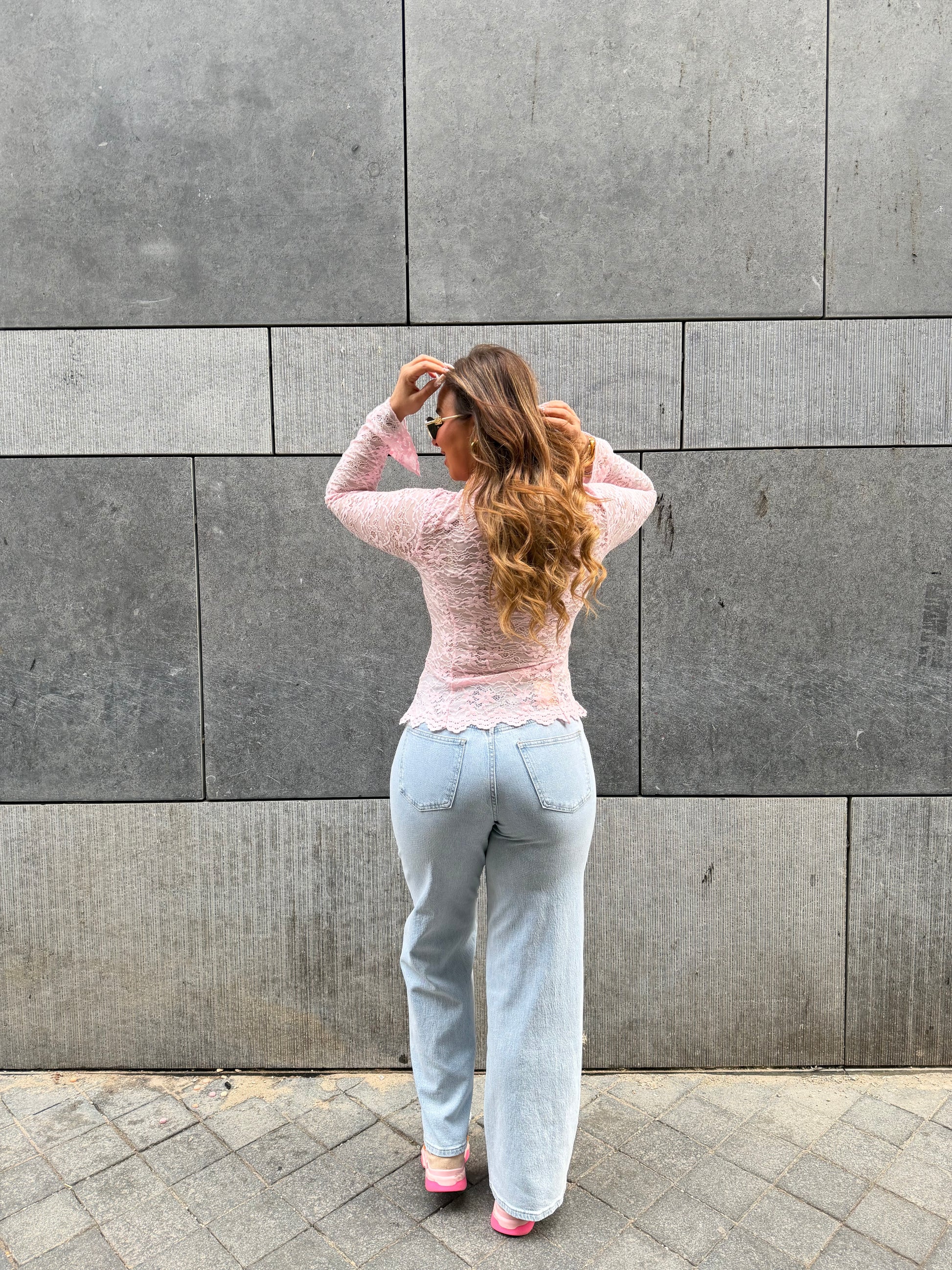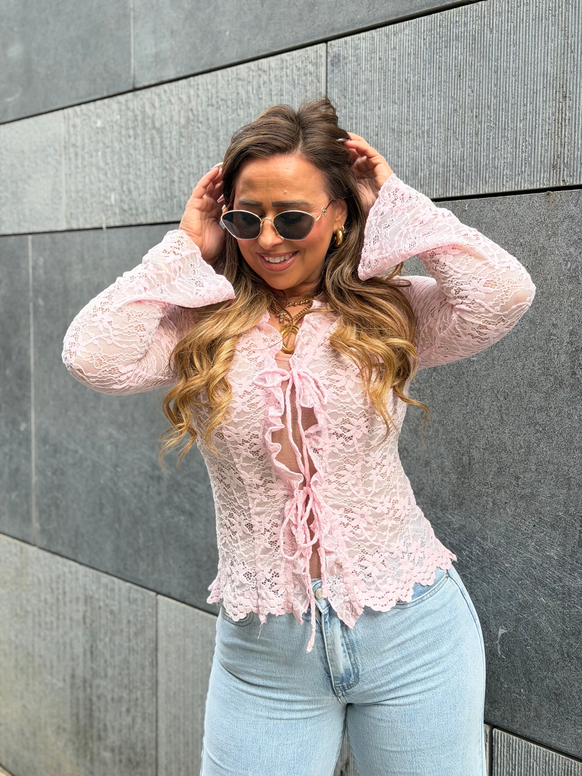 Super mooie lace top met een iets wijduitlopend mouwtje en schattige details. Stretchy model die je aan de voorkant knoopt. Ons model is 1.74m lang en draagt maat m/l.