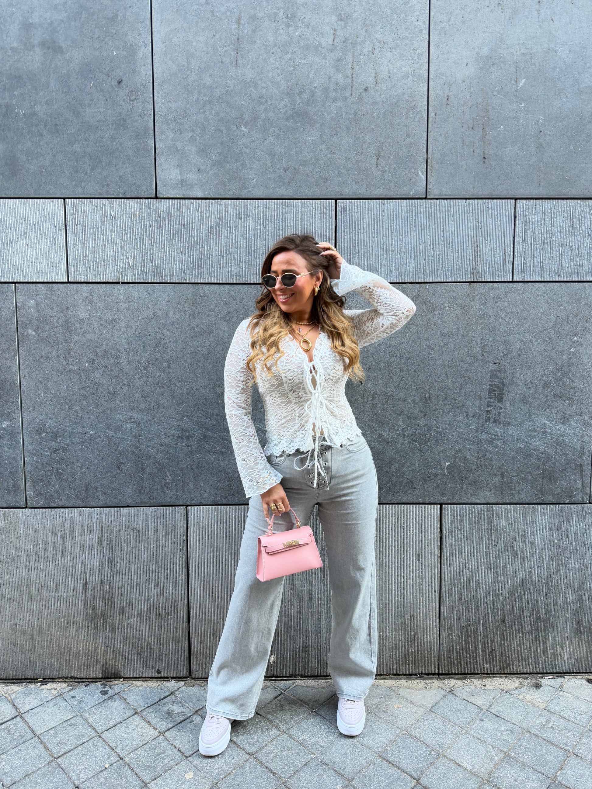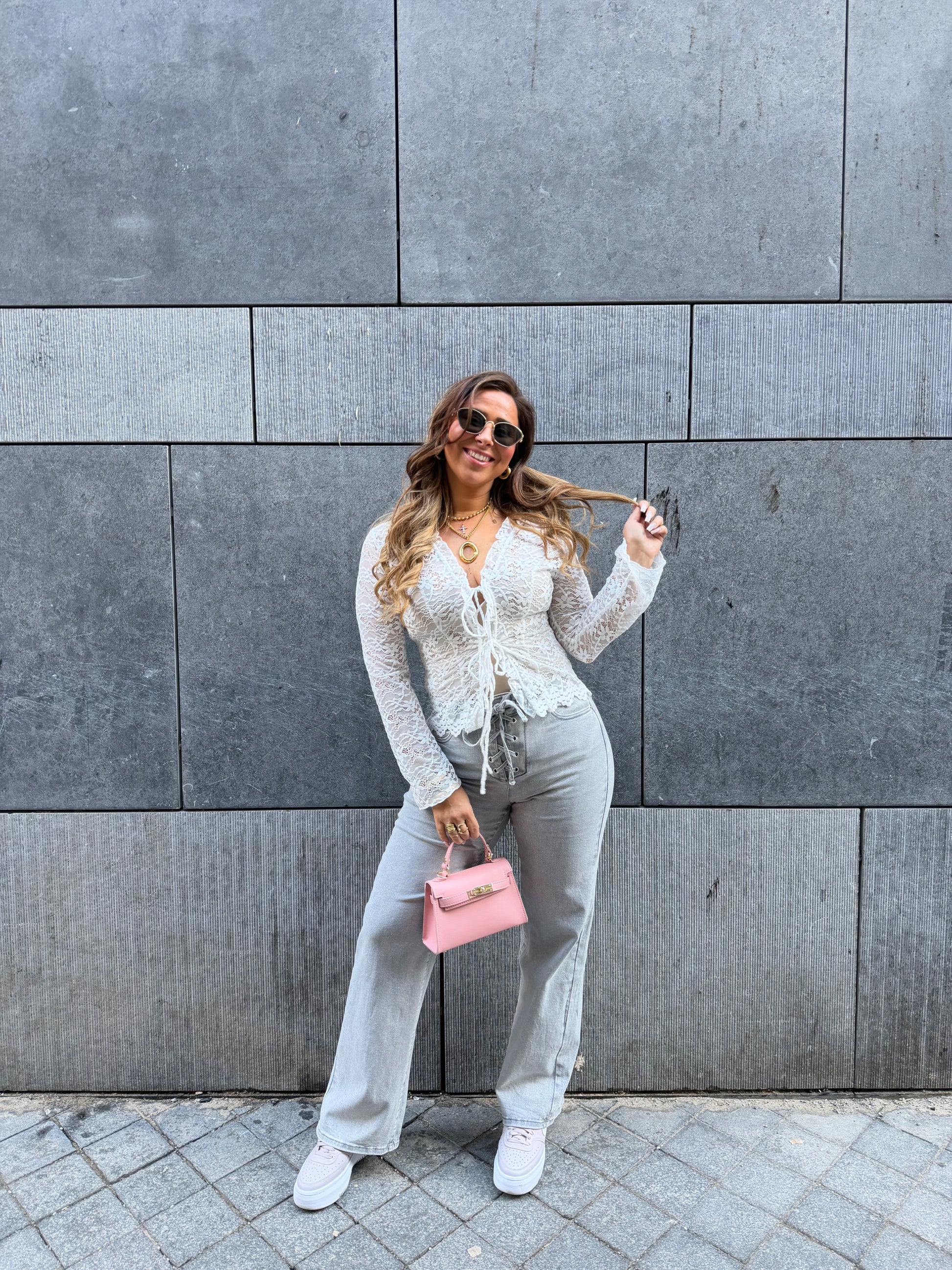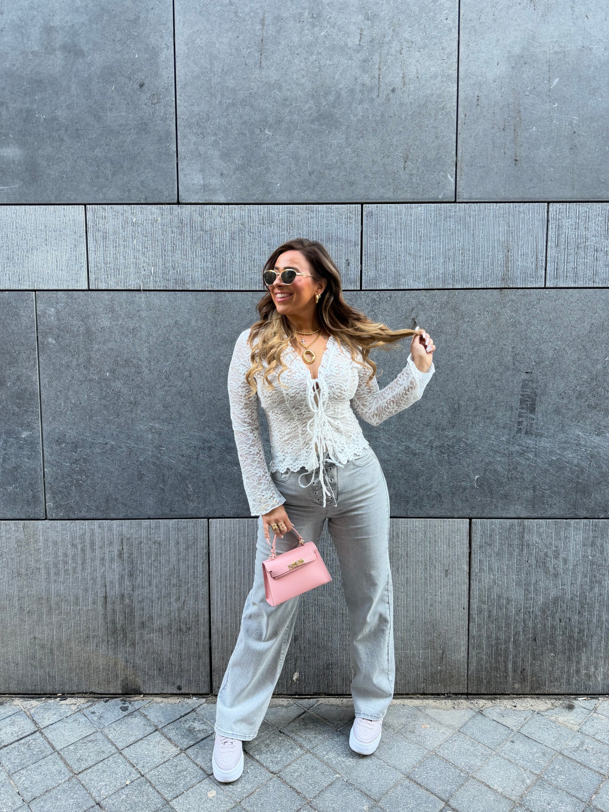 Super mooie lace top met een iets wijduitlopend mouwtje en schattige details. Stretchy model die je aan de voorkant knoopt. Ons model is 1.74m lang en draagt maat m/l.