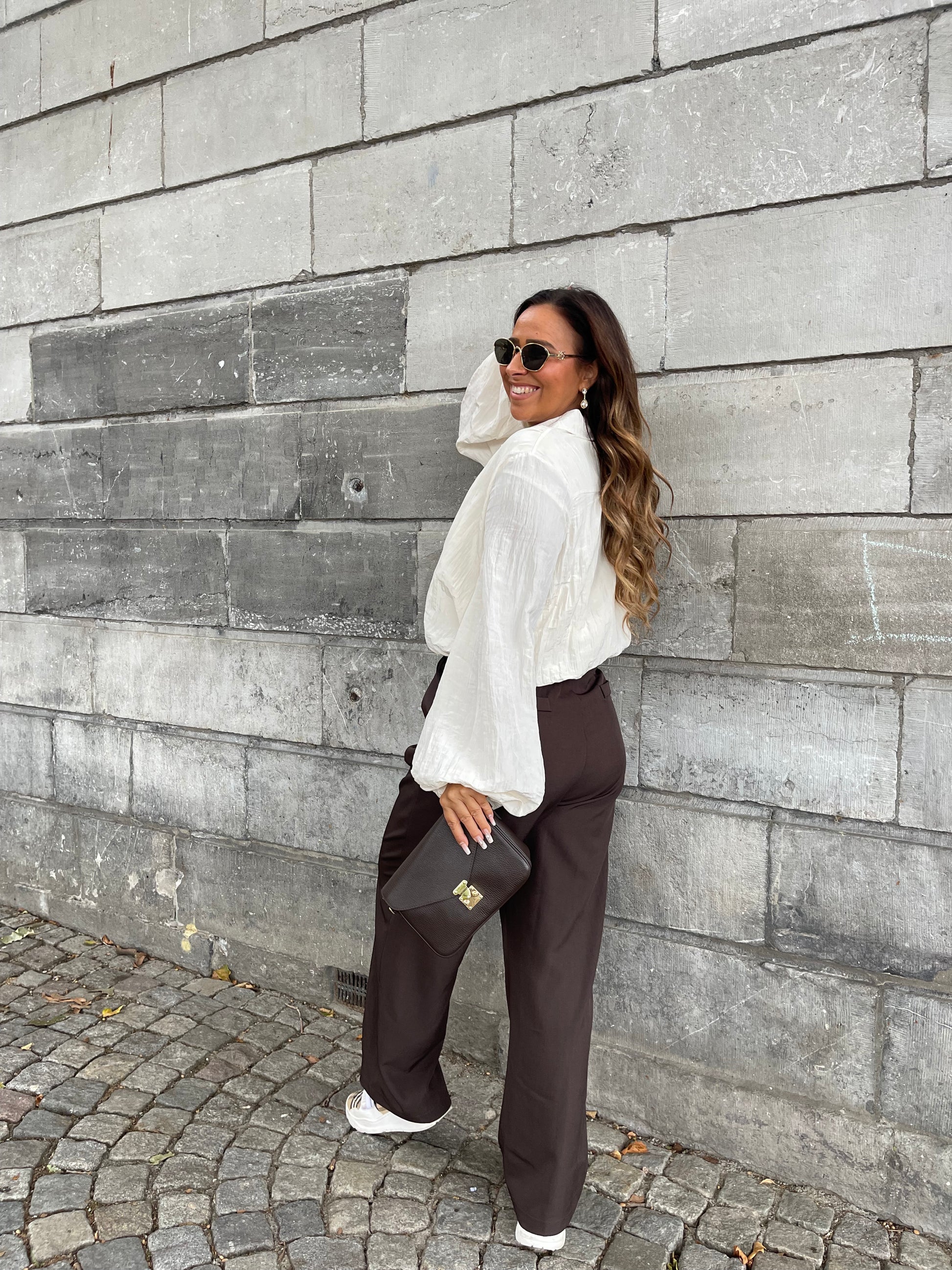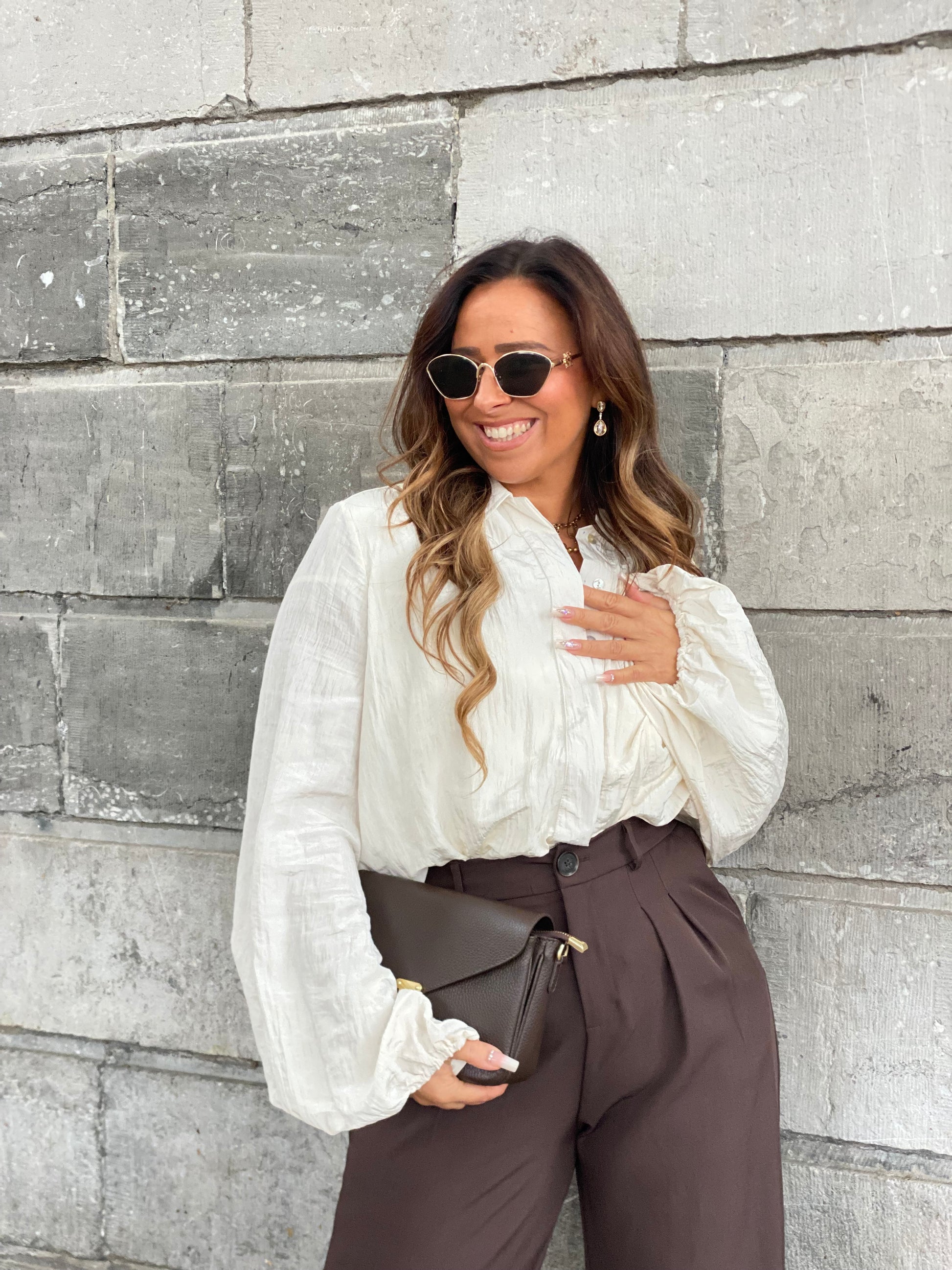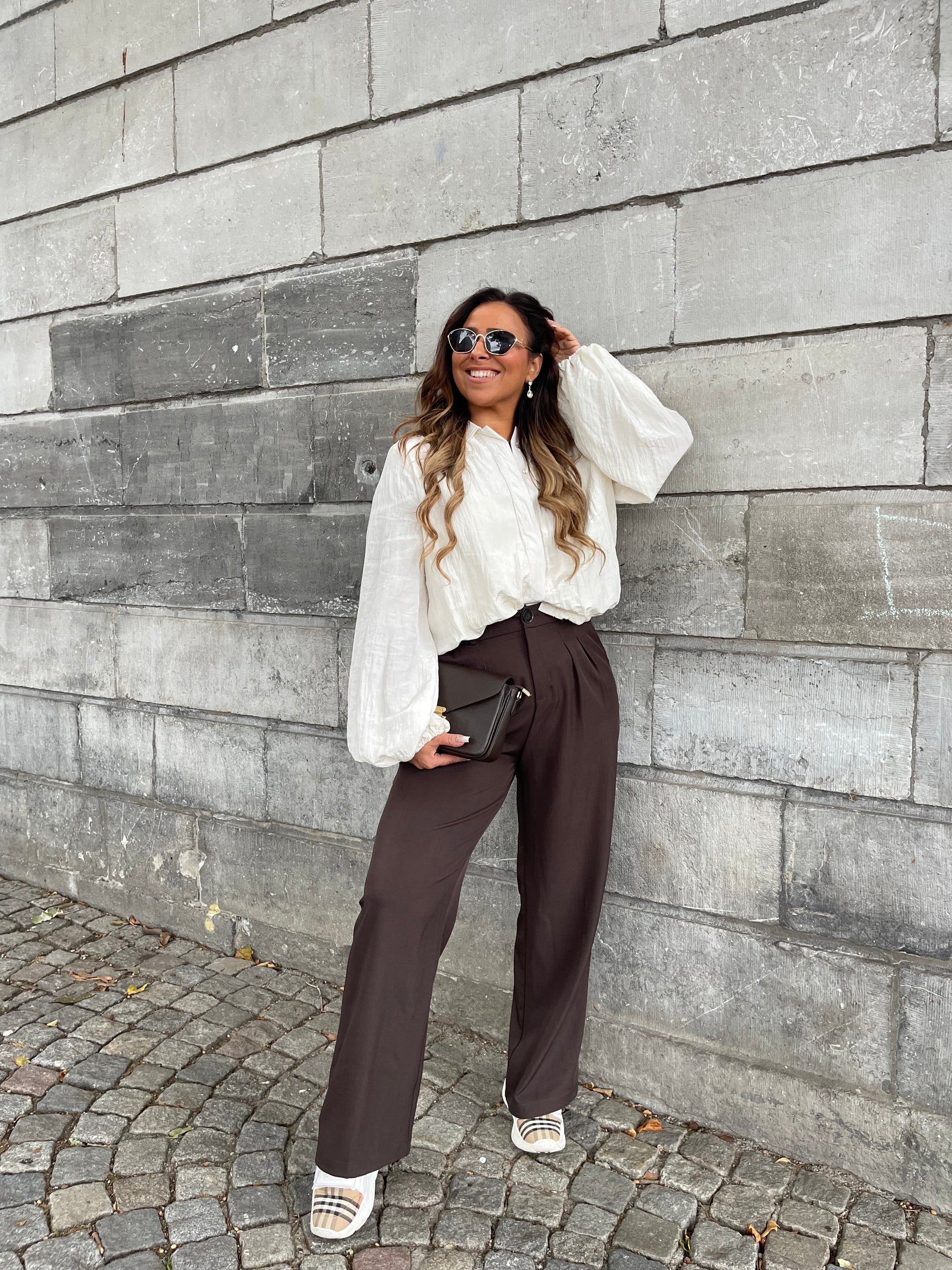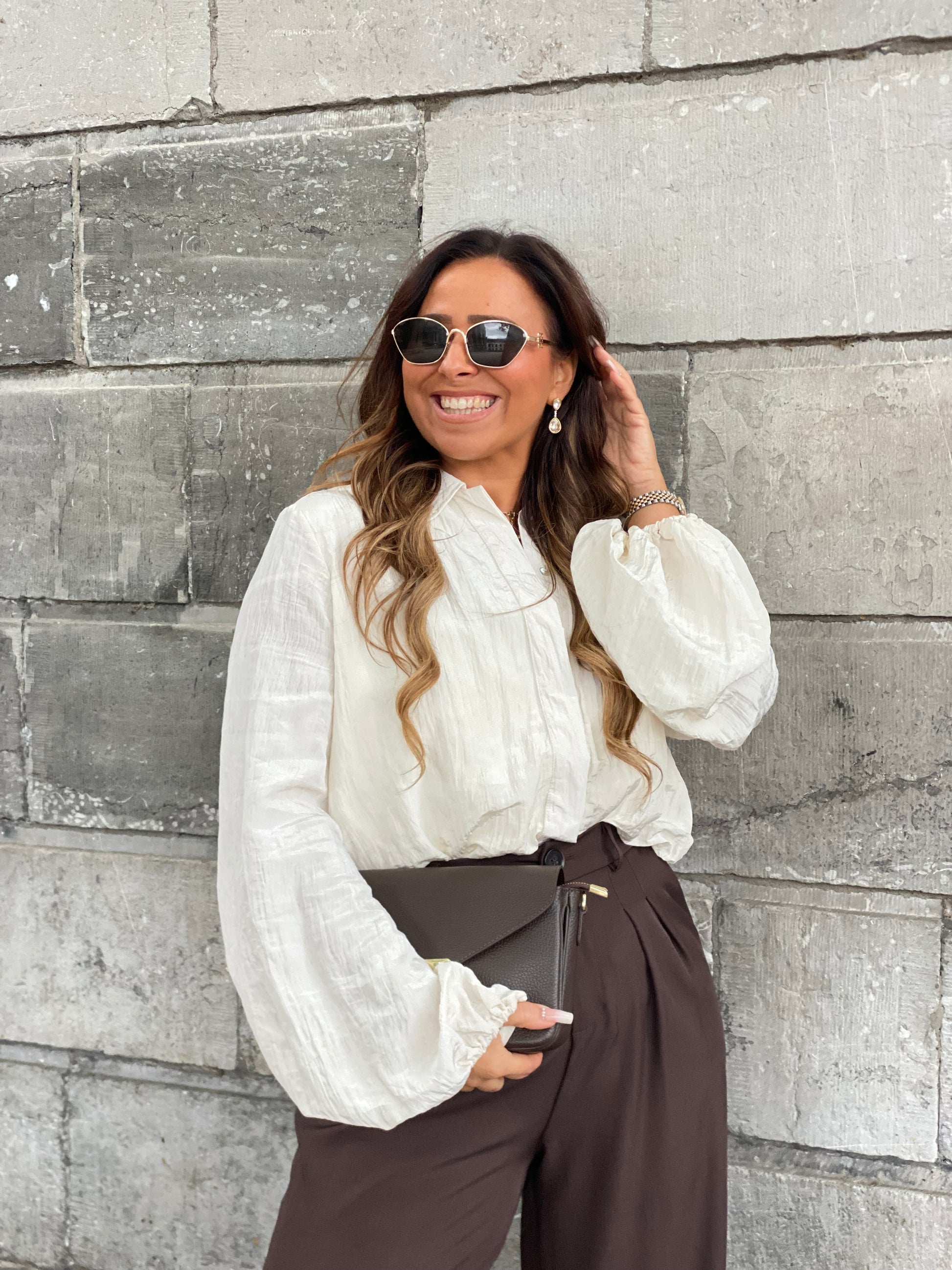 Prachtige oversized cropped bloes die je heel mooi kan combineren op een van onze pantalons of jeans broeken. Ons model is 1.74m lang en draagt maat l.
