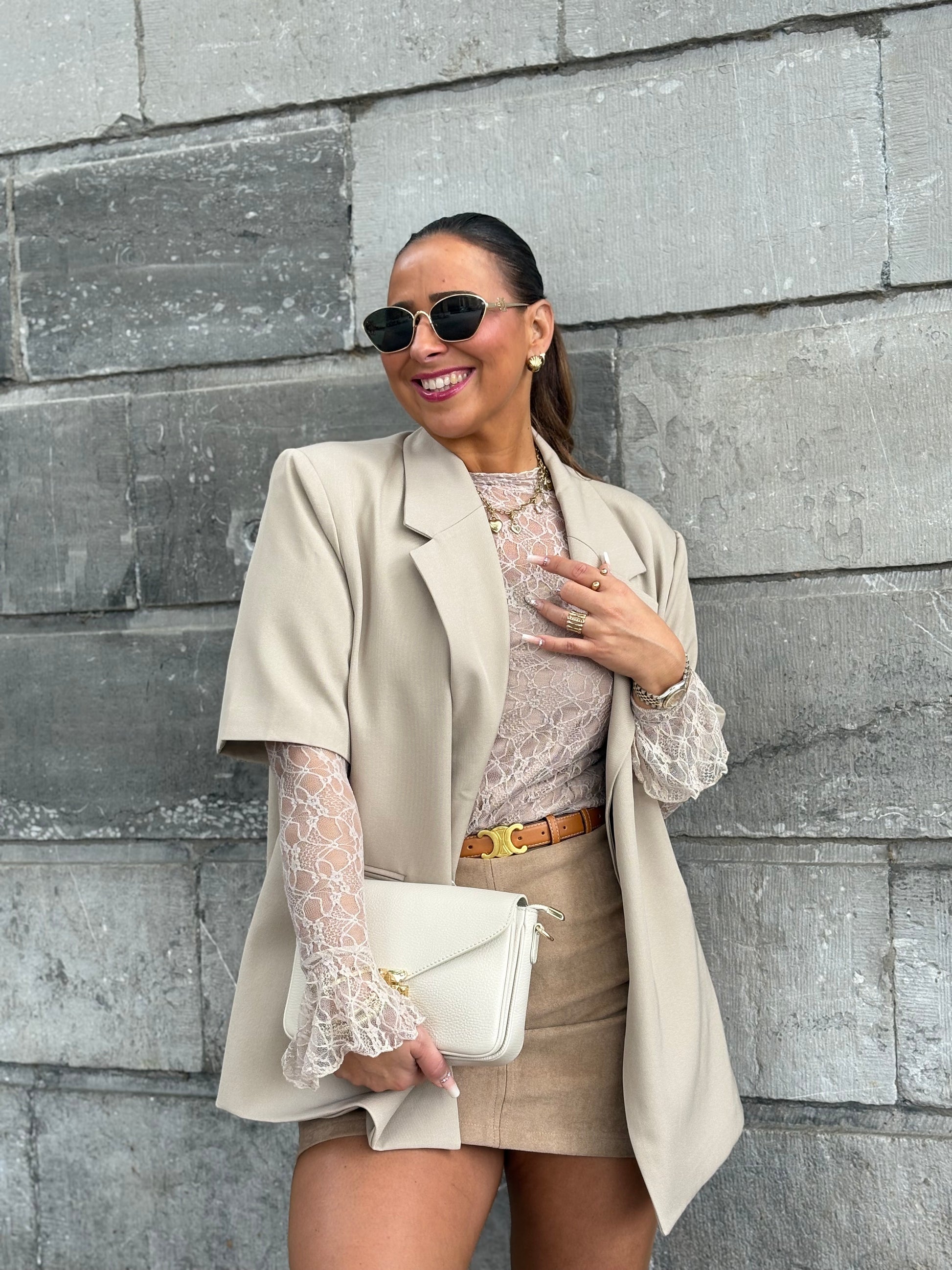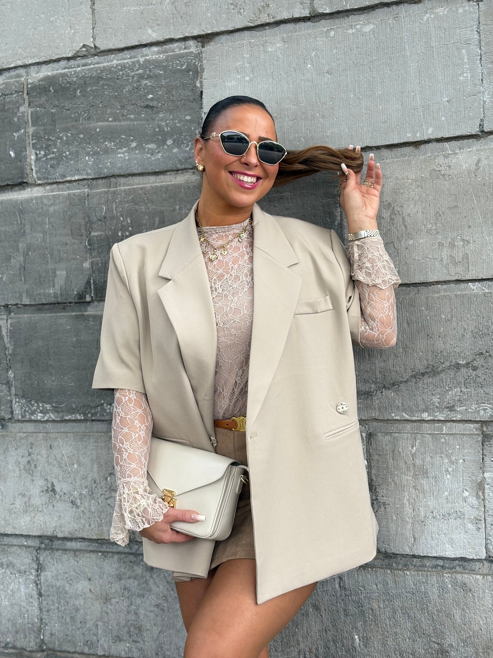 Prachtige oversized blazer die je ook heel mooi over een bloesje kan dragen, maar ook heel mooi op een jeans rokje. Ons model is 1.74m lang en draagt maat s/m.