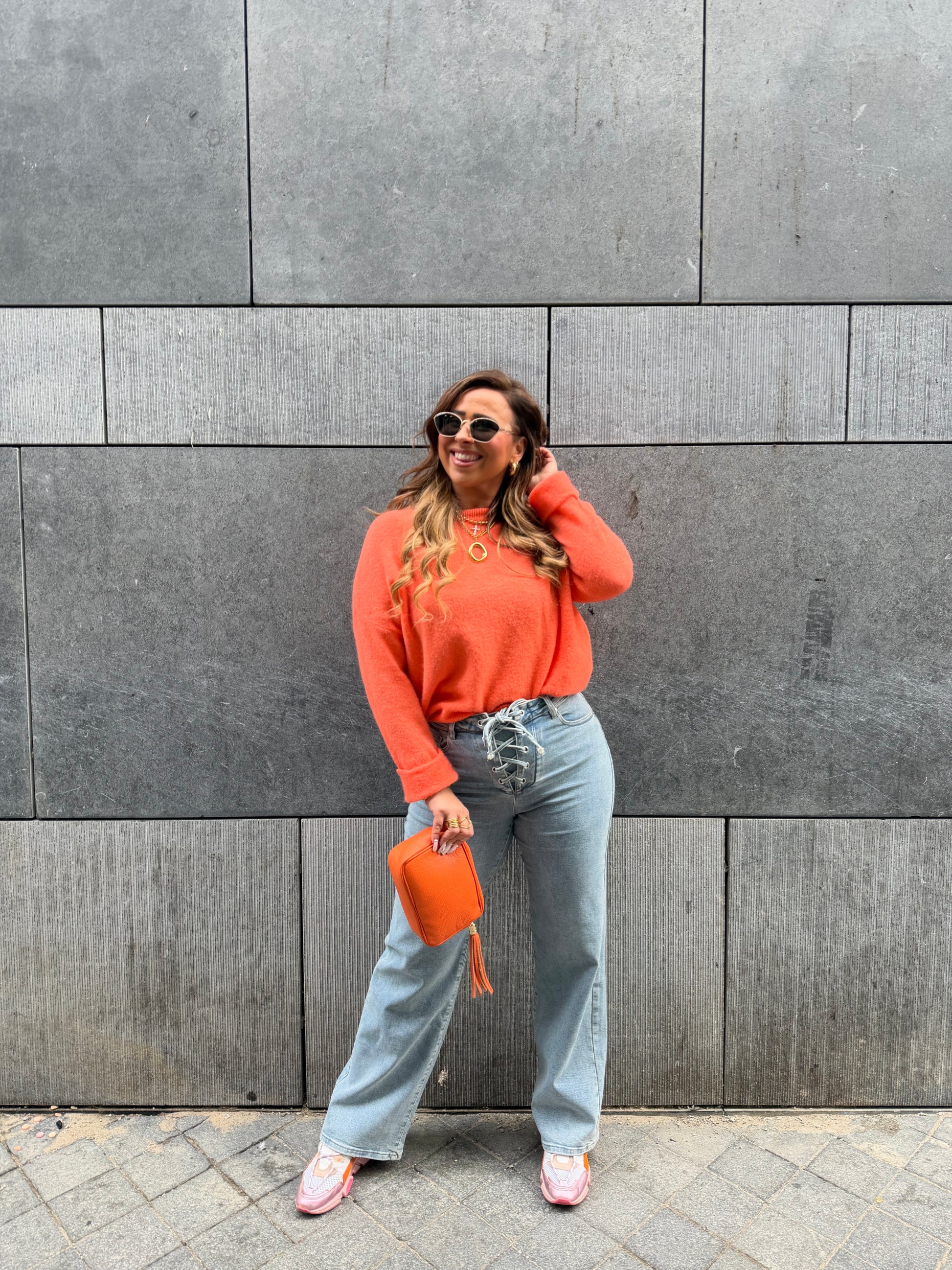 Wide leg jeans, high waist met super veel stretch en prachtige veterdetails ipv knopen. Zit perfect, ons model is 1.74m lang en draagt maat 36. Deze jeans kan je een maatje kleiner bestellen, omdat hij mega veel stretch heeft!